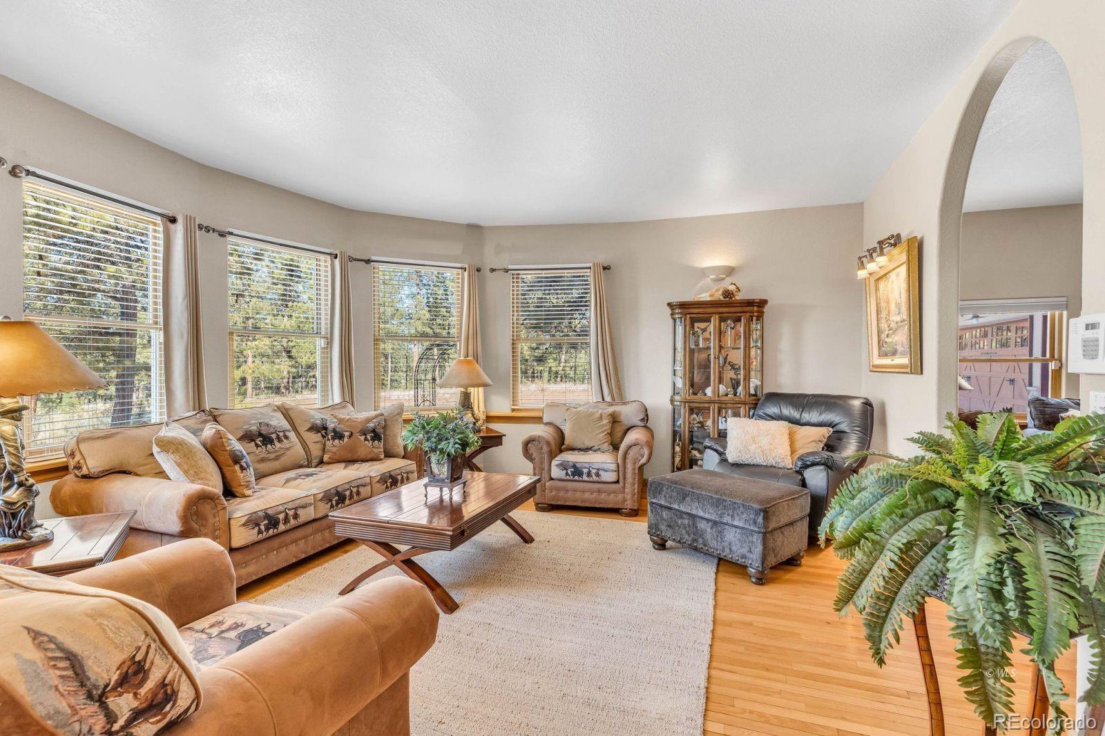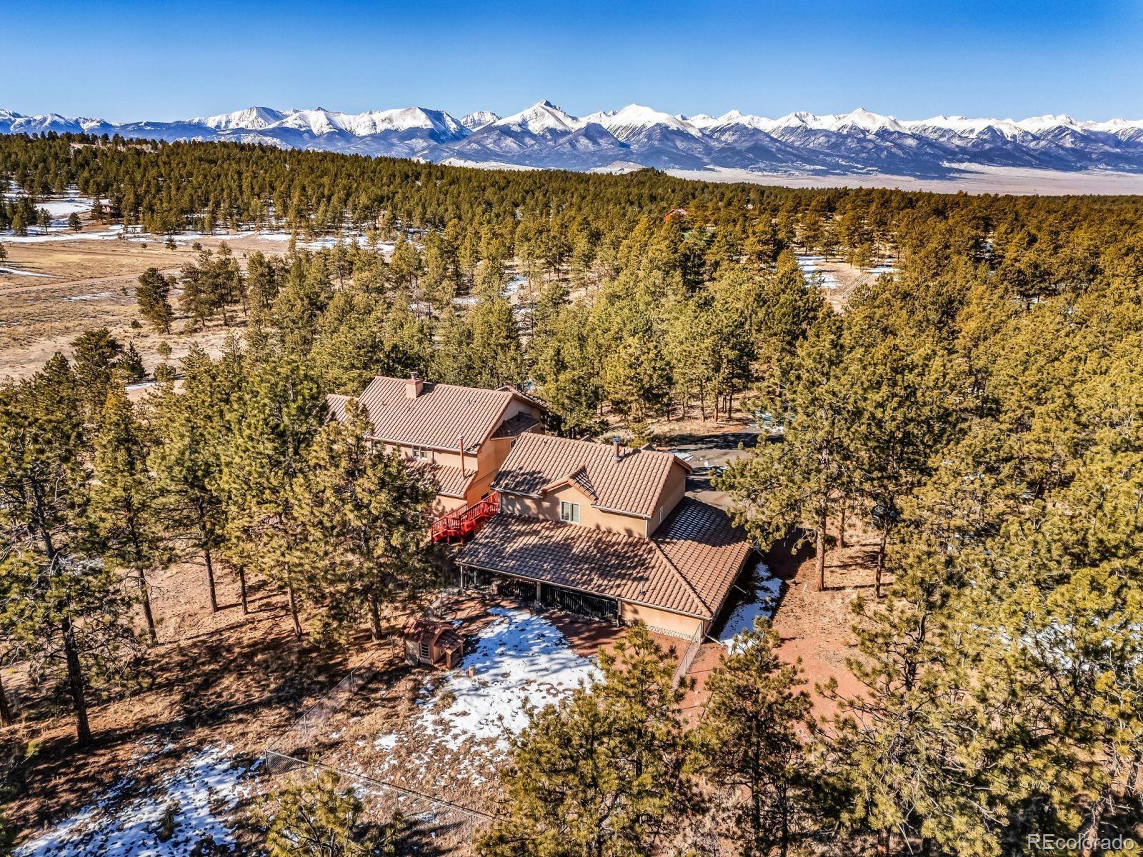 Nestled in the serene beauty of the mountains, this spacious stucco home offers a perfect blend of luxury and natural charm. On 5 wooded acres, this property provides breathtaking Mountain Views that can be enjoyed from multiple vantage points throughout the home. With 3 beautifully appointed bedrooms and 3 bathrooms, this residence is designed to offer comfort and elegance at every turn. The heart if the home is the gorgeous kitchen with sleek quartz countertops, large island, stainless steel appliances, and walk-in pantry, flowing seamlessly into the dining room. Oak hardwood floors are featured throughout. The media room offers an entertainment center, while the living room showcases mountain views. The primary suite offers bright windows with views and access to a private deck. Outside, a 4-car heated garage includes animal care spaces with a covered dog run, wash station, and indoor kennels. Above the garage is additional living space well suited for a home office or guests. A 20 x 50 RV garage with electric power is also included. Hiking, biking, and hunting await at the nearby State Wildlife Area.