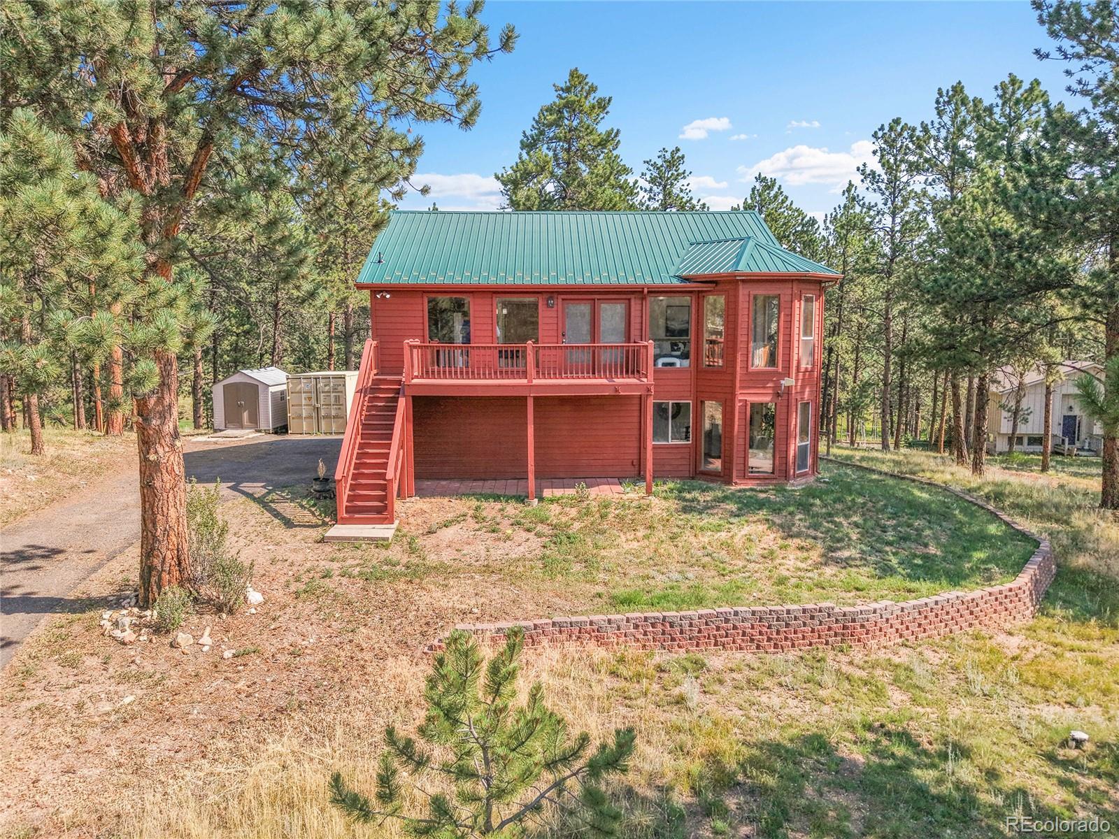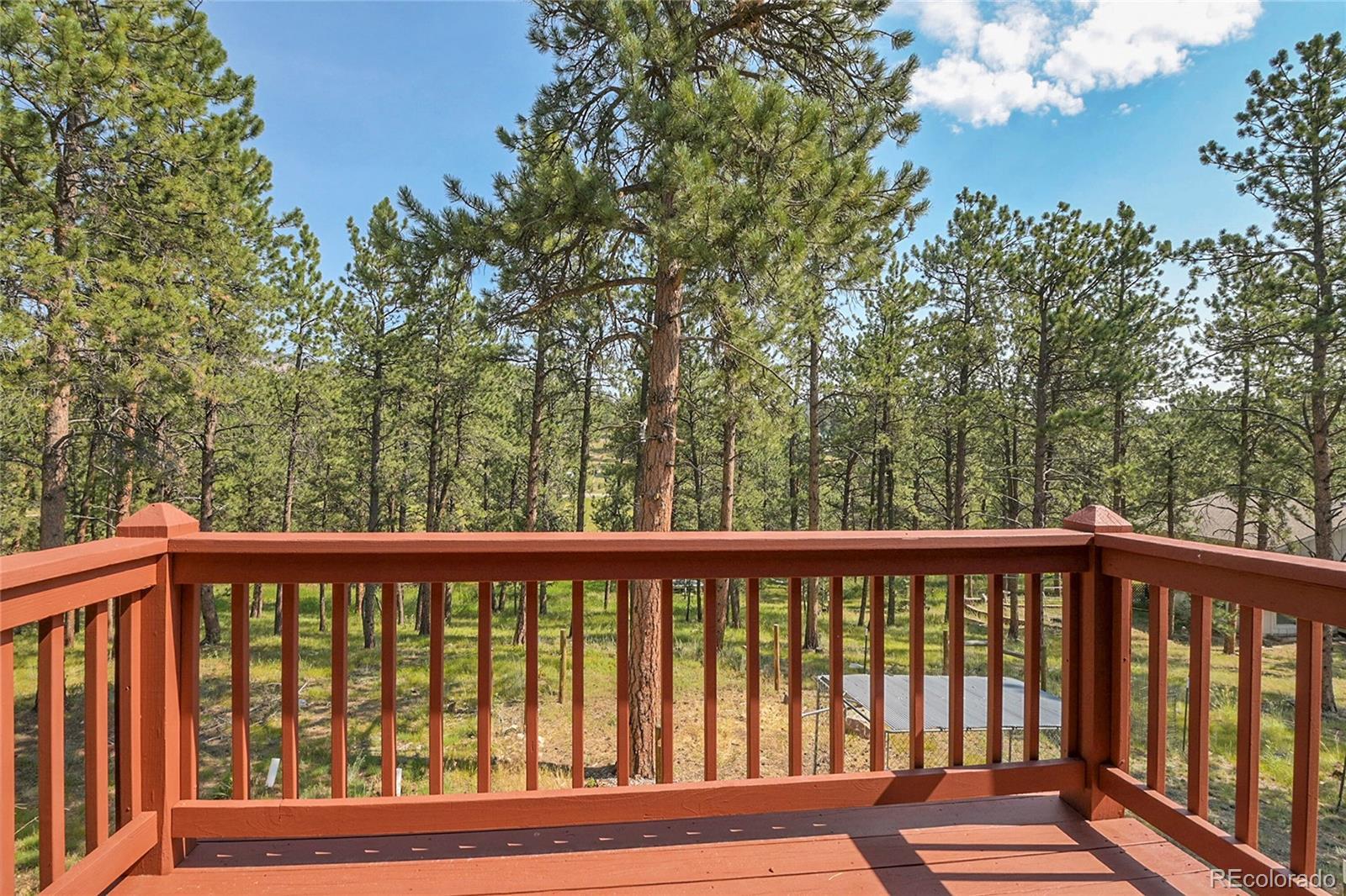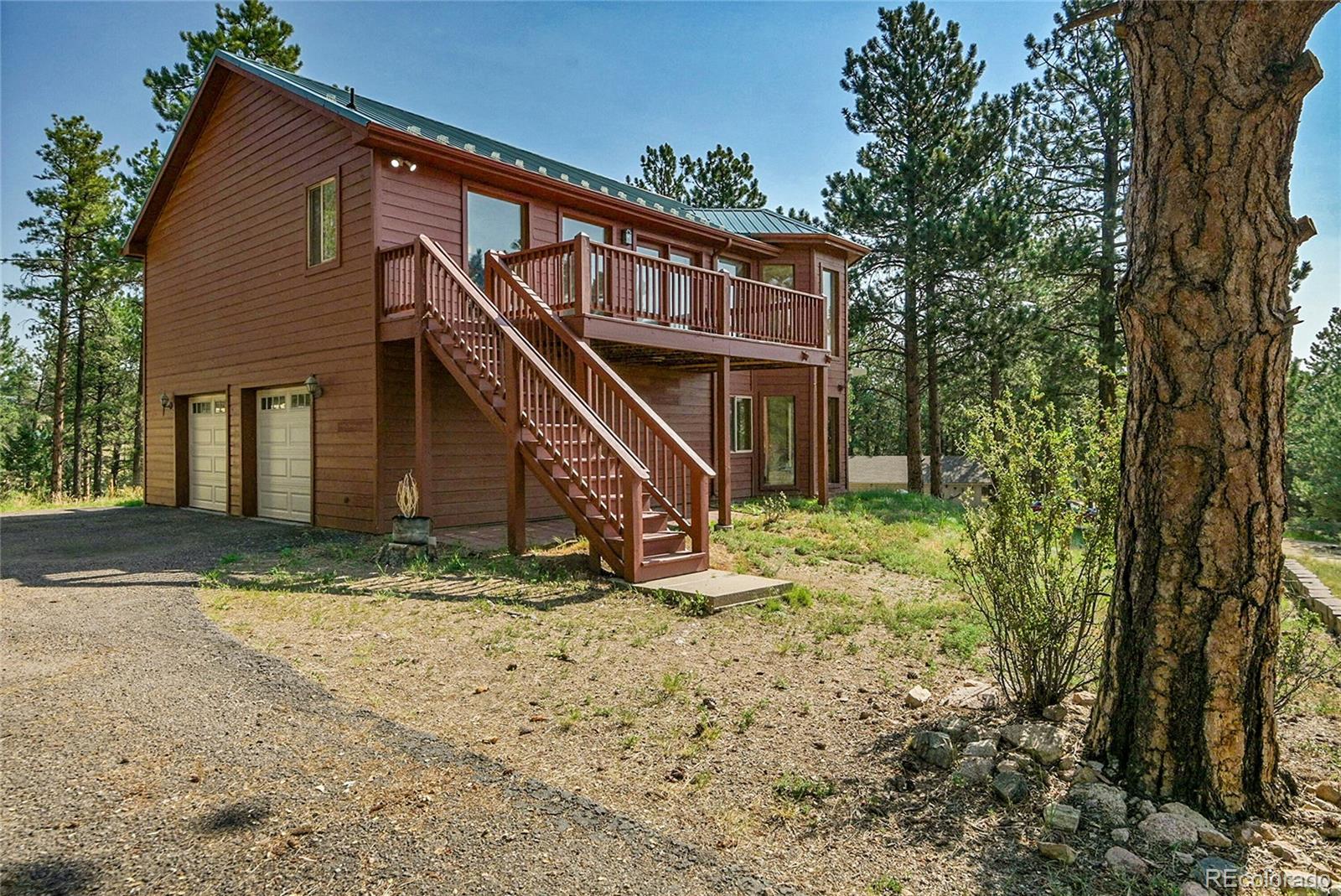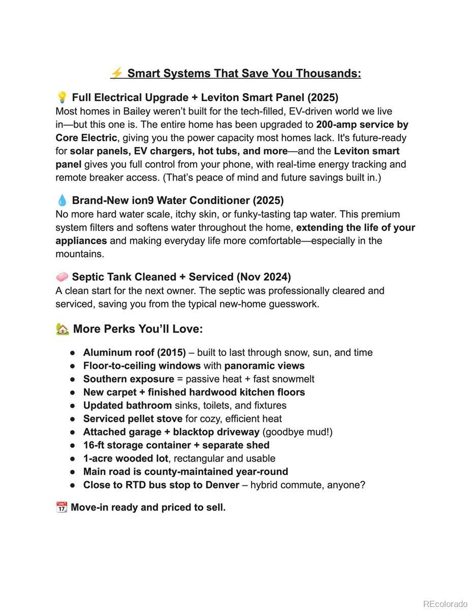 MOTIVATED SELLER! Tucked into the serene foothills of Bailey, in the beloved Burland Ranchettes, this mountain home is more than move-in ready—it’s a sanctuary. With 3 bedrooms, 2 full bathrooms, and a full acre of wooded beauty, it offers space to breathe, dream, and settle into the rhythm of nature. Southern light pours through floor-to-ceiling windows, painting the interior with golden warmth and framing sweeping panoramic views. Open and inviting floor plan offers you and your guests the ideal entertaining space, along with a large deck to grill out and watch those beautiful Colorado sunsets. Huge primary suite with massive walk in closet and private deck for viewing into your wooded acre lot. Two bedrooms are located on the lower level with full bathroom; lots of natural light and large closets. Home includes an oversized 2 car garage with tons of room for storing toys, vehicles and gear! Beneath its durable aluminum roof (2015), every modern comfort has been quietly taken care of: a full 200-amp electrical upgrade with a Leviton smart panel (2025) and a brand-new ion9 water conditioner- installed this year. The septic system was serviced in late 2024, offering the gift of peace of mind. Inside, you’ll find soft new carpet underfoot, refinished hardwood in the kitchen, updated fixtures, and the gentle glow of a pellet stove in the secondary bedroom. Outside, a blacktop driveway, attached garage, storage shed, and 16-ft container make everyday living seamless. With a county-maintained road and nearby RTD bus stop, this is a rare blend of mountain stillness and city connection. Minutes from 285 makes for a quick commute to the city, minutes from downtown Bailey and relaxing on the river at one of the local restaurants. Make this beautiful Bailey house your home! The hard work is already done. What’s left is beauty, simplicity, and the joy of coming home. Schedule your showing today!!