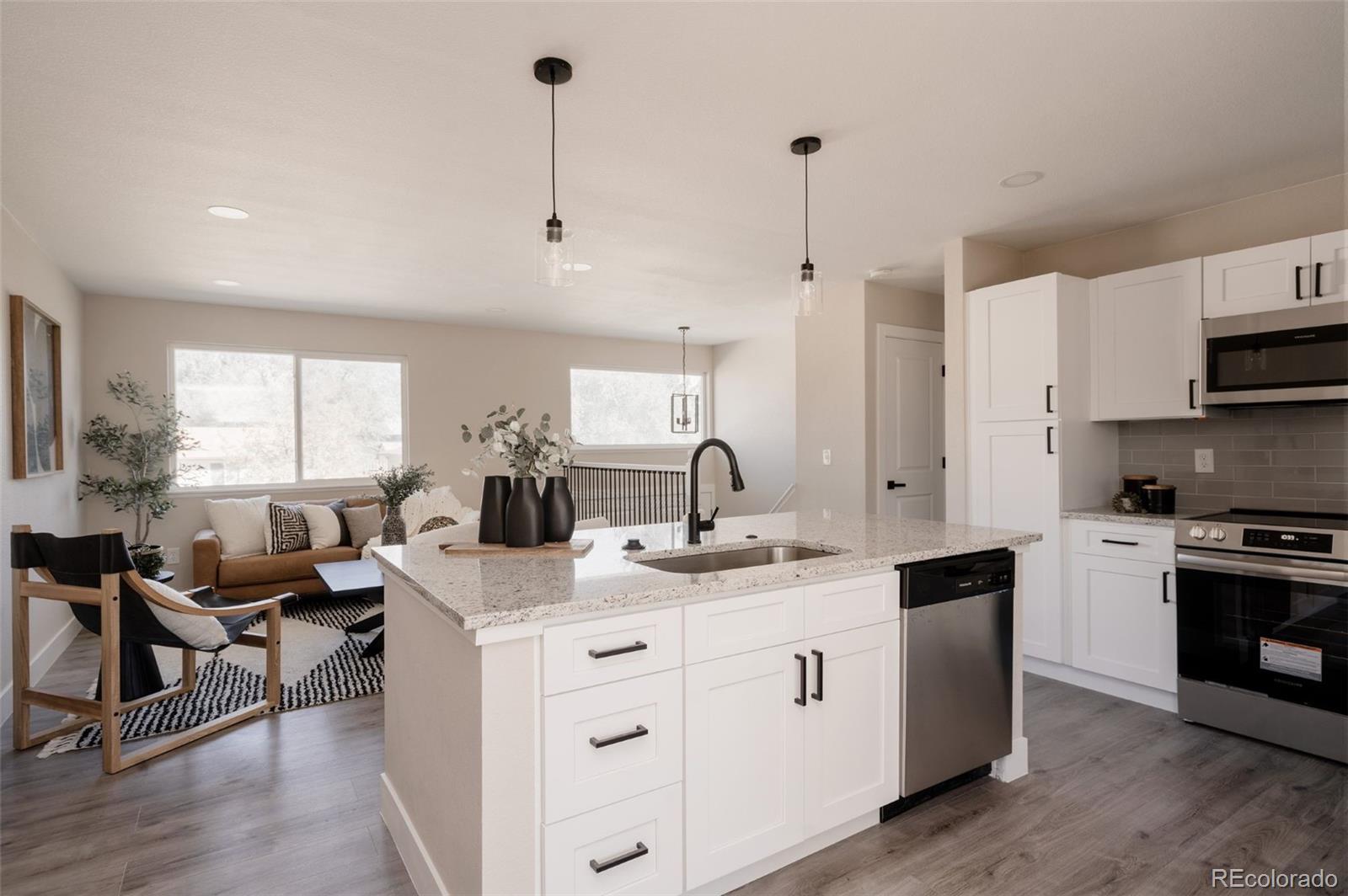 Nestled in the shadow of North Table Mountain awaits this seamlessly renovated four-bedroom, two-bathroom home, offering the perfect blend of modern comfort, functional space, and Colorado charm. With mountain views from both the kitchen and the refinished deck in the backyard, this home is perfect for day dreaming during any season. With a brand new oversized driveway, new furnace, new AC, new roof, and new sprinkler system, you won't have to worry about updating this home for over a decade! Step inside to find a bright, open-concept floor plan filled with natural light and stylish finishes. The gourmet kitchen features quartz countertops, stainless steel appliances, new cabinetry, and a large kitchen island. The living and dining areas flow seamlessly, offering great space for gatherings or quiet evenings at home. Both bathrooms have been fully updated with contemporary tile, vanities, and fixtures. The home boasts four spacious bedrooms, ample closet space, and all new LVP flooring. A finished lower level adds even more versatile living space—perfect for a media room, home office, or guest suite.Outside, enjoy a spacious backyard with room to relax, garden, or entertain. The property also features a two-car garage and sits just minutes from parks, trails, top-rated schools, and downtown Golden. Don’t miss this opportunity to own a next to brand-new home in one of Golden’s most sought-after communities. Schedule your private tour today!