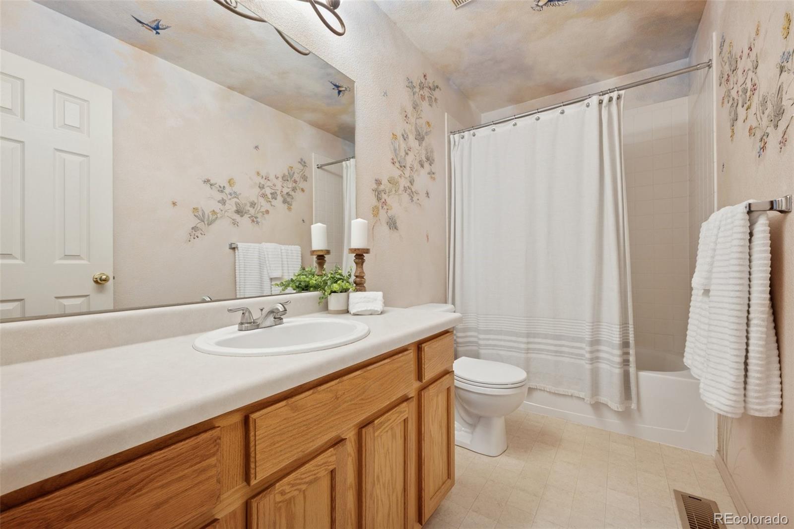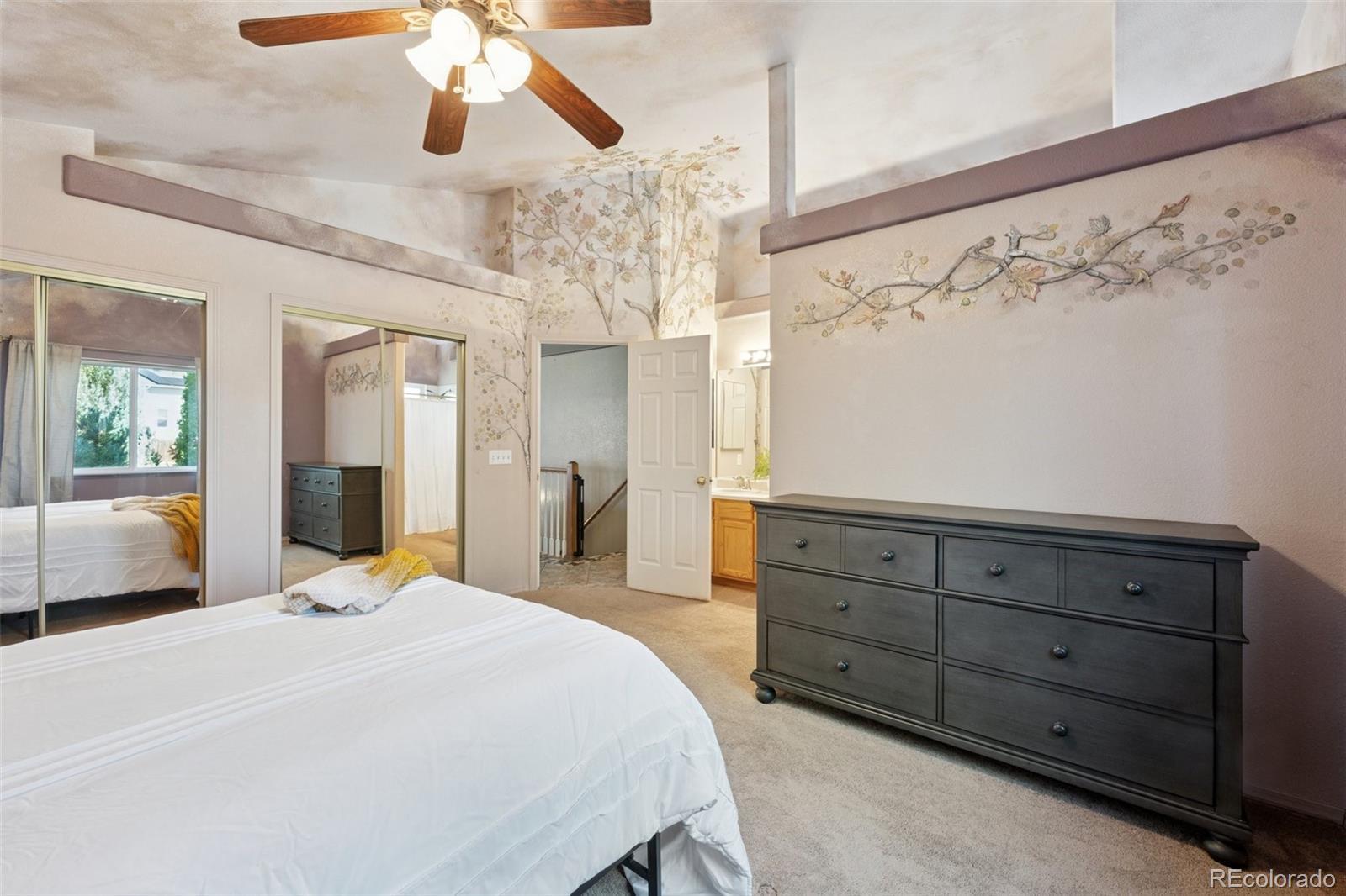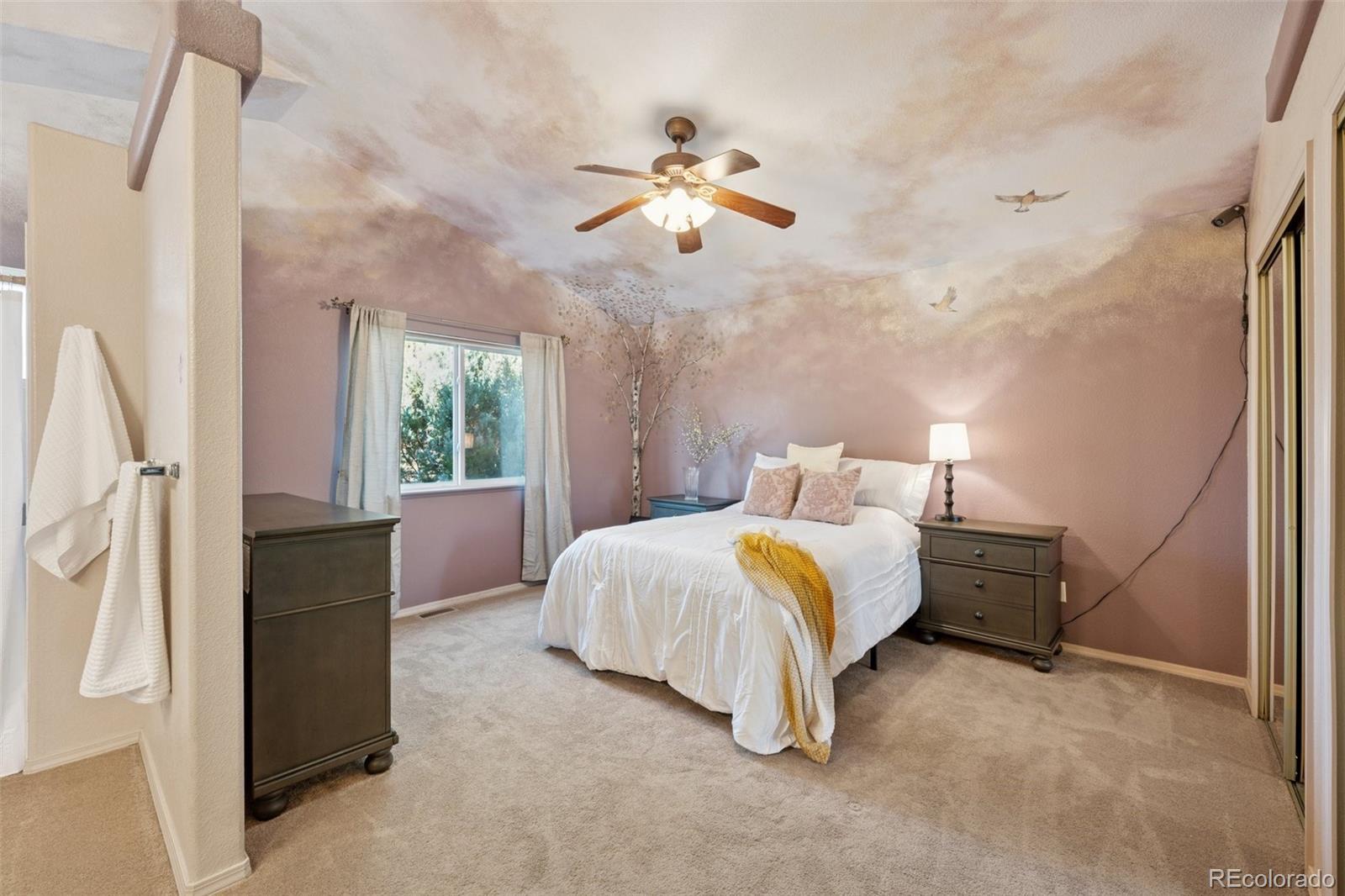 Nestled on a quiet cul-de-sac in the desirable Countryside neighborhood, this residence combines timeless style, thoughtful updates, and outdoor living. A welcoming formal sitting room with hardwood flooring can easily serve as a dining space, while the spacious living room showcases a cozy fireplace with a custom tile surround. The kitchen offers bar seating, newer paint, and seamless flow through double French doors to the large covered patio. The primary suite provides a private retreat with dual vanities, a separate walk-in shower, and generous double closets. Three additional bedrooms, a private office with glass doors, and a finished basement expand the home’s flexibility for both work and play. Throughout the interior, professional artwork and murals add distinctive character, setting this home apart with a custom touch. Outdoors, mature landscaping frames a fully fenced yard with two versatile sheds equipped with electricity. A new roof installed in 2025, along with a water softener and filter, provide lasting peace of mind, while the attached two-car garage adds everyday convenience. With no HOA and quick access to parks, schools, military bases, and the I-25 corridor, this home offers both comfort and connectivity in a prime Colorado location.