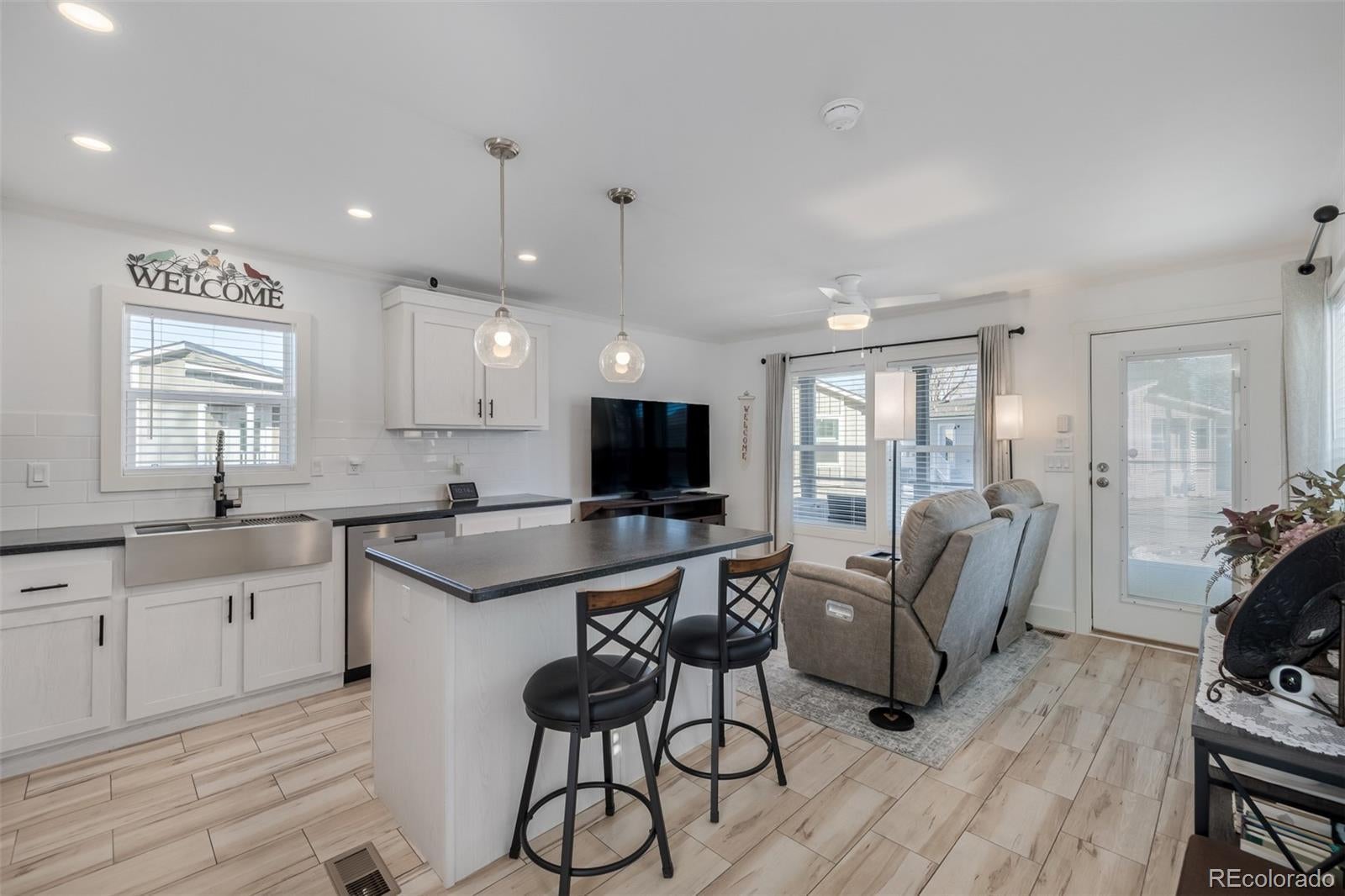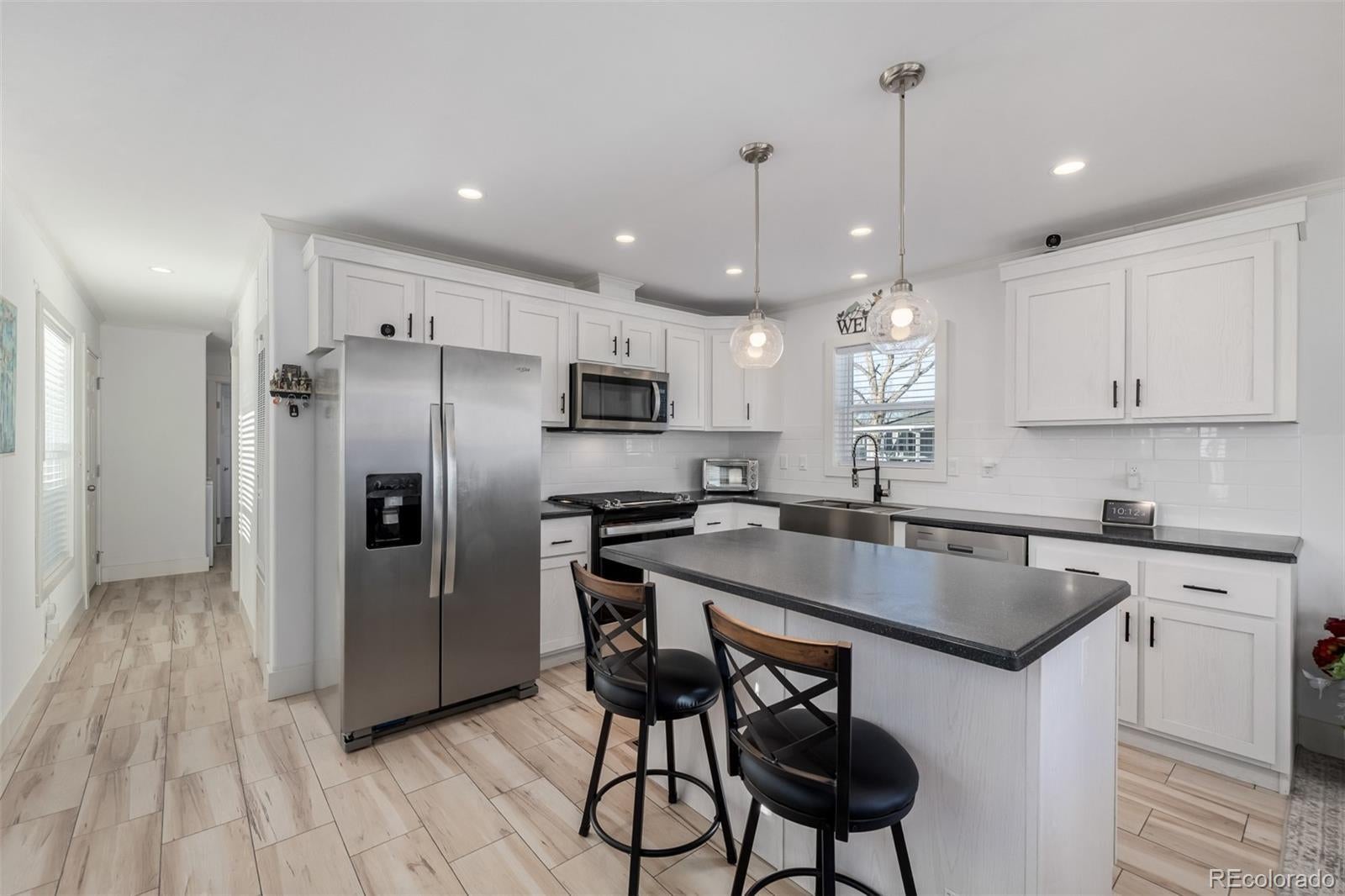 Welcome to this gorgeous home in Ridgeline at River Run community! This beautifully upgraded 2-bedroom, 2-bath home offers modern finishes, thoughtful design, and effortless main-floor living. The stunning kitchen features gorgeous countertops, a tiled backsplash, and a contemporary stainless-steel farmhouse sink with accessories. All stainless appliances are included, and the extended kitchen island provides additional seating—perfect for casual dining or entertaining. Luxury vinyl flooring extends throughout the main living areas, offering durability and easy maintenance. The spacious primary bedroom includes a generous sized closet and a private en suite with an oversized vanity, abundant counter space, cabinet storage, and an elegant LED backlit mirror. The secondary bathroom mirrors these upgrades with a large vanity, ample storage, and an LED backlit mirror as well. Convenience continues with a main-floor laundry area complete with overhead cabinetry. Relax and unwind on your covered front patio—ideal for enjoying Colorado’s beautiful evenings. Exterior features include tasteful xeriscaping, planter accents, a private side access door, and two car carport. The Ridgeline at River Run community offers wonderful amenities including a swimming pool, clubhouse, and billiards, with exciting additions coming soon: an updated clubhouse, dog park, sauna, social card games, and an internet café. Enjoy a vibrant community atmosphere with potlucks, holiday celebrations, social clubs, and craft activities. Divinely located with quick access to the Front Range for hiking or outdoor adventures, plus convenient proximity to shopping, dining, healthcare, the Broken Tee Golf Course, Mary Carter Greenway Trail, and River Point Shopping Center. This exceptional home blends comfort, style, and convenience.