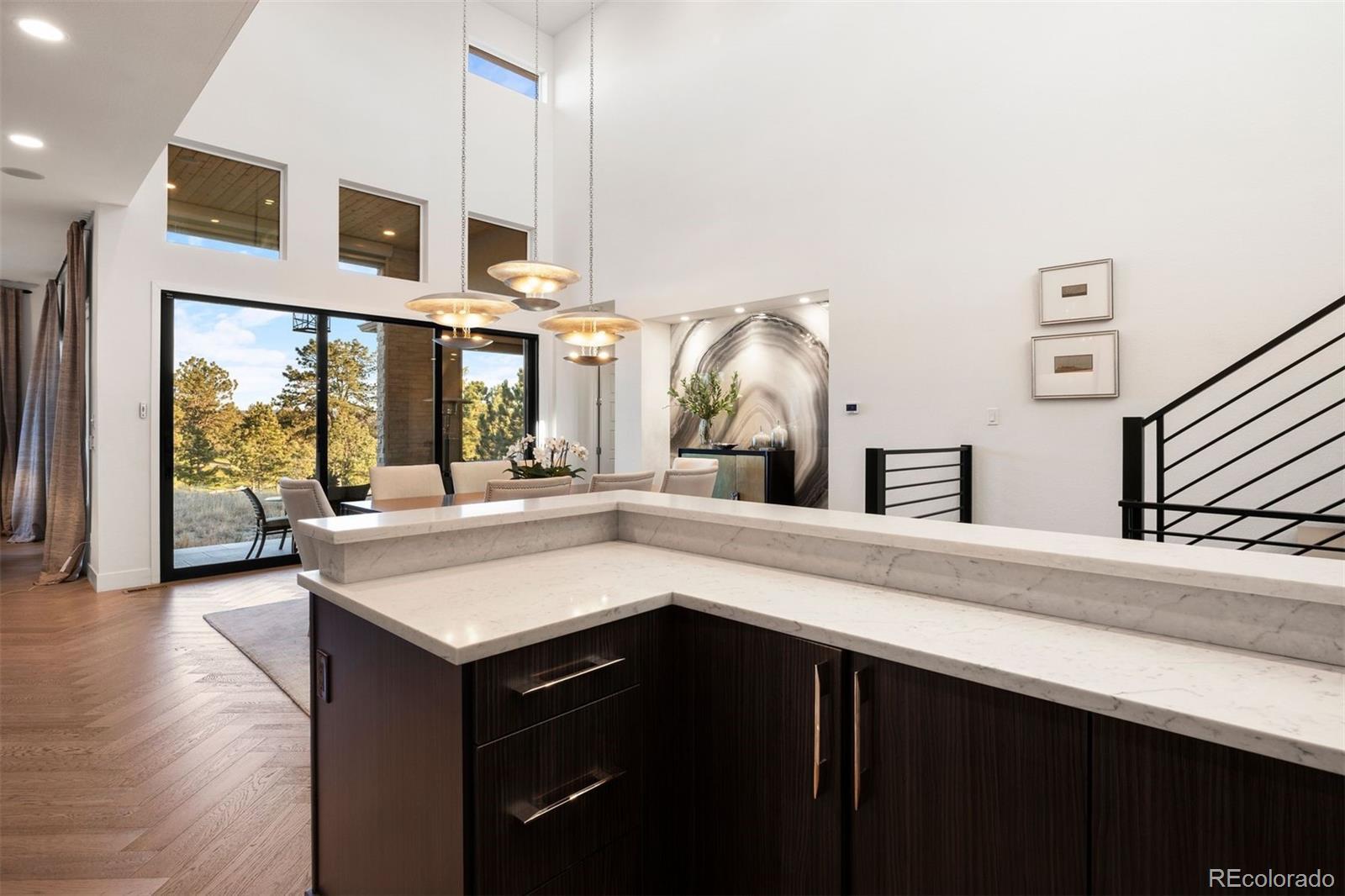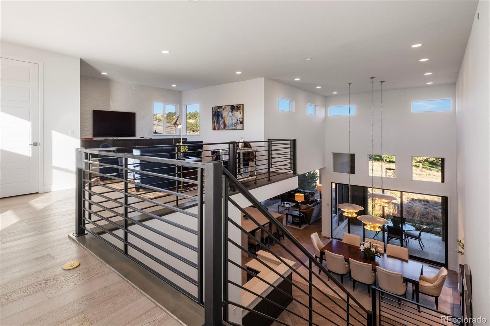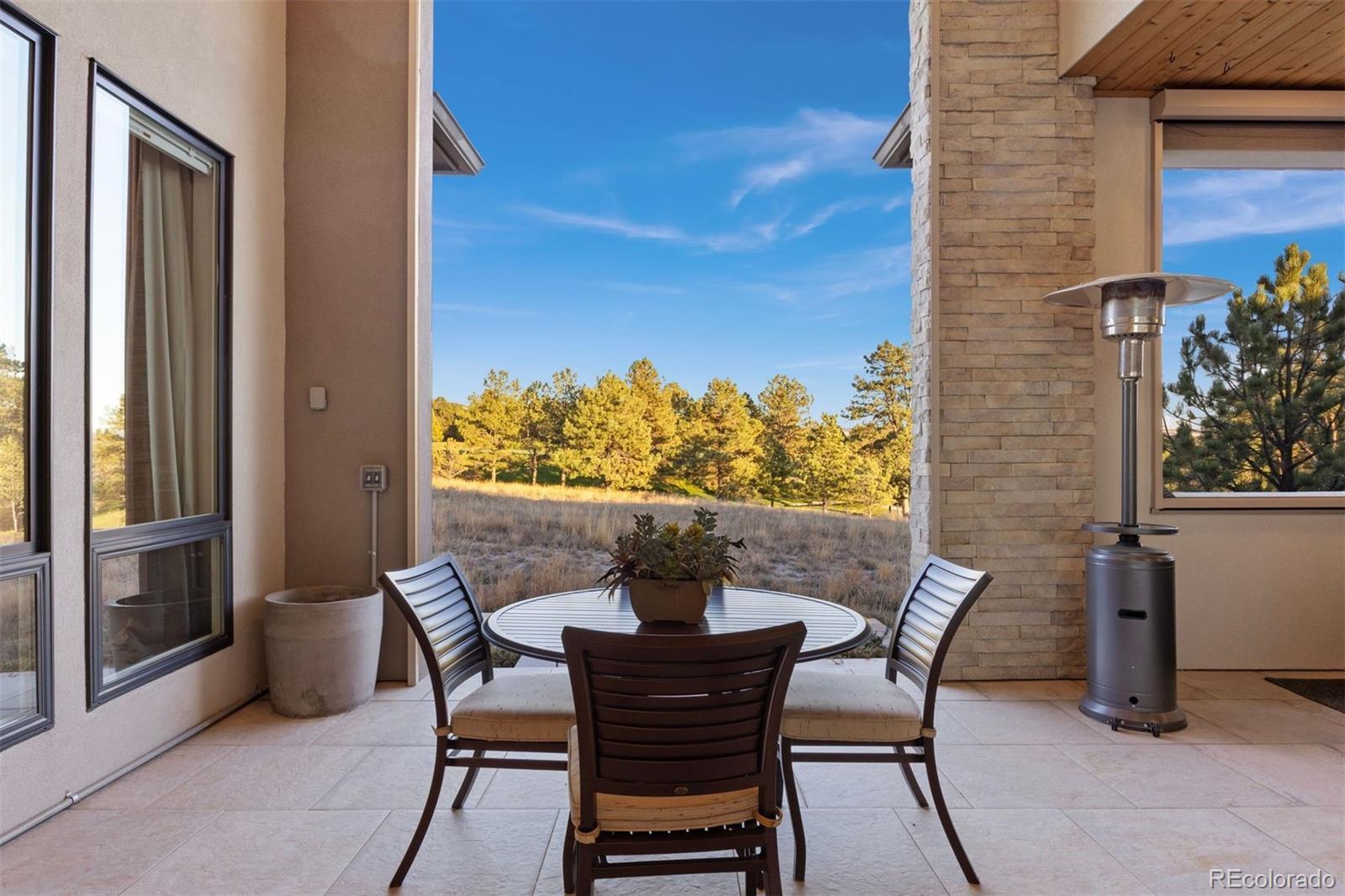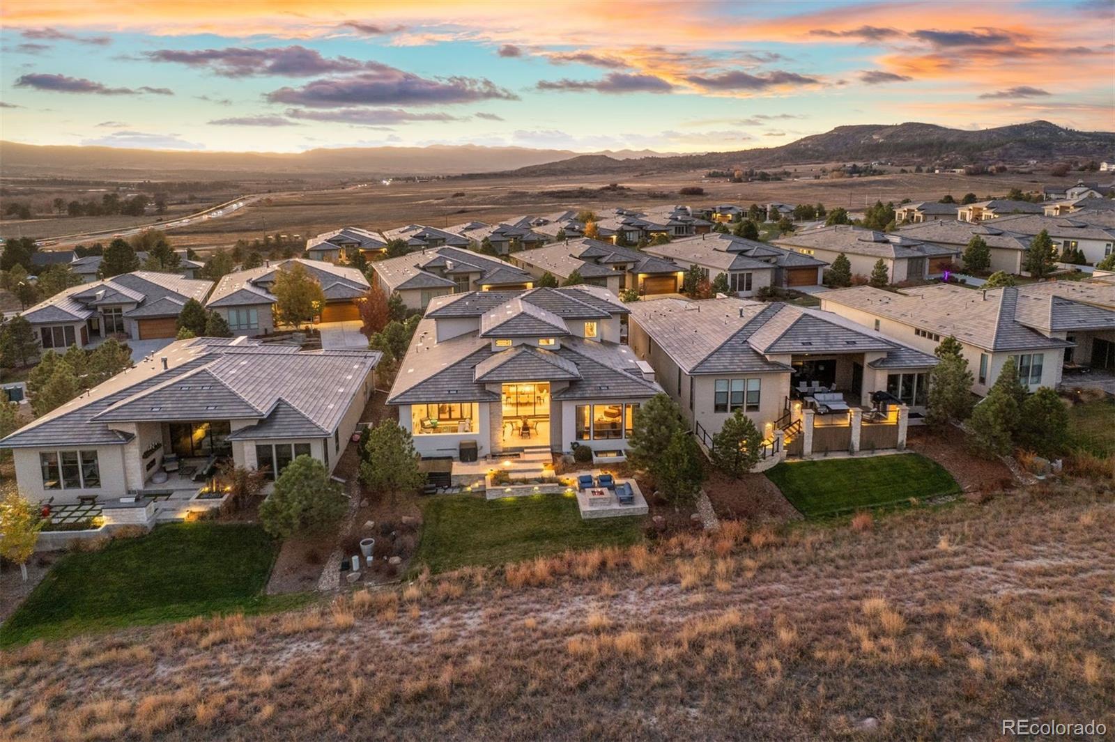 Perfectly positioned above the 4th green and 5th tee box of The Castle Pines Golf Club, this Mountain Modern Patio Home captures the essence of modern, low-maintenance living in one of Colorado’s most sought-after gated communities. A former model home, this residence showcases high-end finishes, elevated design, and seamless indoor-outdoor living. Throughout the main level, herringbone-patterned wood floors and soaring ceilings set a sophisticated tone. The modernist kitchen is a showpiece, featuring Dacor appliances, a five-burner gas cooktop, double ovens, a massive island with seating for four, and a walk-in pantry. The open-concept great room and dining area flow effortlessly to the covered patio through a 16-foot Nano door—blurring the line between indoors and out. Complete with retractable screens, built-in heaters, and a stone-surround fireplace, this space functions as a true all-season extension of the home. The main-floor primary suite offers private patio access, a spa-inspired bath with soaking tub and oversized shower, and a custom walk-in closet. A glass-enclosed office with fireplace, a stylish powder room, and a well-equipped laundry room with built-ins and utility sink complete the main level. Upstairs, a bright loft with built-in cabinetry provides mountain views and connects to two ensuite bedrooms. The lower level features a cozy family room, three additional bedrooms (two ensuite), a full bath, and generous storage. Outside, terraced patios include a fire pit, grill, hot tub, and tranquil water feature—all perfectly oriented toward the golf course. (prime viewing for the BMW Championship!) Enjoy the best of resort-style living in The Village, with 24-hour security, pools, fitness centers, tennis and pickleball, trails, and a true Colorado mountain setting. HOA maintains all landscaping.