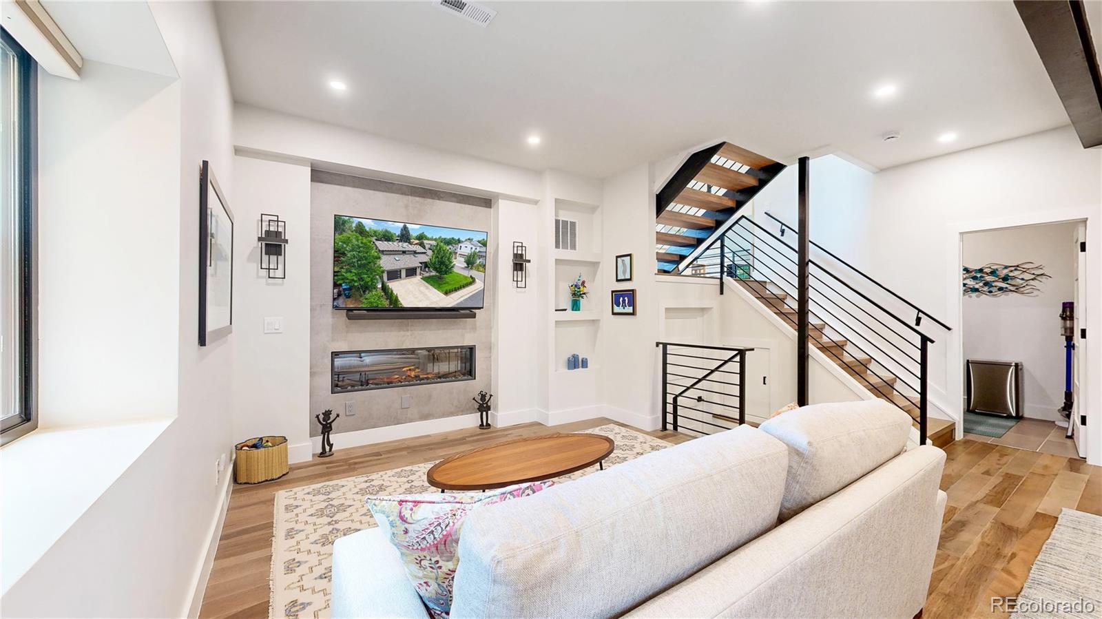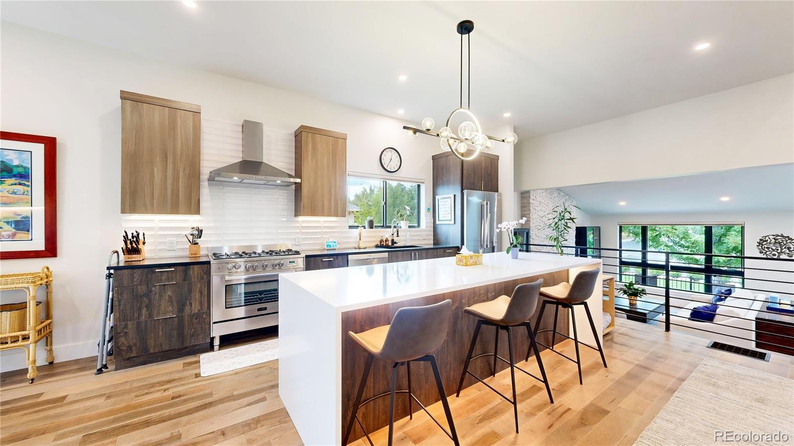 Discover a beautifully reimagined contemporary home in one of Louisville’s most desirable locations — less than one mile to Old Town, with convenient access to community parks and nearby trails. A two-year-new exterior and stamped concrete, west facing driveway create standout curb appeal, setting the tone for the quality found throughout. Inside, maple hardwood floors, raised ceilings, and an open floor plan create a light-filled and welcoming layout. Level 5 smooth wall finishes provide a sleek, modern aesthetic, while the marble tetris stone fireplace in the living room offers warmth and architectural elegance. Custom railings and a floating staircase lead to a statement kitchen featuring Bosch appliances, a Verona 36-inch stove and spacious island plus dining area with a deck. The lower level family room features built-in cabinetry, and a stylish bar area with a secondary electric fireplace and tile surround. The home blends luxury with function, including a washer and dryer with custom cabinetry and quartz countertops, newer black-on-black Pella windows and exterior doors(except for the slider), an energy-efficient furnace, A/C, and tankless water heater, upgraded electrical panel, and a spacious utility room perfect for storage or a potential workshop. The oversized two-car garage includes Bluetooth-enabled doors, a professionally coated garage floor and EV charging outlet. Roof warranty bonus — approximately three years remain on a five-year Roof Maxx coating warranty. Outdoor spaces are equally impressive with professional landscaping, irrigation system, backyard artificial turf, a fenced yard, backyard awning, front porch stonework and fence. Additional updates include removal of the cast-iron sewer line, leaf guards on gutters, and a retiled primary shower floor. This thoughtfully curated property blends craftsmanship, design, and convenience in an exceptional Louisville setting — a truly rare offering.