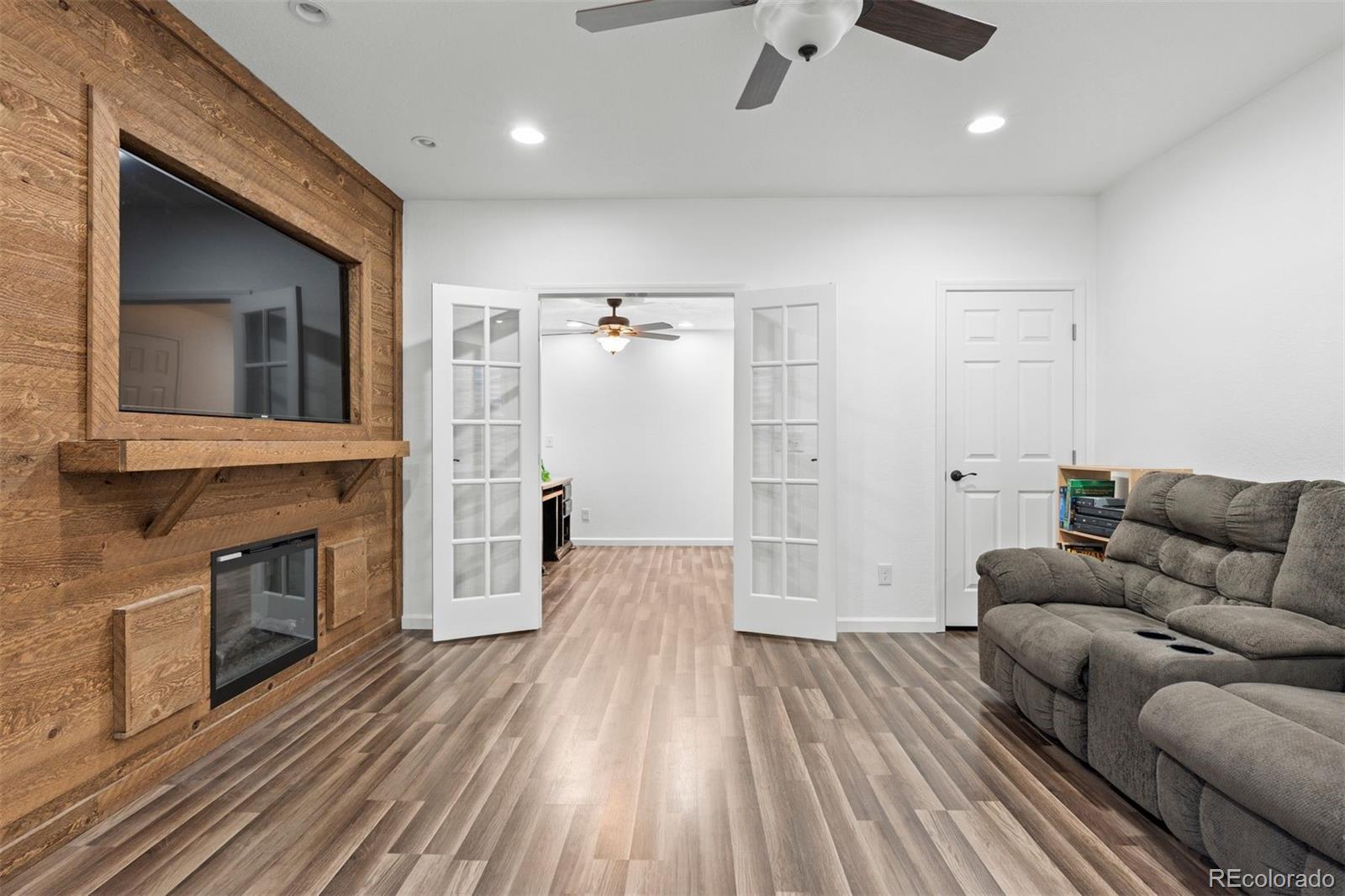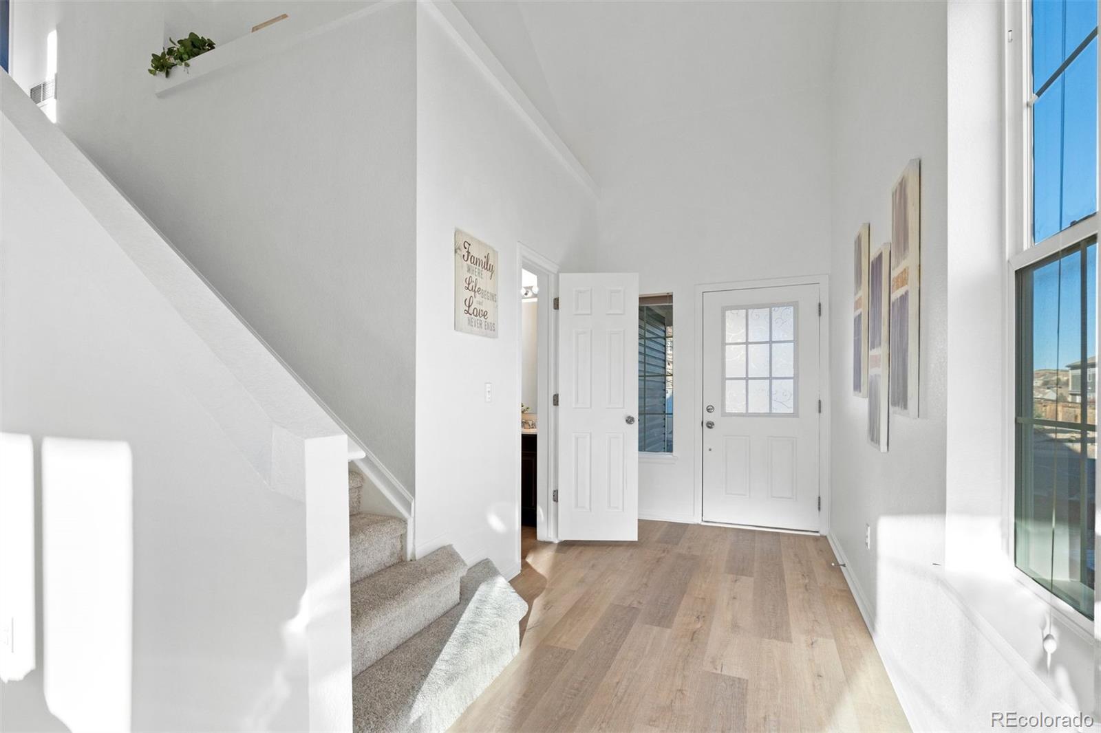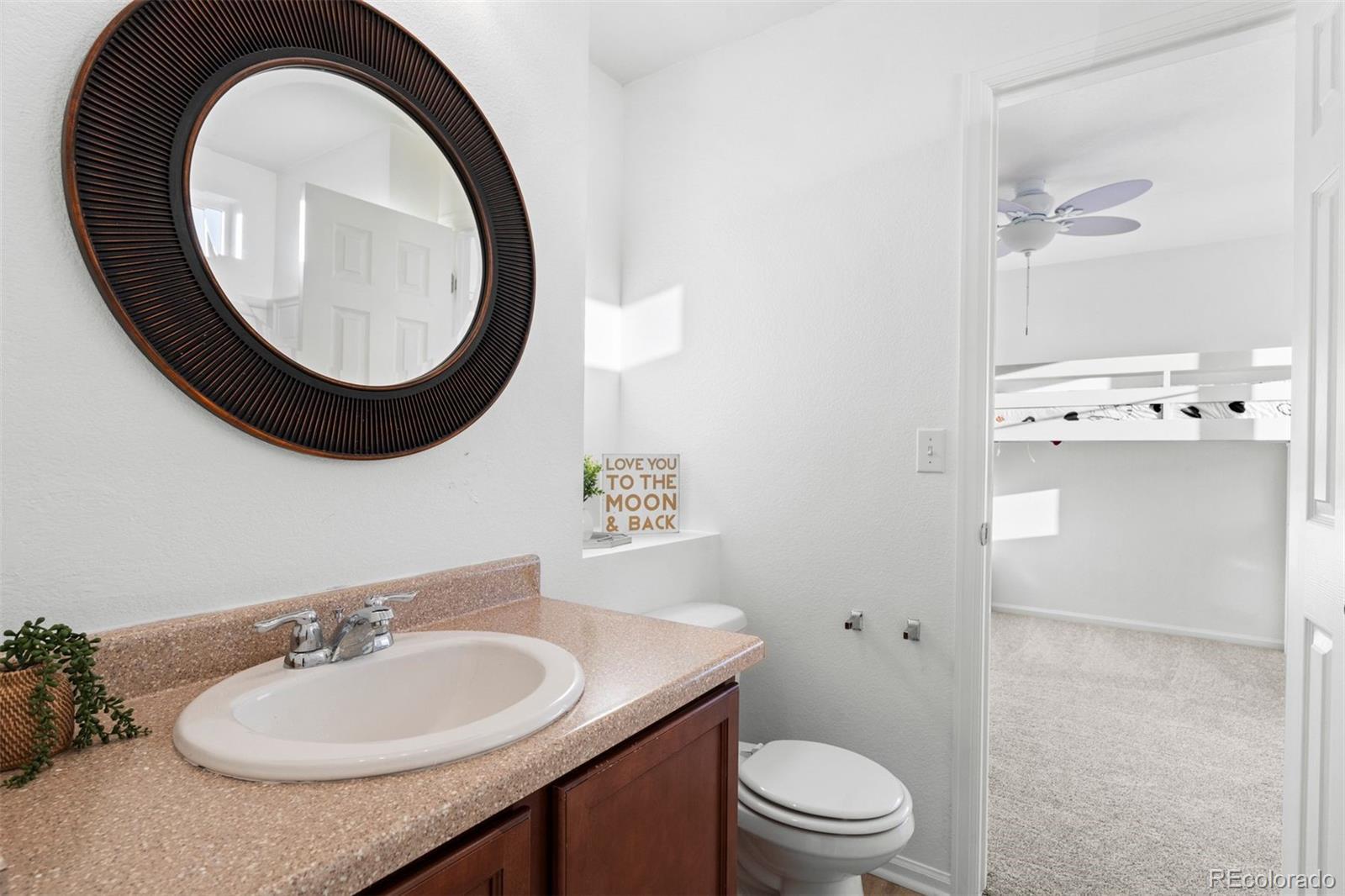 Updated and fresh! New flooring, new paint, newer roof and you'll love the open plan living. The main level has an open Great Room that walks out to a terrific covered patio and fully fenced yard that backs to open space. The 3 bedrooms upstairs, including the primary suite, also has a Jack and Jill bath between the two bedrooms with large closets. The basement is finished with new bathroom, bedroom/office and family room. Creative and custom mantel with electric fireplace for cozy ambiance. Enjoy the 10 minute walk to the elementary school, open space and trails. Plus enjoy the pool, clubhouse, tennis courts, trails, playground, and amazing location. Two car garage also provides additional storage. Come see this gem today!