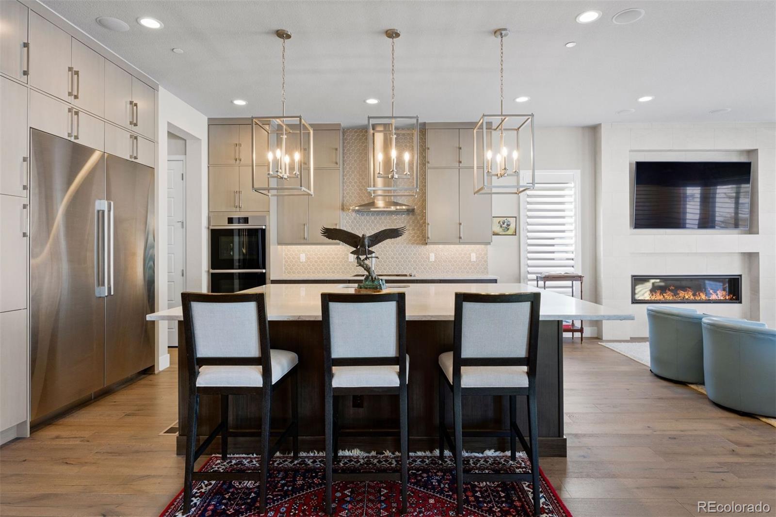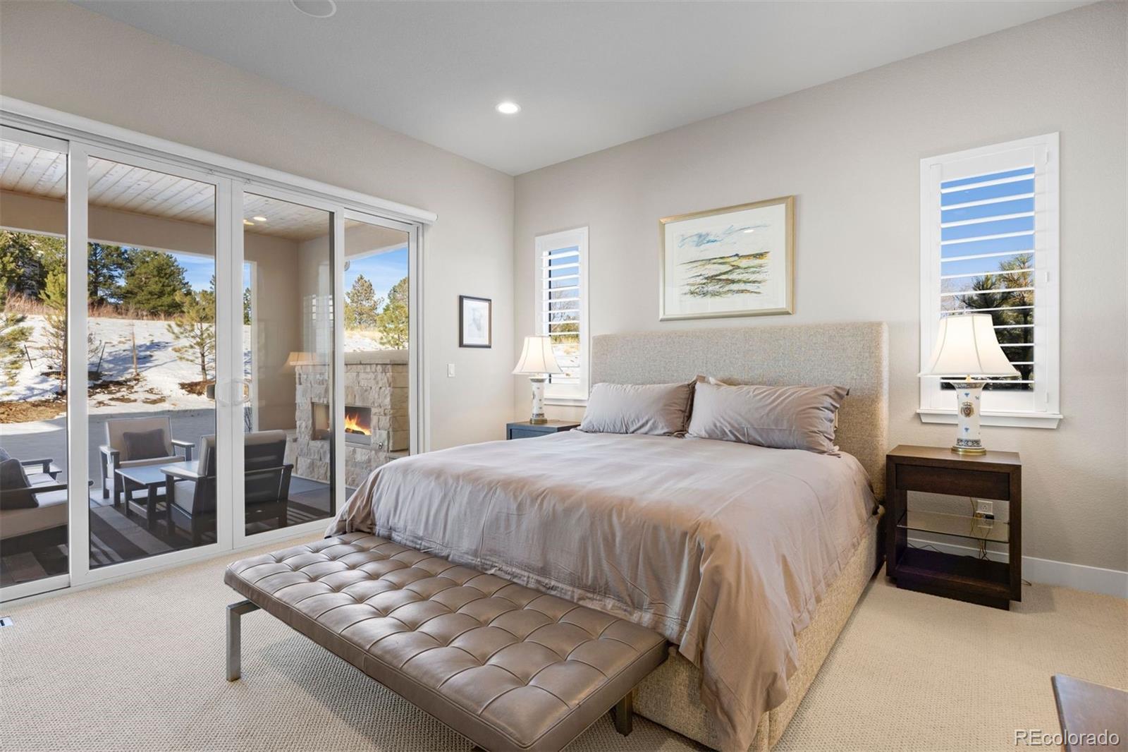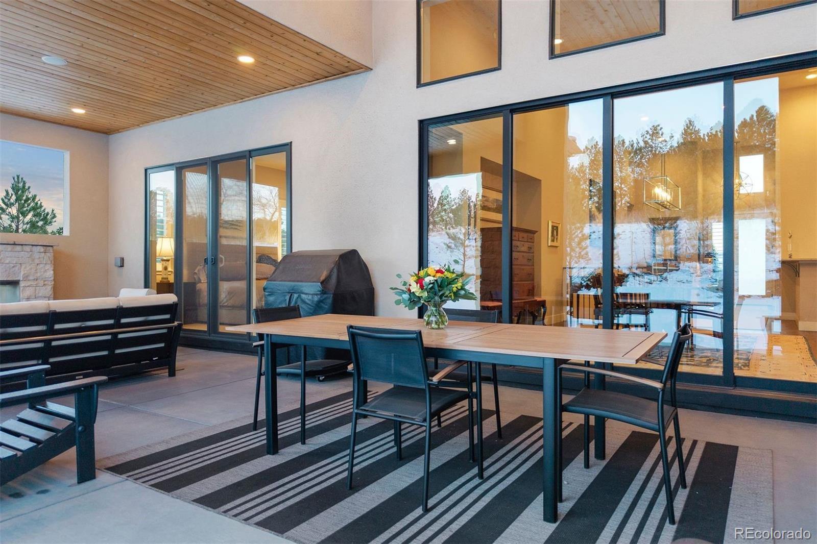 Prato offers an exceptional opportunity in the prestigious gated Castle Pines Village, privately set among towering pines, scenic trails, and world-class golf. The open-concept main level is thoughtfully designed for effortless entertaining, anchored by a chef’s kitchen with an oversized island, professional-grade Dacor appliances, and a generous walk-in pantry. The great room is framed by floor-to-ceiling windows that fill the space with natural light and centers on a dramatic fireplace with custom tile surround. A sophisticated serving bar with sink, wine refrigerator, and quartz countertops connects to the dining area, where sliding doors open to the covered patio for beautiful indoor–outdoor living. A convenient second bedroom on the main level with en suite bath is ideal for guests or a private home office. The light-filled main-level primary suite opens to the covered all-season patio with fireplace and features a spacious walk-in closet with built-ins and a spa-inspired bath with dual vanities, soaking tub, and a large glass shower with dual heads. The lower level offers a recreation/family room with tall ceilings and flexible space for relaxing, entertaining, or hobbies, along with two additional bedrooms with walk-in closets and a large unfinished storage area. Thoughtfully designed for comfort and convenience, the home offers an ideal lock-and-leave lifestyle in the heart of The Village. Residents enjoy the best of resort-style living with 24-hour gated security, pools, a fitness facility, tennis and pickleball, miles of scenic trails, and HOA-maintained landscaping.