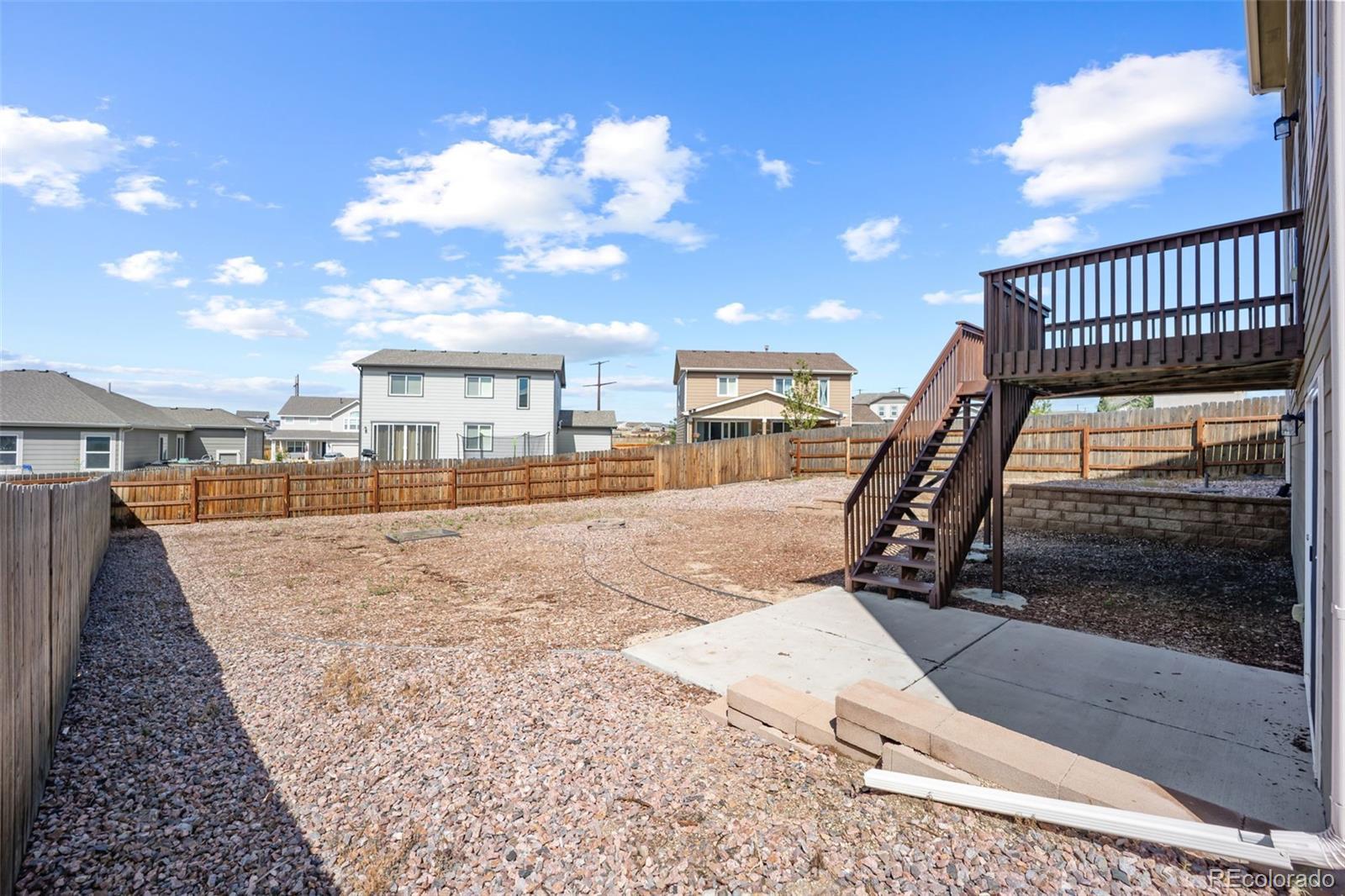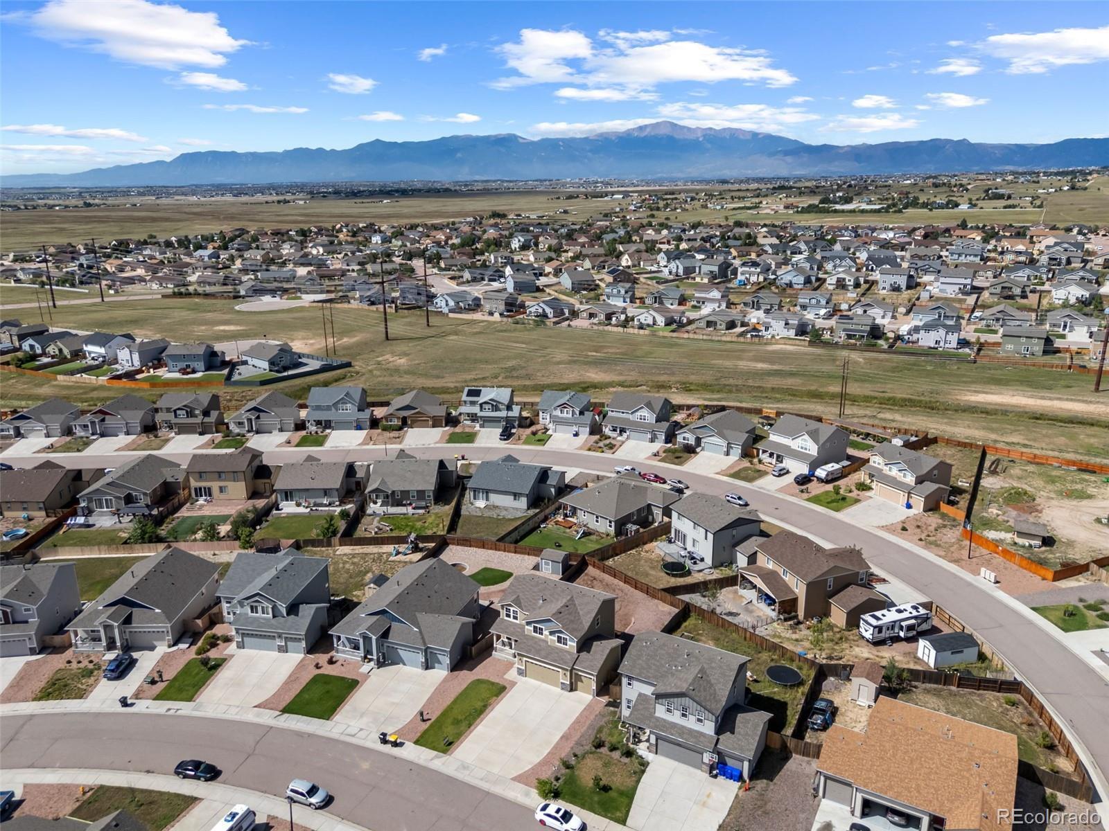 Assumable loan and no monthly HOA or metro fee! Situated on nearly a quarter-acre lot, it features mountain views, a finished walk-out basement, and an oversized 3-car garage with additional front parking for an RV, trailer, or boat. Enjoy relaxing on the front covered porch before stepping inside to an open-concept main level filled with natural light and views of Pikes Peak. A front room with French doors offers the perfect space for a home office or recreation area. The spacious kitchen includes 42” upper cabinets, granite countertops, a pantry, stainless steel appliances, and ample counter space, all while showcasing stunning mountain views. Step onto the deck to take in breathtaking sunsets while dining or unwinding. The dining area accommodates an 8+ person table, and the living room comfortably fits a large sectional and big-screen TV. Upstairs, a versatile loft provides room for a secondary seating area, playroom, or reading nook. The primary suite serves as a private retreat with a 5-piece bath featuring a deep soaking tub, tiled walk-in shower, double vanity, and walk-in closet. Three additional bedrooms and a full bath with double vanity complete the upper level. The fully finished walk-out basement offers a wet bar, wired for a home theatre and audio, office space, large bedroom, 3/4 bath with walk-in shower, and additional storage under the staircase. The fully fenced backyard includes a patio and fire pit, perfect for outdoor gatherings. Enjoy year round comfort with central A/C and upgraded Class IV Roof. All appliances included w/washer & dryer. Conveniently located near Peterson SFB, Schriever SFB, and the USAF Academy, with easy access to shopping, dining, schools, and outdoor recreation. Assumption requires substitution. Estimated payoff is $405,491, $2,510 PITI, 3.25% assumable interest rate. Schedule your showing today.
