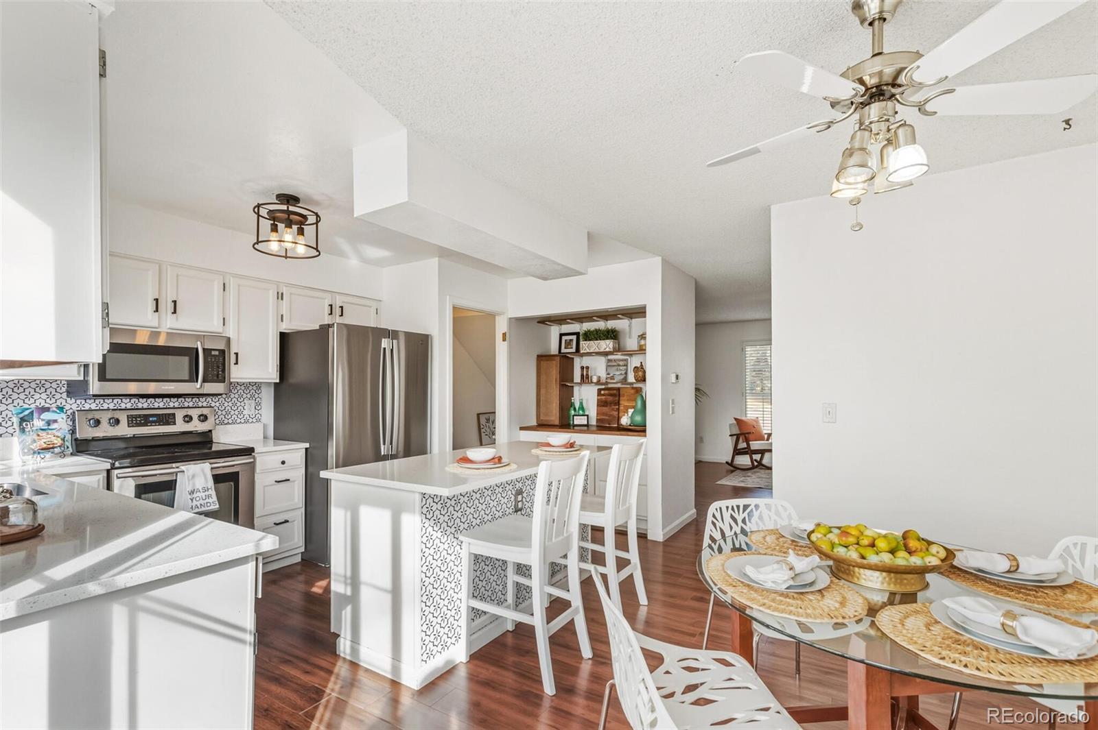 Modern Littleton townhome with soul, style, and unbeatable access to everything that Colorado living has to offer! Set within the well-maintained Dutch Ridge community with inviting curb appeal, this home welcomes you with a warm and comfortable interior featuring wood-grain laminate flooring, abundant natural light, and a cozy wood-burning stone fireplace—perfect for crisp winter evenings. The spacious eat-in kitchen delivers high function and style, offering quartz countertops, newer appliances, generous cabinetry, and ample prep space. A counter-height breakfast bar makes everyday dining easy, while the adjacent dining area is ideal for hosting friends and family. And then comes the true showstopper—step outside to your expansive private deck and take in breathtaking mountain and green space views. Morning coffee, evening sunsets, and everything in between will feel elevated with this incredible backdrop! Upstairs, you’ll find two generously sized bedrooms, including a king-sized primary with a walk in closet and a bright secondary bedroom. A full bathroom with dual vanities serves the upper level. The lower level adds tremendous flexibility with a large den or non-conforming third bedroom that opens to an enclosed patio. A three-quarter bathroom, laundry room, utility closet, and extra storage complete the space—ideal for a media room, home office, hobby area, guest suite, or roommate setup. Perfectly positioned backing to open green space with no neighbors to the west, this home offers extra privacy and peaceful views. Enjoy immediate access to Dutch Creek Trail, plus nearby adventure at Ken Caryl and Chatfield Reservoir. Community pool to enjoy in the summer! With endless dining, shopping, and everyday conveniences along Wadsworth Boulevard and easy routes to Highway 285 and E-470, this is the perfect blend of comfort, convenience, and scenery. Lock-and-leave ease, inspiring views, and outdoor adventure are right outside your door—welcome home!