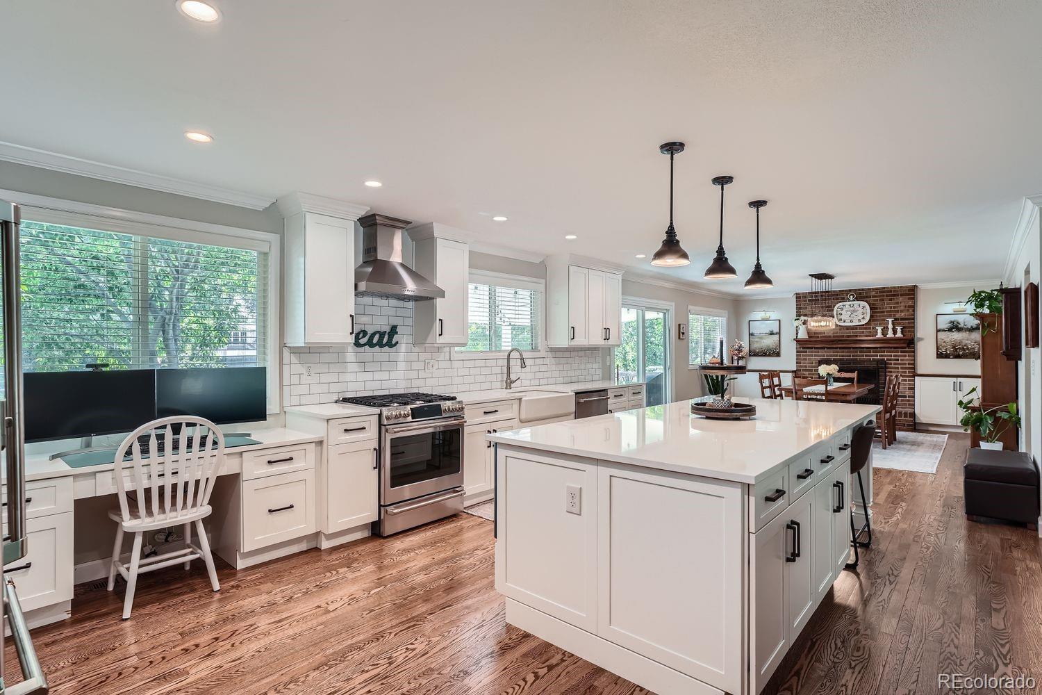 Welcome to the fully remodeled Taft House, where timeless charm meets modern luxury. Every detail has been thoughtfully updated, making this home truly move-in ready. The heart of the home is the designer kitchen, featuring all new soft-close cabinetry, quartz countertops, a farmhouse sink, a spacious 10-ft island with seating, and top-of-the-line GE Café appliances including a 6-burner gas stove. A new pantry adds convenience, while recessed lighting and crown molding elevate the main level’s style. The primary suite is a retreat with a walk-in closet and a spa-like 5-piece bath boasting a freestanding tub, double vanity, and private shower. All bathrooms were fully remodeled with modern tile, fixtures, and vanities. Hardwood floors flow throughout the main level, complemented by new tile in baths and fresh carpet in the basement. Built-ins around the refreshed gas fireplace add warmth and character. Mechanical systems have been upgraded for peace of mind: new furnace, AC, hot water heater, electrical panel, attic fan, and insulation. Energy efficiency shines with a solar system installed in 2022. Outside, curb appeal abounds with new siding, exterior paint, and front windows. Fresh concrete enhances both porches, driveway, and side yard extension. The backyard is an oasis with professional landscaping, a new sprinkler system and panel, and a large shed for storage. A newer fence with oversized gate allows easy RV parking. Set within Woodland Valley’s quiet, tree-lined streets, this home offers convenient access to parks, trails, shops, and Denver connections. With every upgrade complete, the Taft House delivers elevated living and lasting value.