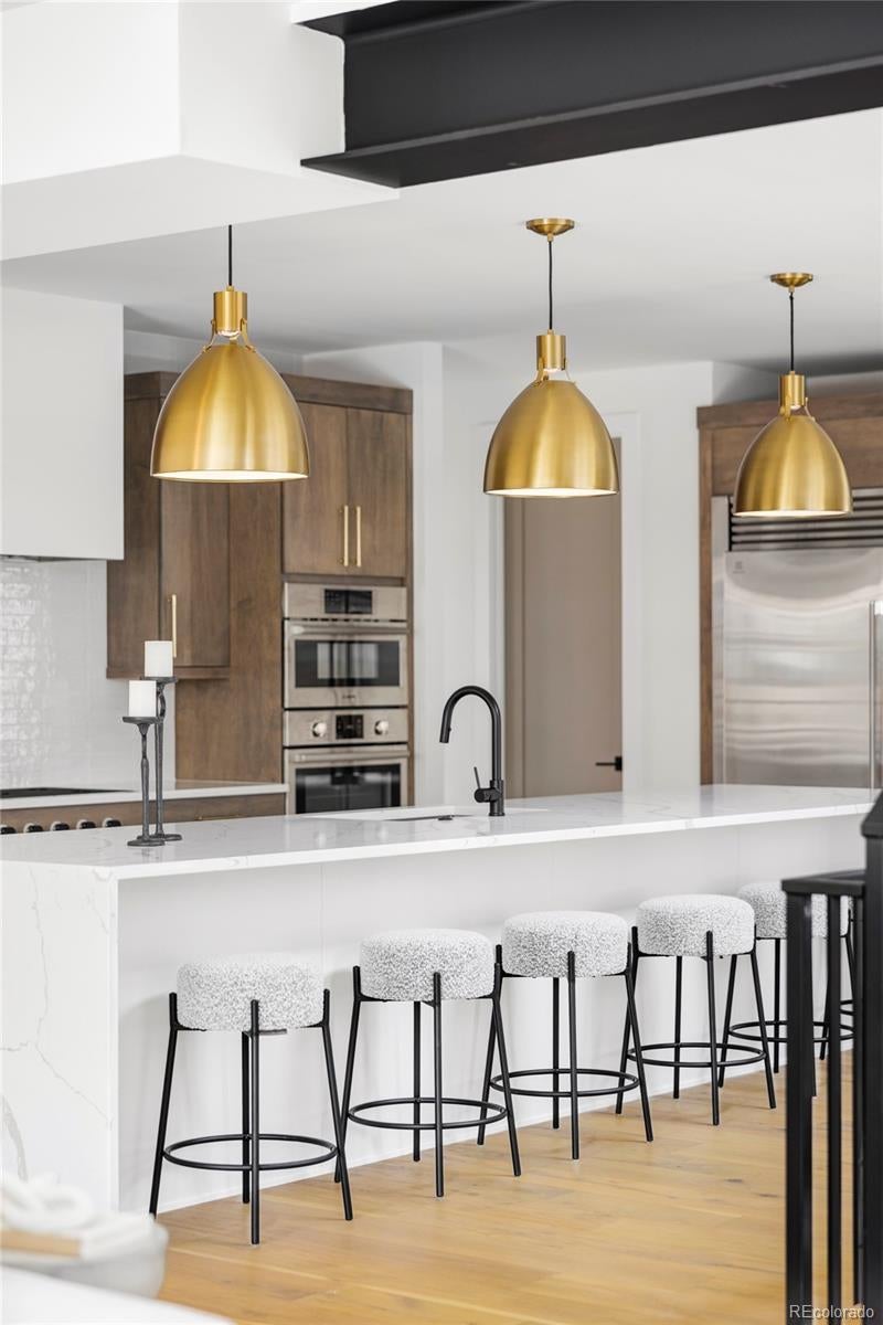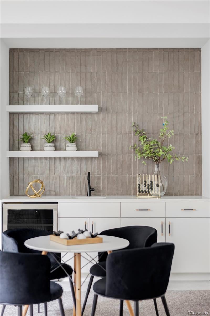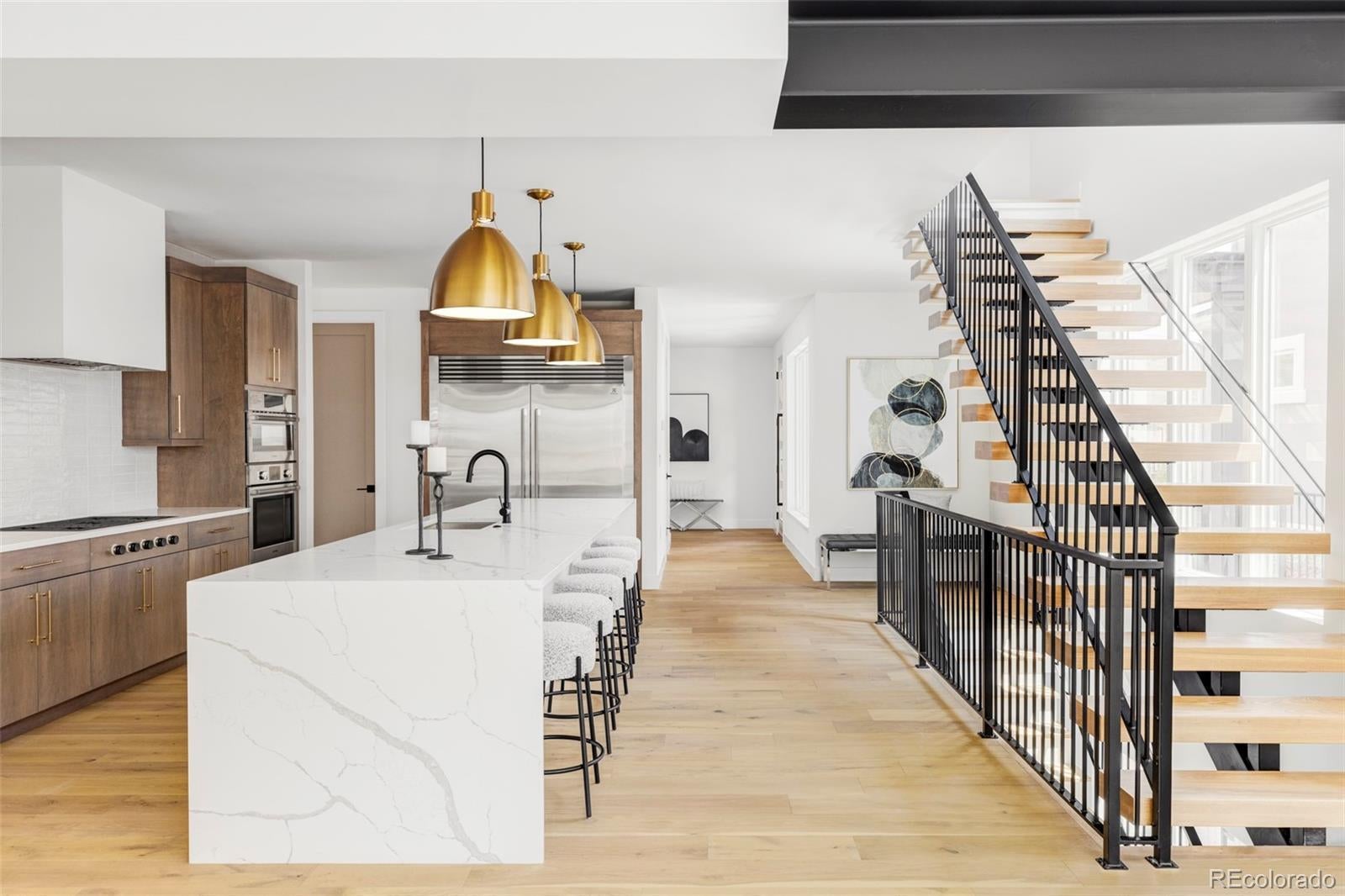 Refined elegance meets modern luxury in this exceptional Cory-Merrill home crowned by a rare rooftop deck. A contemporary façade with a covered front porch introduces a luminous, open layout brimming with thoughtful design and stylish designer millwork throughout. The gourmet kitchen impresses with high-end appliances including a Wolf cooktop, custom cabinetry and a vast center island — seamlessly connecting to a sophisticated dining area with a multi-slide door to a patio in a private, fenced backyard. The living room stuns with vaulted ceilings and a floor-to-ceiling fireplace. A main-floor office exudes style and function, while the primary suite offers a spa-like retreat with a soaking tub and walk-in shower. The third-floor party room features a wet bar and opens to a showstopping rooftop deck with mountain views. A finished basement includes a second wet bar and home gym. With built-in speakers and a three-car attached garage, this home balances striking design with everyday comfort.