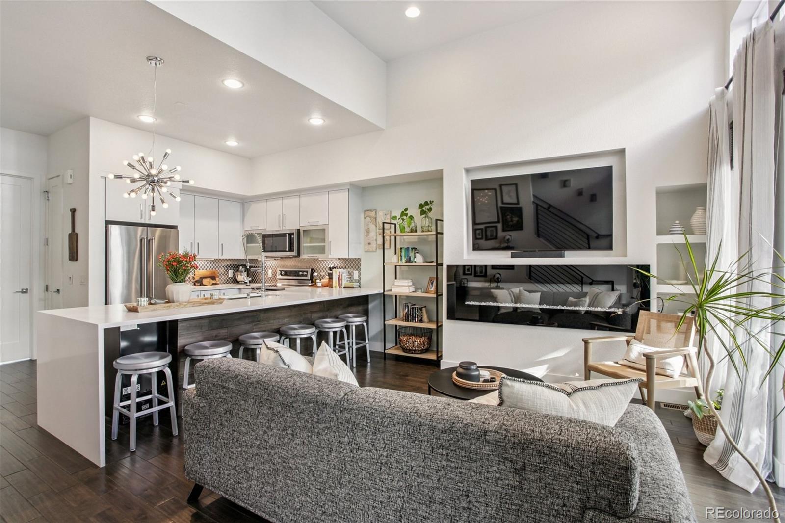 Experience the ultimate combination of modern style, thoughtful design, and unbeatable location in this stunning 2-bedroom, 2-bath townhome nestled in Skyland Village. Just a short stroll from City Park, the Denver Zoo, the Museum of Nature & Science, and City Park Golf Course, this home puts Denver’s best attractions right at your fingertips. Step through the front door into a bright, versatile entry-level bedroom, a private en-suite bath, perfect as a guest suite, home office, workout room or even a roommate rental opportunity. The attached oversized two-car garage offers a rare and coveted convenience for urban living. On the main level, the open-concept layout is a true masterpiece. Wide-plank hardwood floors flow through a space designed for both comfort and style, featuring soaring ceilings with sleek quartz countertops, custom tile accents, and high-end KitchenAid appliances in the kitchen. At the heart of the living area a dramatic oversized electric fireplace sets the tone for cozy nights in or gatherings with friends, all while exuding contemporary elegance. The primary suite features an en-suite bath and laundry for convenience. But the crown jewel? A private rooftop deck with jaw-dropping panoramic views of the Denver skyline and the majestic Rocky Mountains. Outfitted with a gas line and speaker prewiring, this outdoor oasis is primed for unforgettable evenings under the Colorado sky. Enjoy the perks of a walkable neighborhood with breweries, coffee shops, restaurants, and parks just minutes away. With easy access to LoDo, RiNo, Cherry Creek, I-70, and a quick 25-minute drive to DIA, this home offers seamless connectivity to everything you need. This isn’t just a home—it’s a lifestyle upgrade. Don’t miss the chance to make it yours!