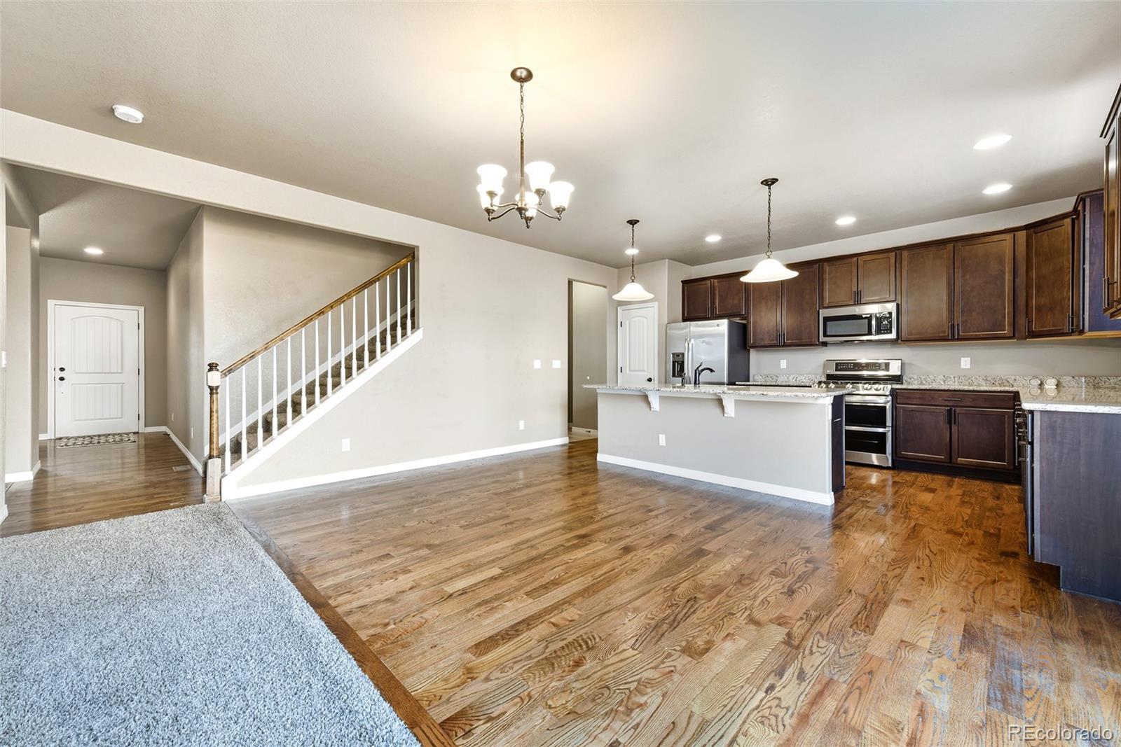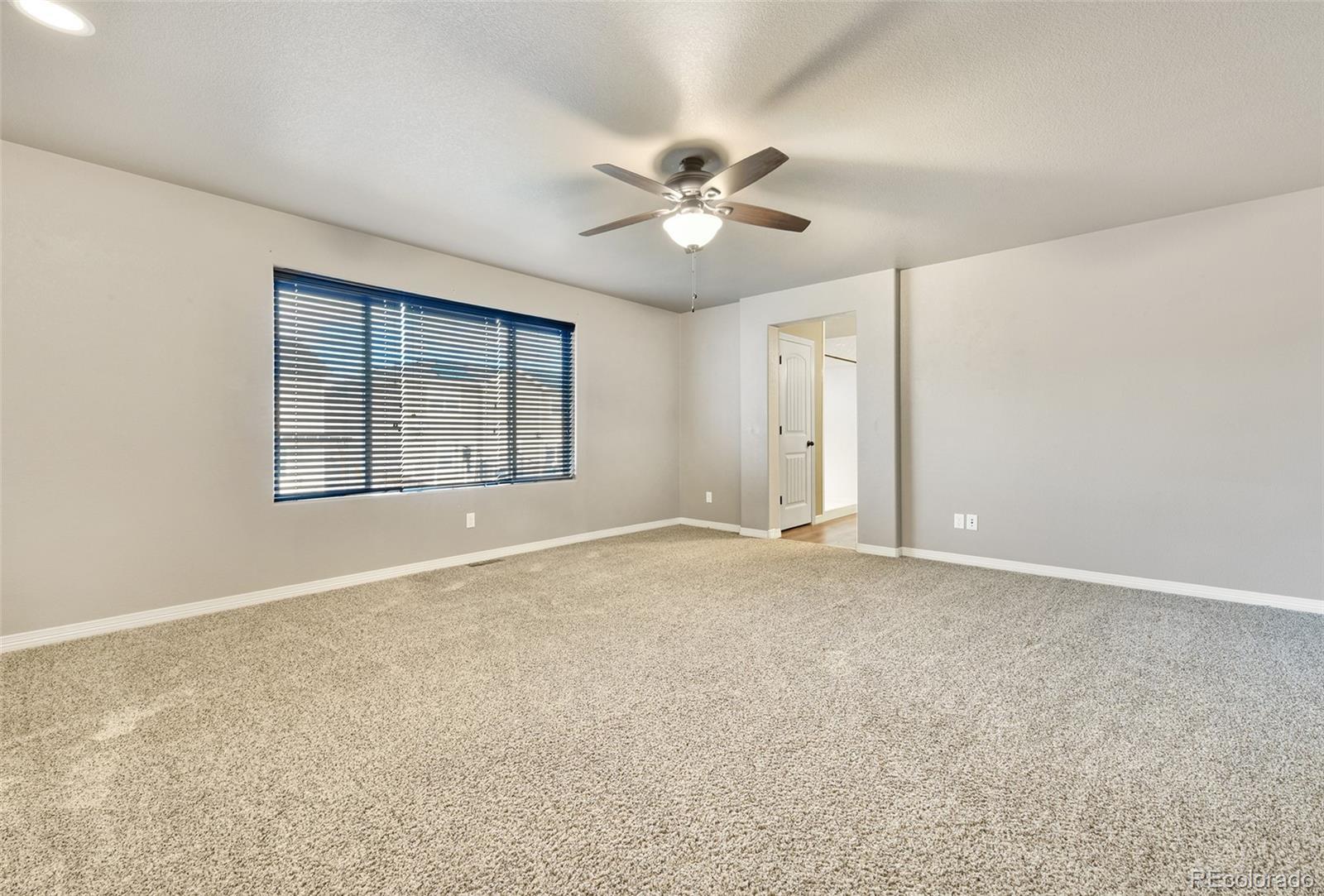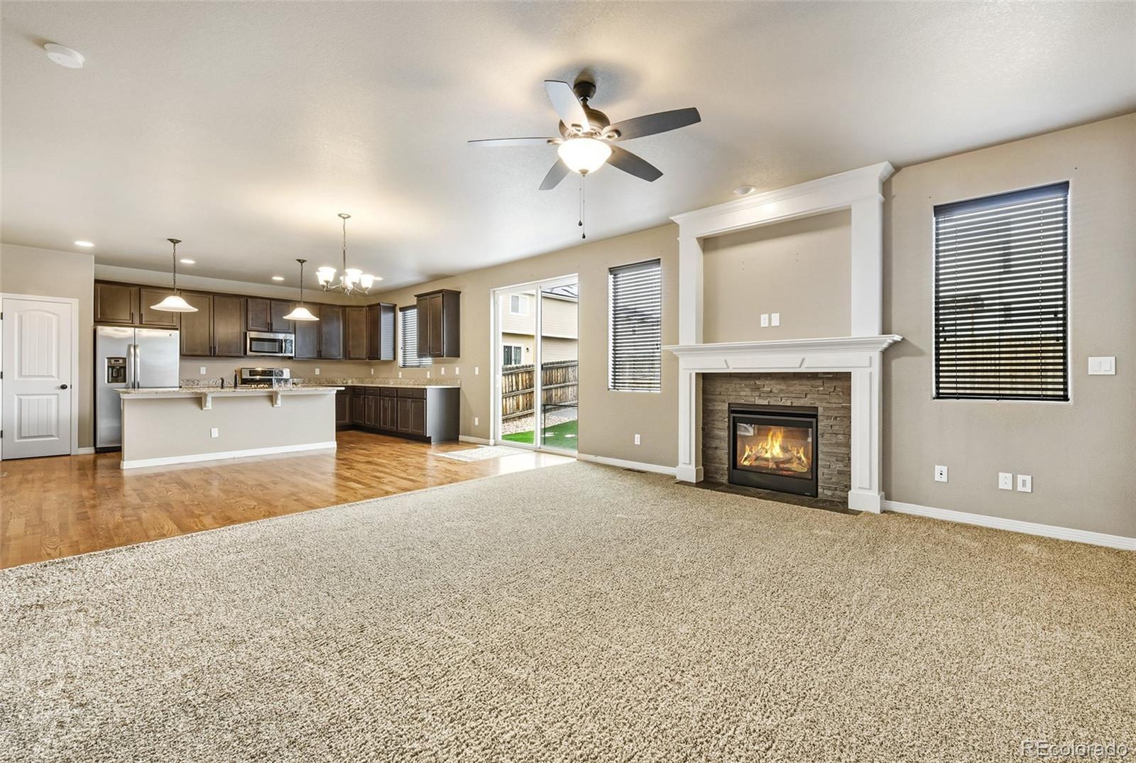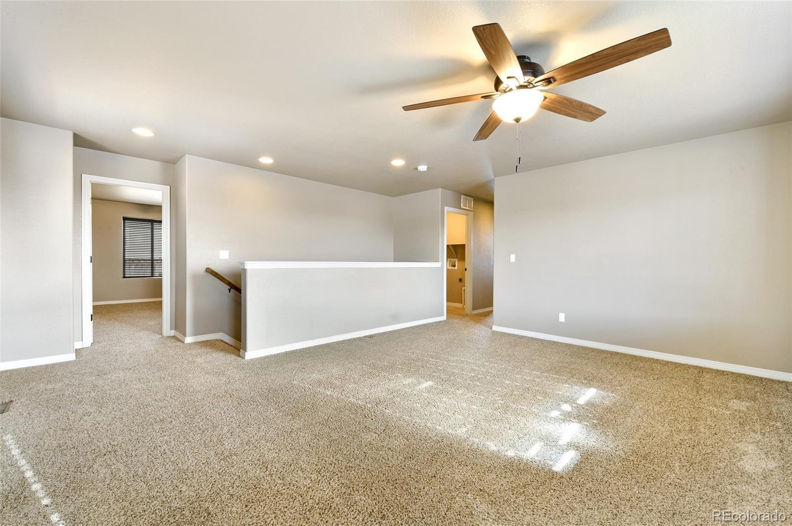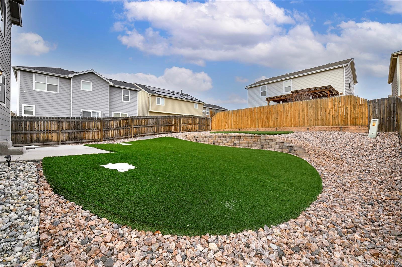 Beautiful two-story “Red Rock” floorplan by Reunion Homes, offering multiple living areas and flexible spaces for a truly multi-purpose home! Move-in ready, this property features premium-grade turf for a low-maintenance, year-round gorgeous yard. A welcoming front porch leads into a wide hardwood entry with convenient powder room and closet access. The large living room includes a stacked-stone gas fireplace—perfect for winter nights or snow days—and opens to the walk-out dine-in kitchen. The kitchen is complete with a center island featuring a deep, wide sink, extended-height cabinetry, LE and GE stainless steel appliances, granite countertops, and a pantry. A separate formal dining room provides additional versatility and can easily be used as an office or playroom. Upstairs, a spacious loft separates the bedrooms. The substantial primary suite includes an attached bath with private commode, walk-in shower, double vanity, and a generous walk-in closet. Two additional bedrooms, a 6x5 upper-level laundry room with built-in shelving, and a full bath with granite counters and LVP flooring are located on the opposite side of the loft. The lower level boasts an enormous family room, another full bath with granite countertops and LVP flooring, and a large lower-level bedroom with walk-in closet. Additional features include a water softener, 9-foot ceilings throughout, an attached two-car extended-height garage, and a fully landscaped yard with fenced backyard. Located close to Peterson, Powers, schools, shopping, and parks, this home truly has it all. You won’t want to miss this one!