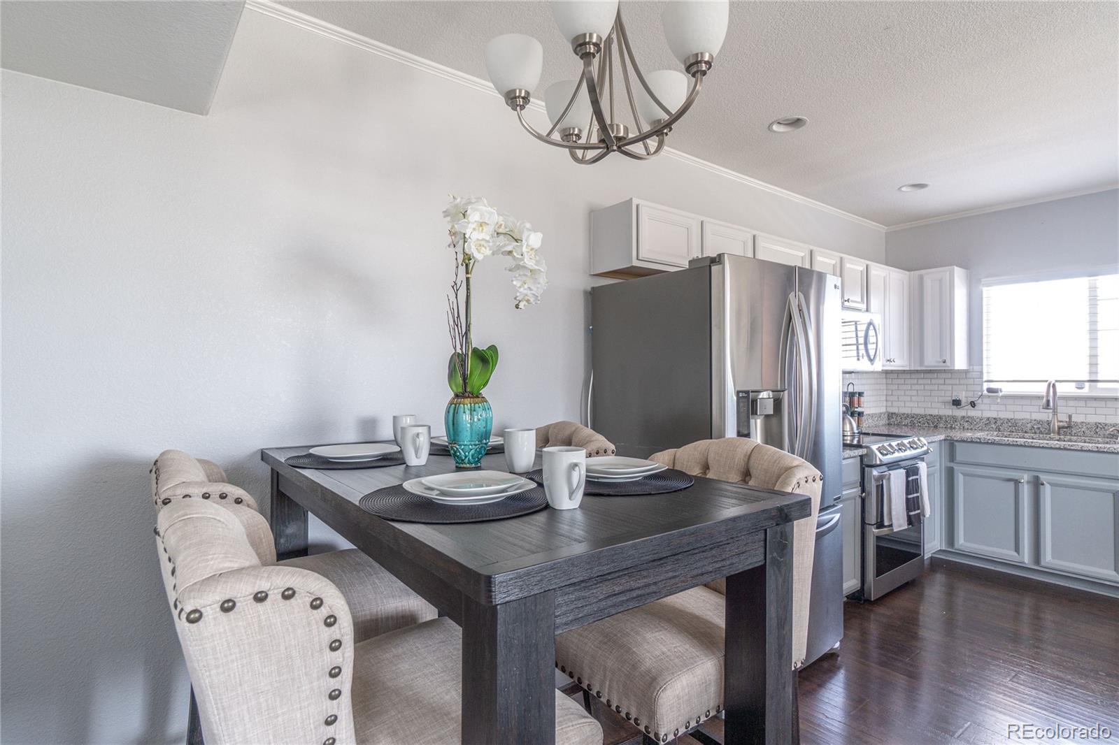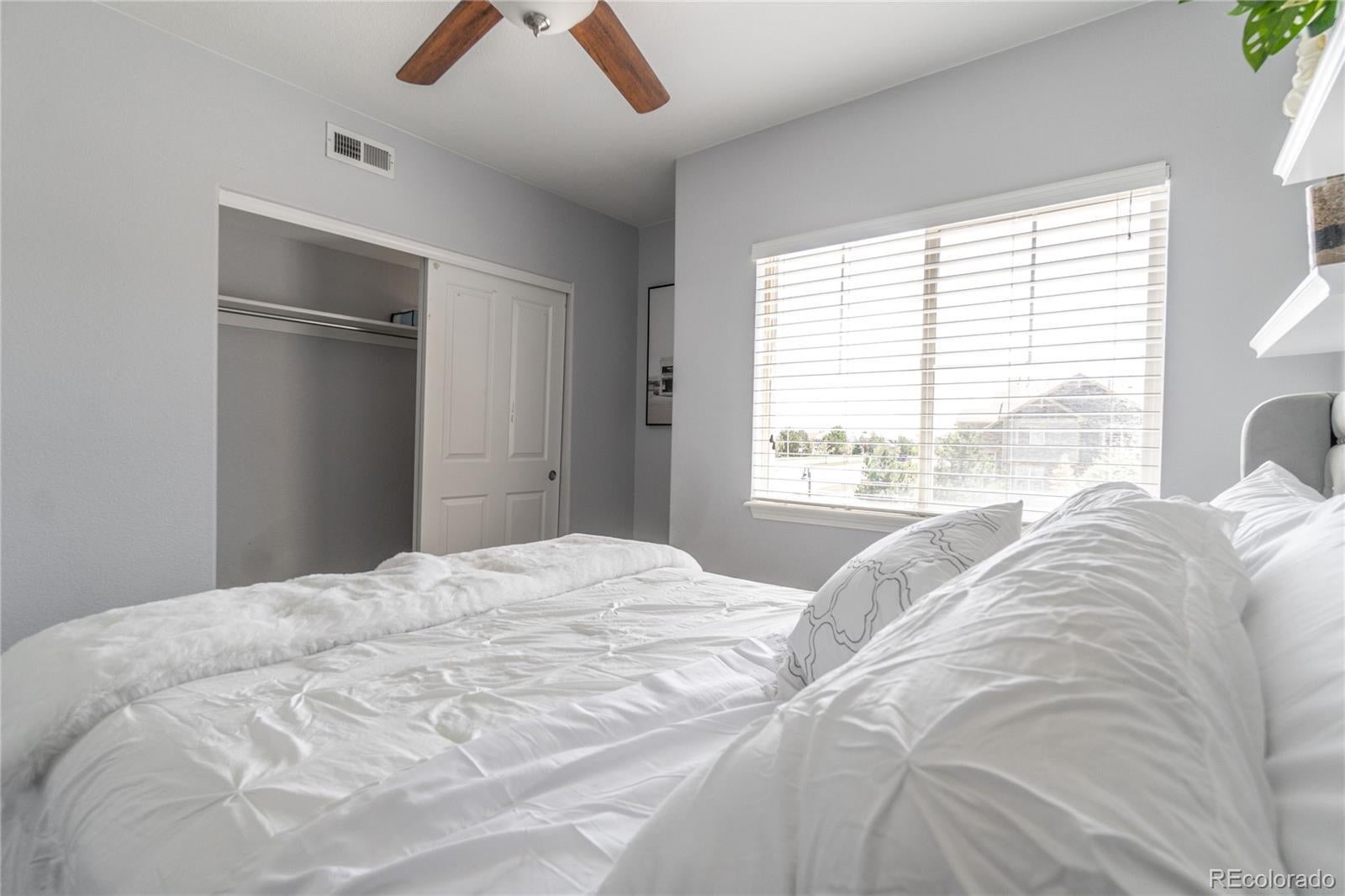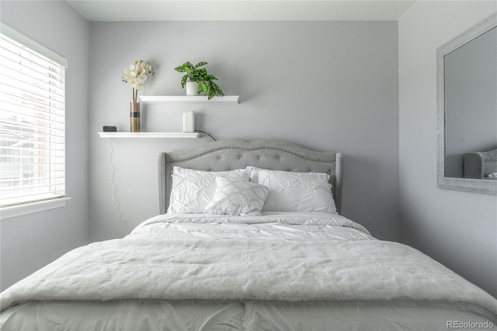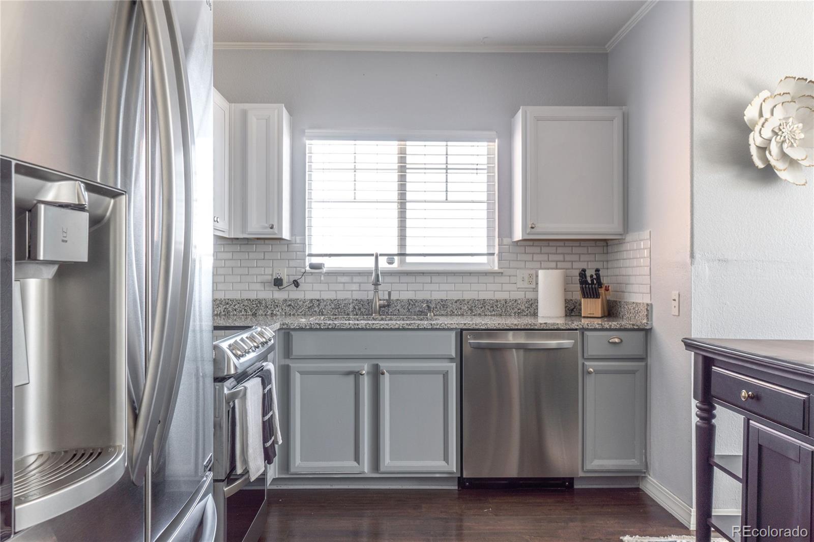 Updated, move-in ready, bright and open upper level corner unit! Located in the desirable Redbuck at Sorrel Ranch community. The open concept gathering areas offer newer Pergo flooring, 2" blinds throughout, a dedicated dining and living area and updated kitchen including slab granite counters, subway tile backsplash and SS appliances. Enjoy the spacious primary bedroom, generous walk-in closet and ceiling fan/light fixture. The large secondary bedroom also incudes a large closet and ceiling fan/light fixture. The shared full bath comes with an oversized soaking tub, modern glass slider doors, updated subway shower tiles and a large granite vanity. Laundry closet includes a stackable washer/dryer. Easy parking with the detached, full sized, one-car garage and plenty of extra guest parking. Separate storage closet is included, located at the bottom of unit, perfect for holiday decor or outdoor equipment. Located in the Cherry Creek School District and walking distance to Southland's Mall. You'll enjoy the short drive to the Aurora Reservoir and The Southeast Recreation Center, also as and added bonus it has Great access to DIA/E470/Meridian/DTC/Buckley AFB.