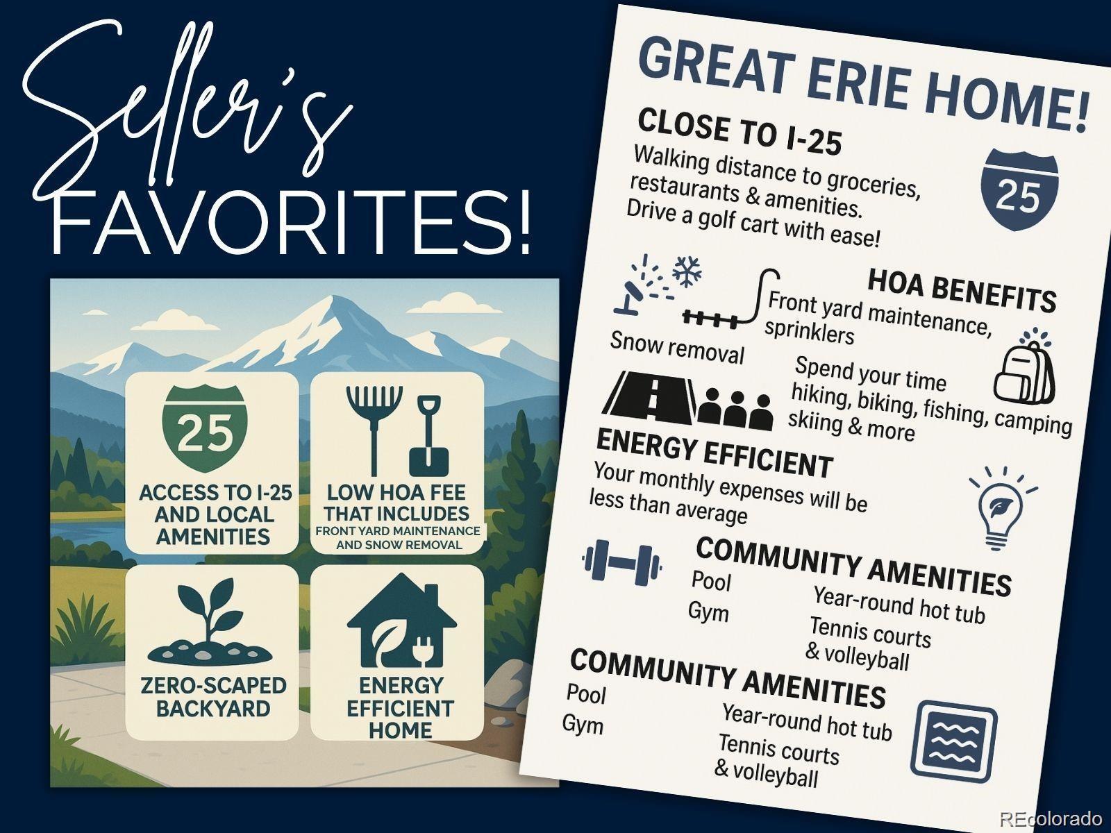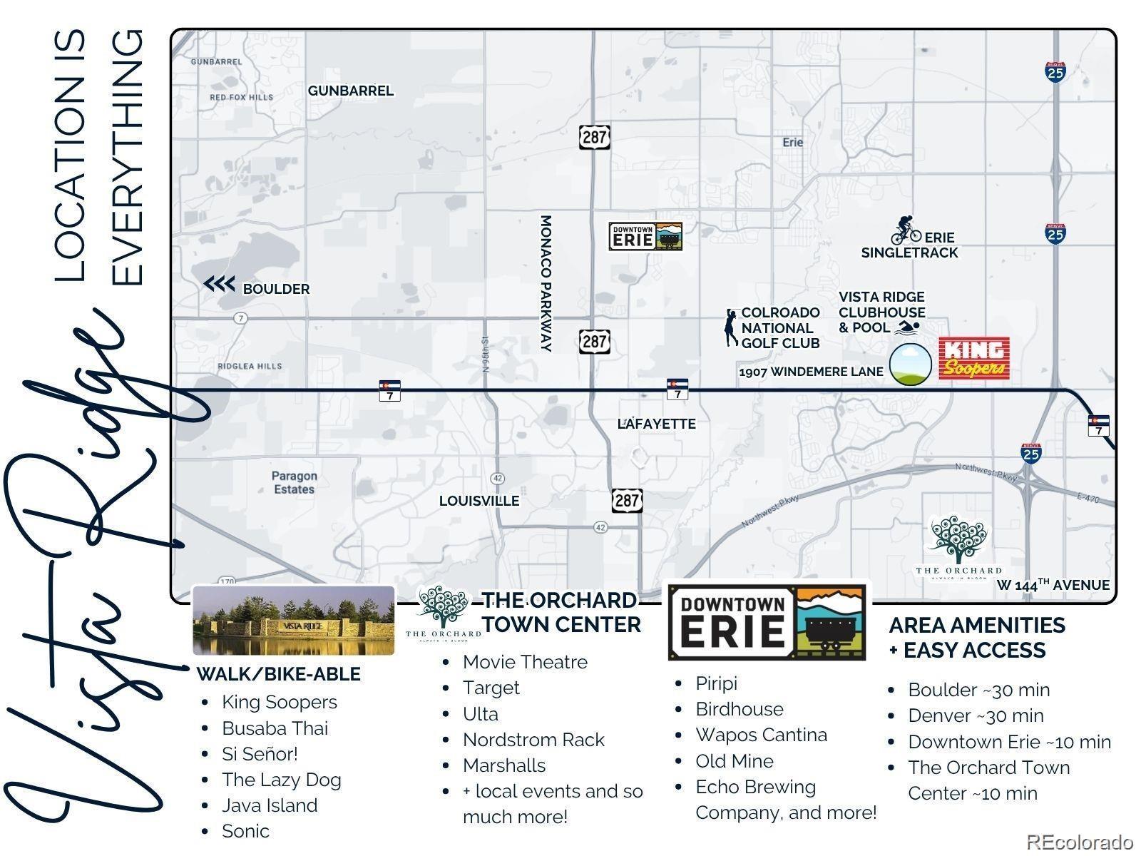 For those dreaming of resort-style living in a premier 5-star golf course community, welcome to 1907 Windemere Lane! A carefree haven surrounded by exceptional amenities. This rare, low-maintenance lock and leave ranch-style home offers the perfect blend of comfort and convenience. This 3-bedroom plus office, 3-bathroom home offers nearly 3000 finished square feet, including a full finished basement—ideal for guests, recreation, or work-from-home flexibility. Everything you need is located on the the main level that is thoughtfully designed with an open floorplan, a kitchen island, breakfast nook, primary suite, and convenient laundry room. The HOA-maintained yard means more time to enjoy your weekends, not spend them mowing or shoveling snow. Recent updates include brand new carpet on main floor, newer exterior paint, and updated exterior landscaping. Hop in your golf cart for a quick ride to the Colorado National Golf Club for a round of golf or their popular weekend brunch. Enjoy access to Vista Ridge's vibrant amenities, including the clubhouse, two resort-style pools, tennis courts, parks, and miles of scenic trails and walkable favorites like Lazy Dog, Si Senior, Java Island, Busaba, and King Soopers. You’ll fall in love with life in Erie! Where hot air balloons drift across the morning sky, the Thursday farmers market brings the community together, and downtown Erie offers an incredible mix of local restaurants and charming shops. Welcome home!