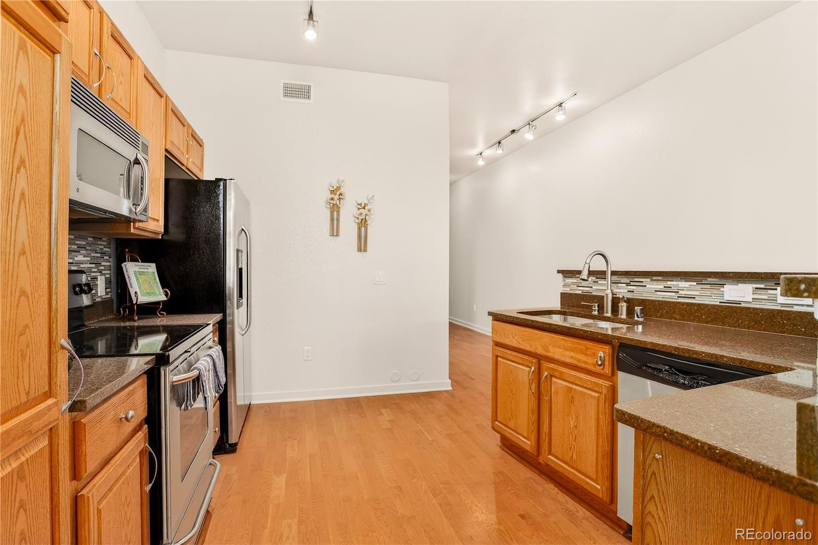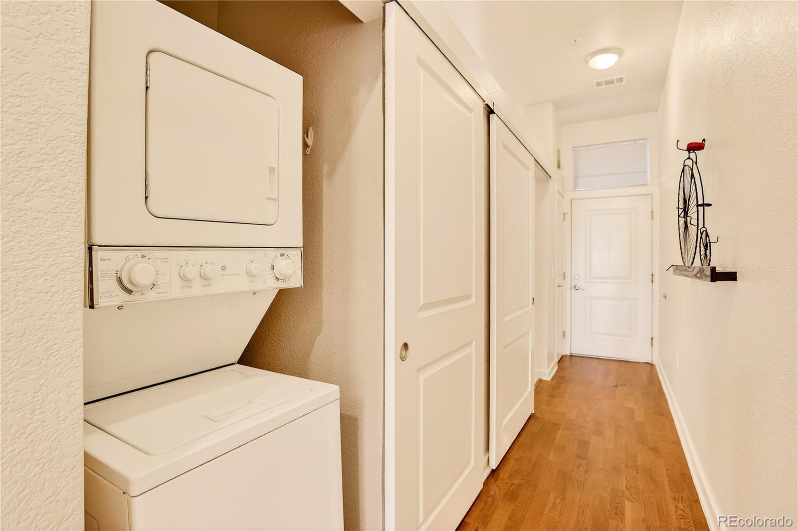 Wow--main floor with patio that opens to PARK!! Open concept, high ceilings and SOOOO Bright and Airy. New Paint, new carpet in bedroom. Have a dog? How easy to go out the back door to the park. Need no stairs? Perfect access from community garage deeded parking space to the unit. Storage off entry and stackable W/D included! Staged and Ready - this one shines! Great Belmar location - close to everything Belmar has to offer - shops - movies - restaurants, all with great proximity to I70 and 6th Avenue.