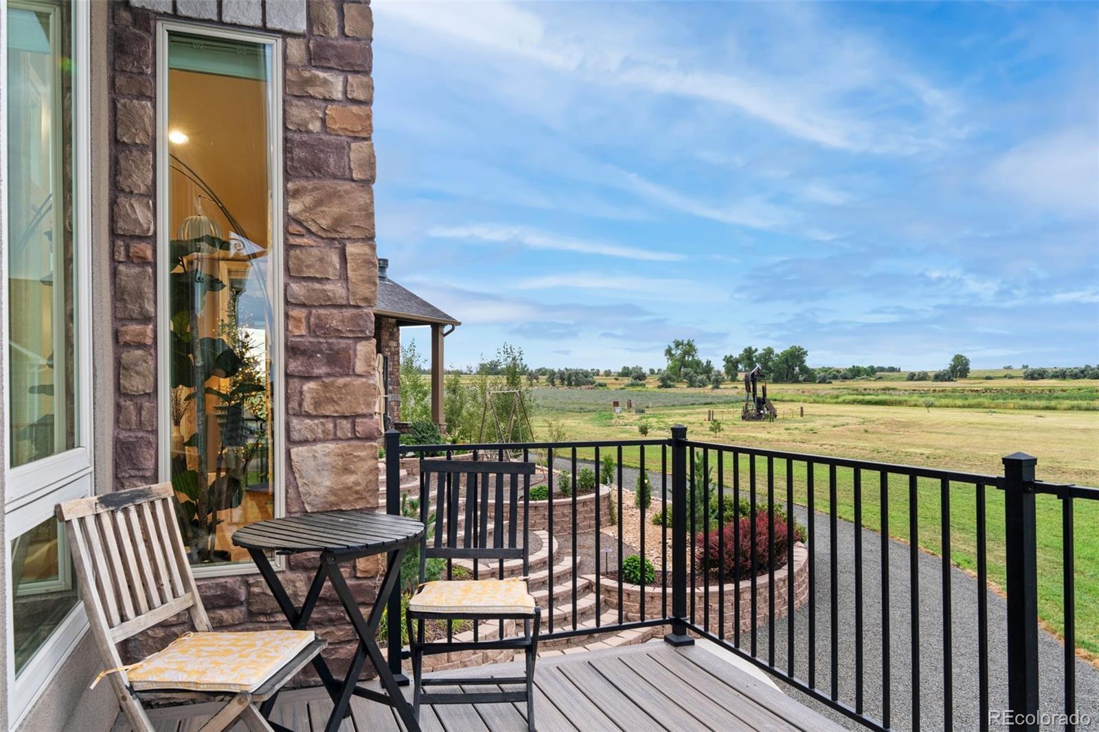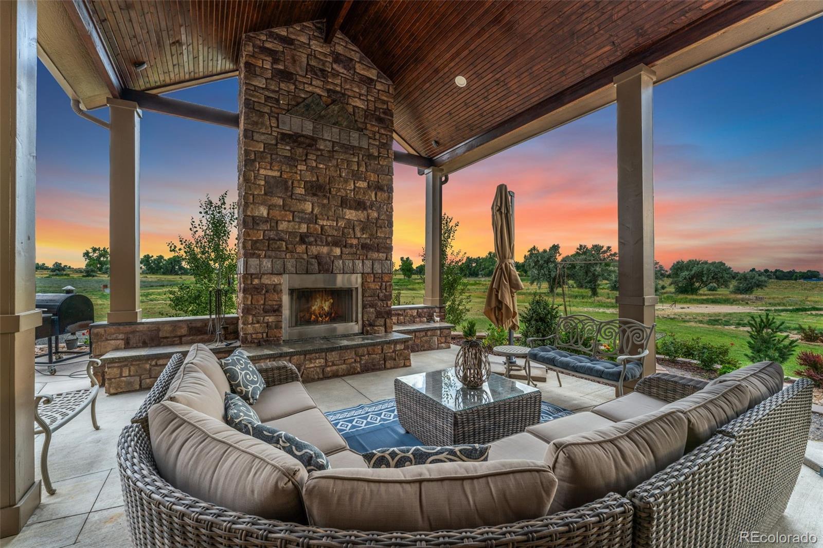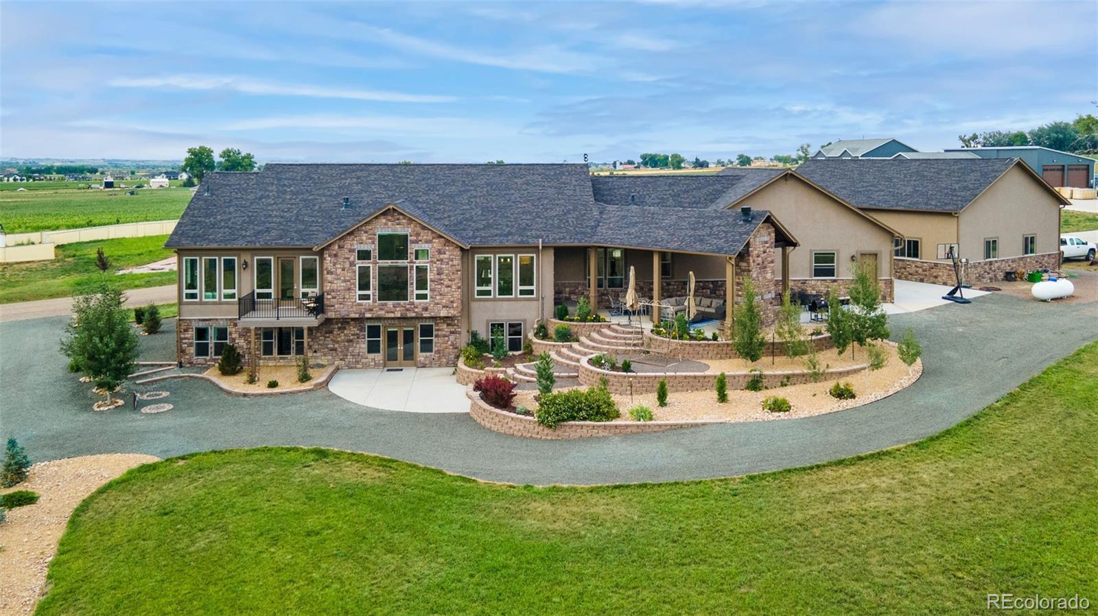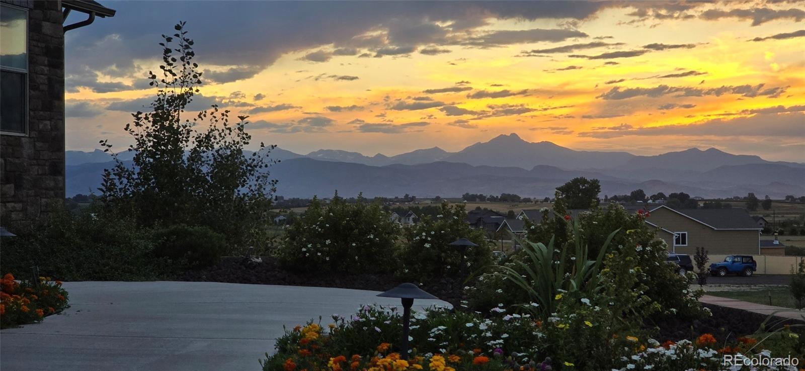 Experience luxury, space, and stunning mountain views in this breathtaking 6-bedroom, 5-bath custom ranch on 3.1 acres! Just 8.5 miles from Longmont, 18 from Boulder, 31 from DIA, and with quick I-25 access, the property is surrounded by farms and a permanent conservation easement, offering peace and privacy. The gourmet kitchen features custom cabinetry, quartz counters, abundant storage, and opens to a vaulted, wood-beamed great room with a cozy fireplace and walls of windows showcasing the views. The primary suite includes a private fireplace, deck, and spa-like bath with freestanding tub, dual sinks, and large shower. A dedicated main-level office and guest suite with en suite bath provide convenience and comfort. The spacious walk-out basement offers a wet bar, family room with fireplace, and three versatile bedrooms for guests, hobbies, or fitness. A large bedroom with en suite bath is ideal for multi-generational living. Car enthusiasts and RV owners will love the insulated 6-car tandem garage with hot and cold water spigot located in the attached garage ideal for washing vehicles, cleaning equipment, or other utility needs. RV and toy owners will appreciate the massive, insulated RV garage with 13-ft doors. This southwest-facing walkout home is built on concrete piers with steel beams and insulated concrete forms. It has a whole-house recirculation system that provides near-instant hot water to every sink, tub, and shower. You can be confident with the new Class 4 impact-resistant roof and transferable warranty. The professionally designed Xeriscape features native grasses and plants with efficient drip irrigation, highlighted by LED landscape lighting that sets the mood for enjoying the covered patio and outdoor fireplace—perfect for Colorado evenings. Each floor features its own dedicated furnace and A/C unit for efficient, customizable climate control.