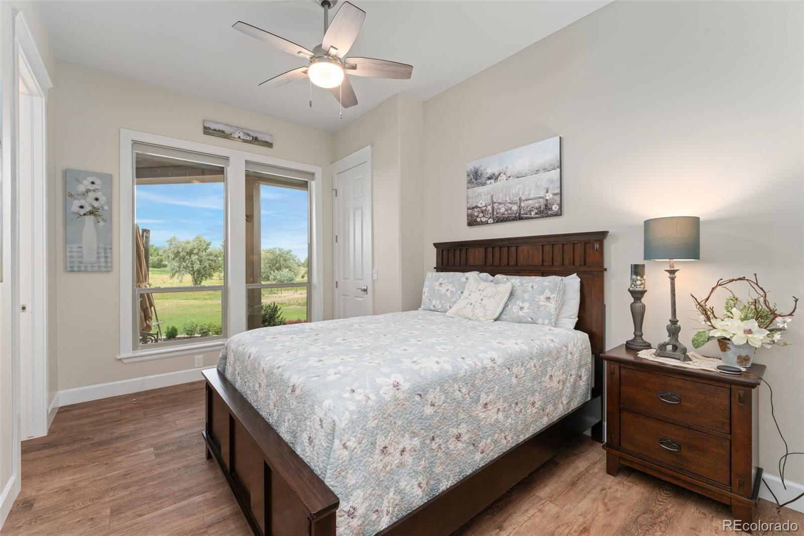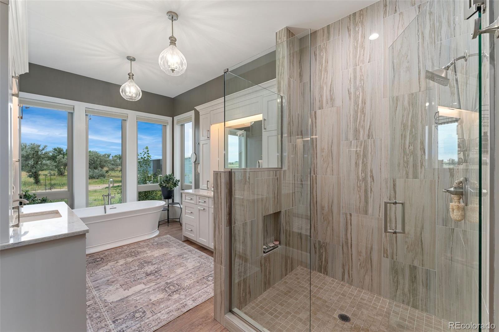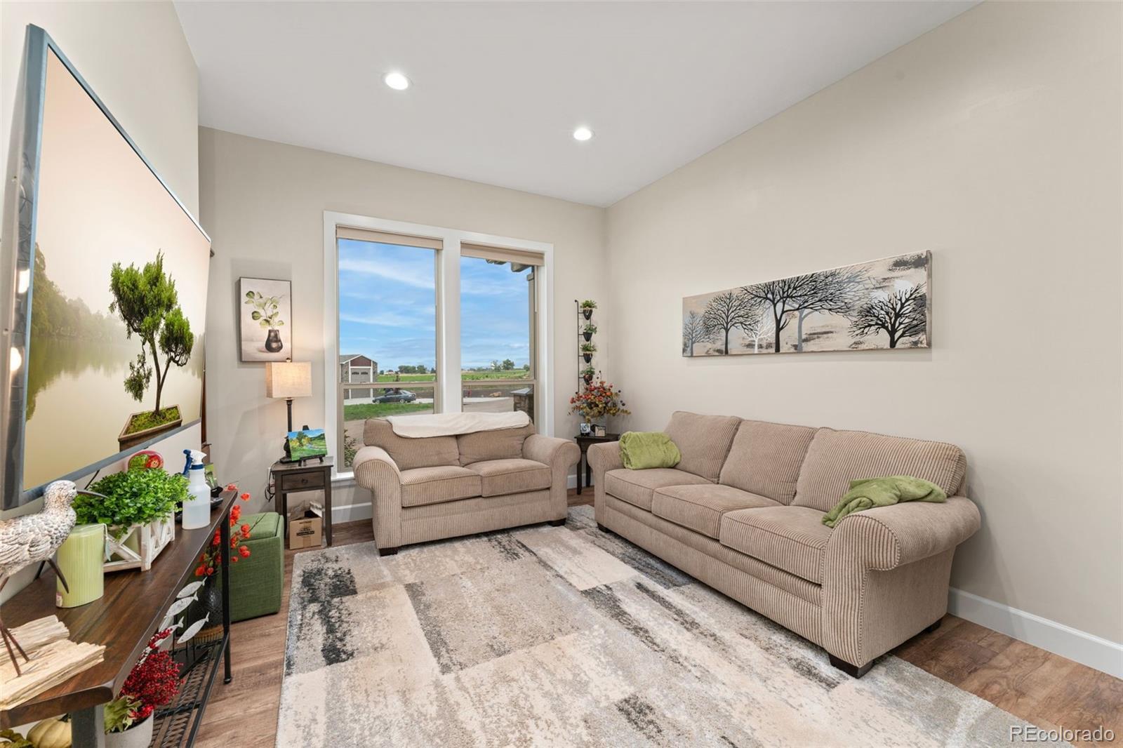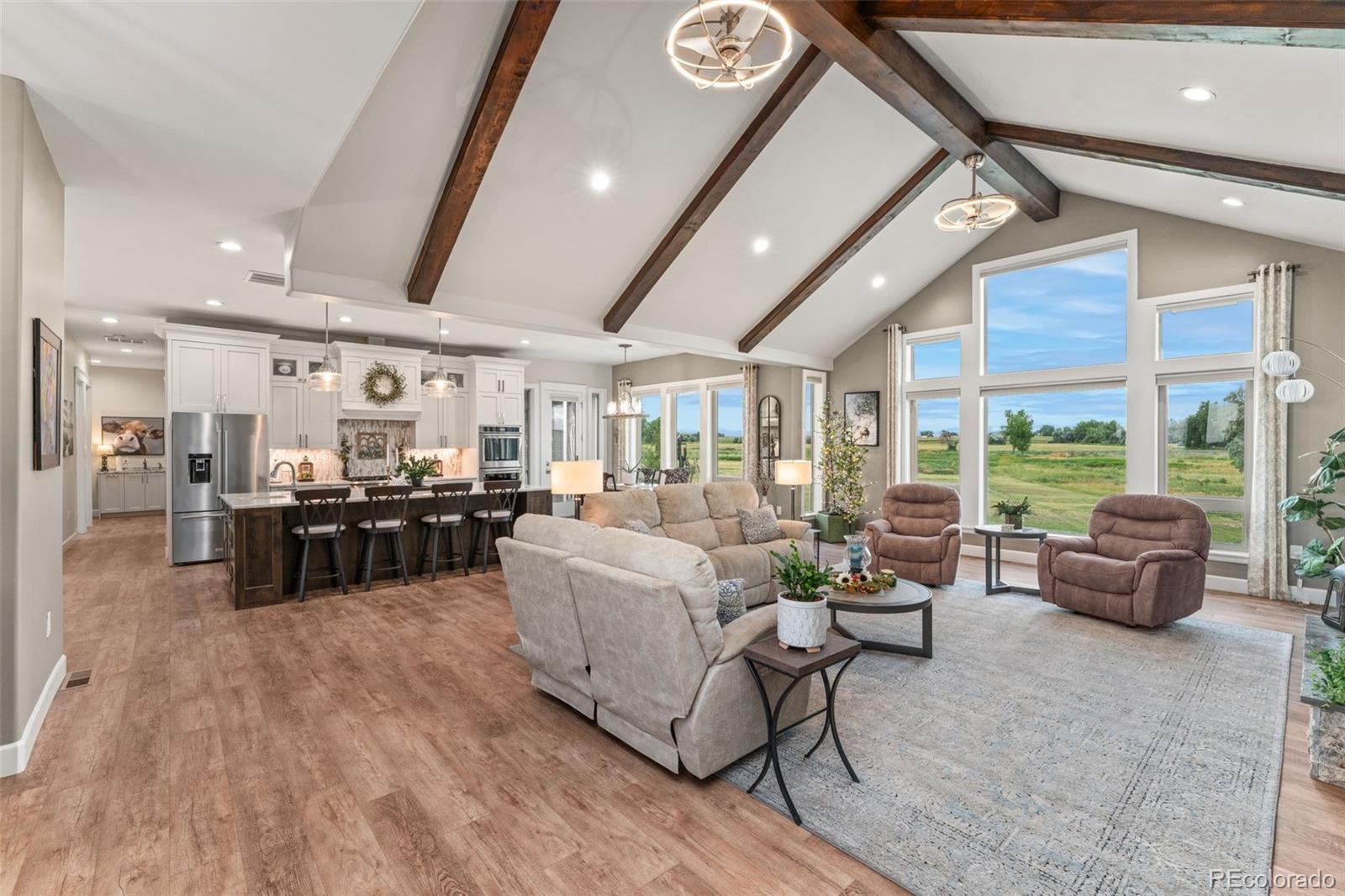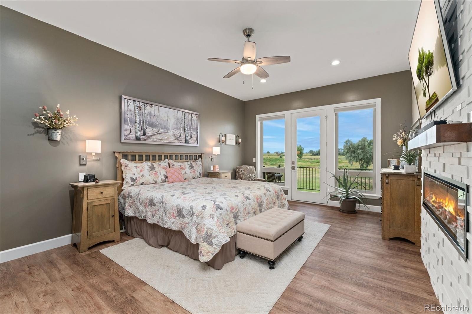 Experience luxury, space, and stunning mountain views in this breathtaking 6-bedroom, 5-bath custom ranch on 3.1 acres! Just 8.5 miles from Longmont, 18 from Boulder, 31 from DIA, and with quick I-25 access, the property is surrounded by farms and a permanent conservation easement, offering peace and privacy. The gourmet kitchen features custom cabinetry, quartz counters, abundant storage, and opens to a vaulted, wood-beamed great room with a cozy fireplace and walls of windows showcasing the views. The primary suite includes a private fireplace, deck, and spa-like bath with freestanding tub, dual sinks, and large shower. A dedicated main-level office and guest suite with en suite bath provide convenience and comfort. The spacious walk-out basement offers a wet bar, family room with fireplace, and three versatile bedrooms for guests, hobbies, or fitness. A large bedroom with en suite bath is ideal for multi-generational living. Car enthusiasts and RV owners will love the insulated 6-car tandem garage with hot and cold water spigot located in the attached garage ideal for washing vehicles, cleaning equipment, or other utility needs. RV and toy owners will appreciate the massive, insulated RV garage with 13-ft doors. This southwest-facing walkout home is built on concrete piers with steel beams and insulated concrete forms. It has a whole-house recirculation system that provides near-instant hot water to every sink, tub, and shower. You can be confident with the new Class 4 impact-resistant roof and transferable warranty. The professionally designed Xeriscape features native grasses and plants with efficient drip irrigation, highlighted by LED landscape lighting that sets the mood for enjoying the covered patio and outdoor fireplace—perfect for Colorado evenings. Each floor features its own dedicated furnace and A/C unit for efficient, customizable climate control.