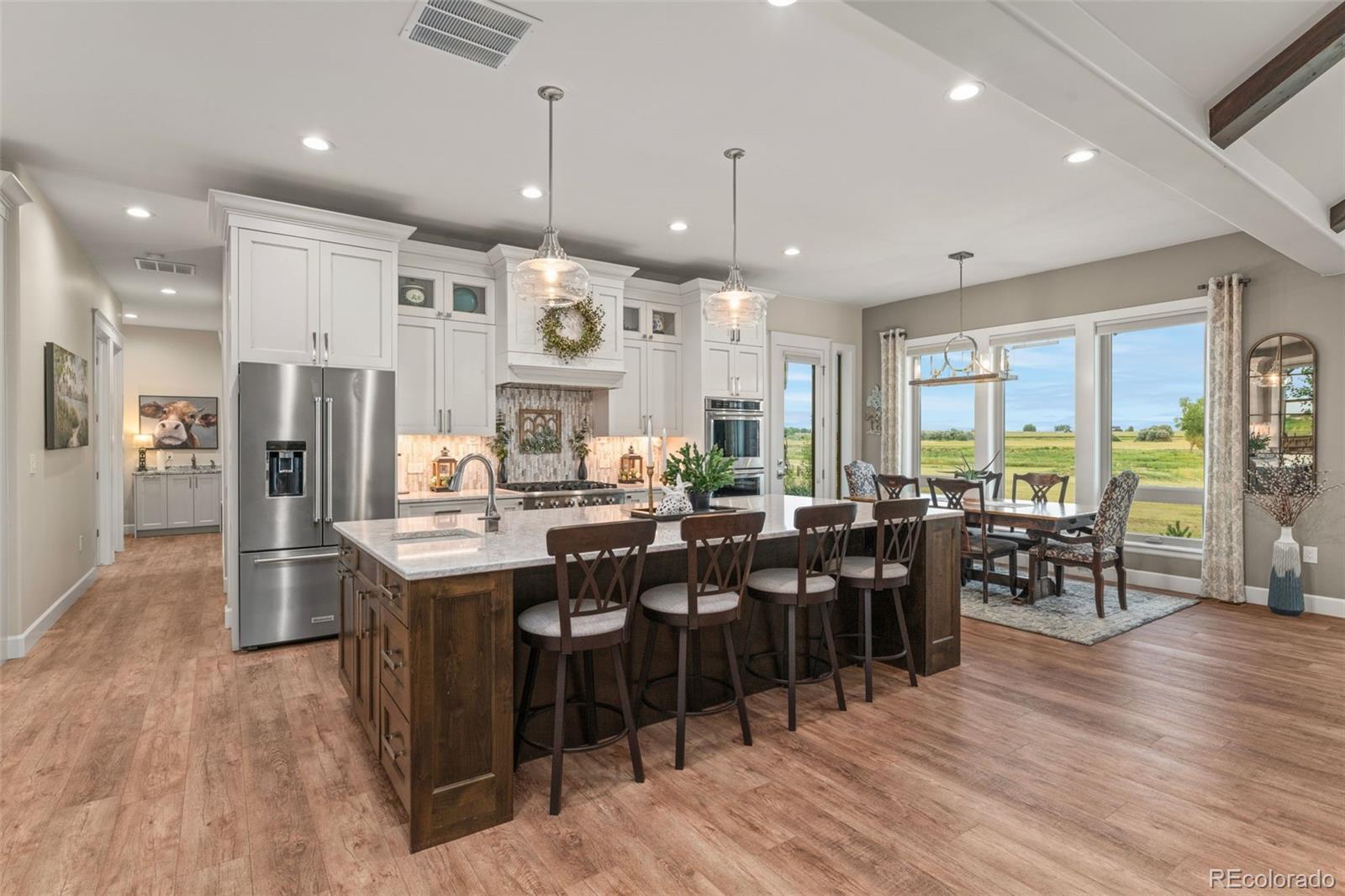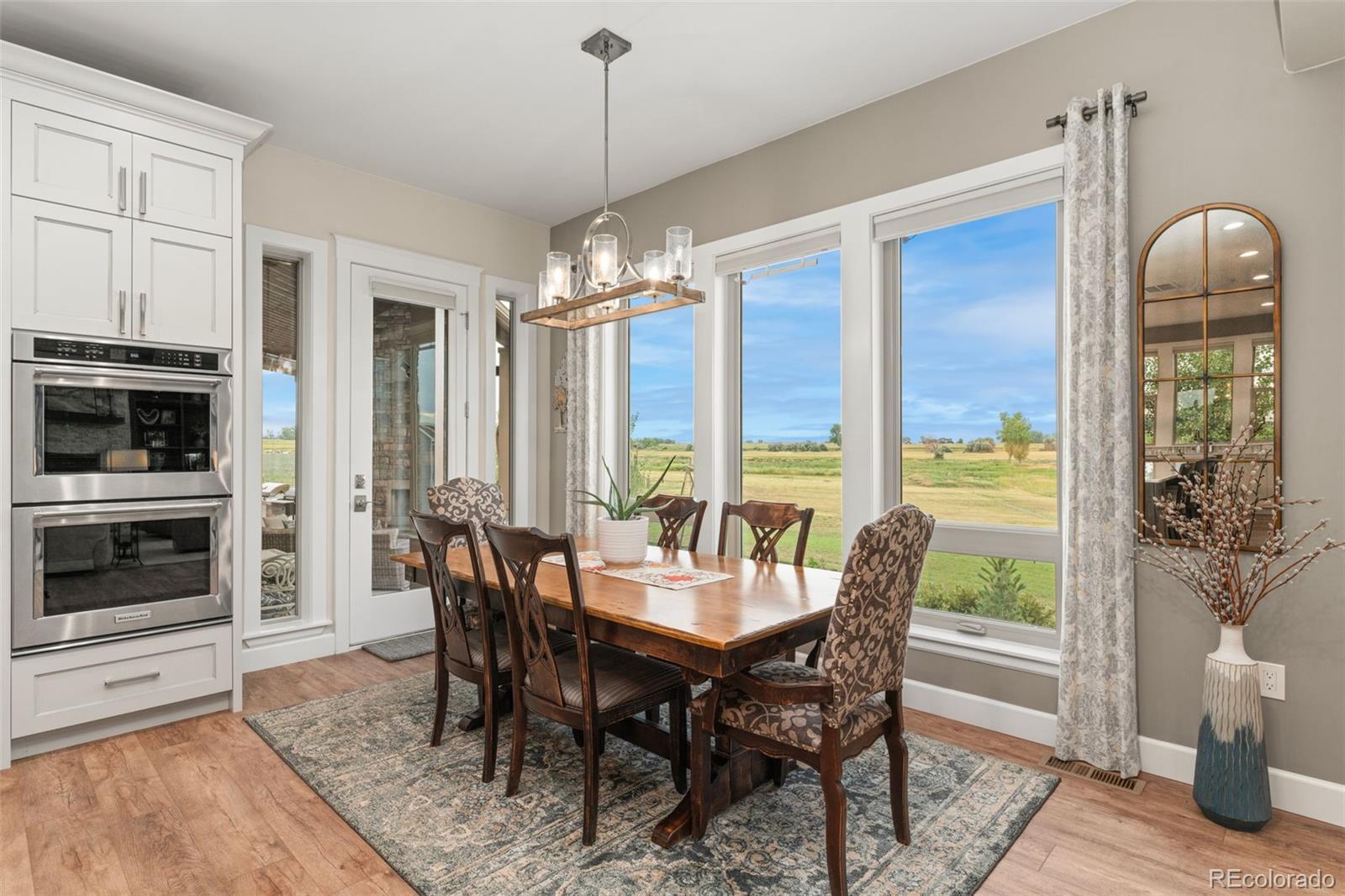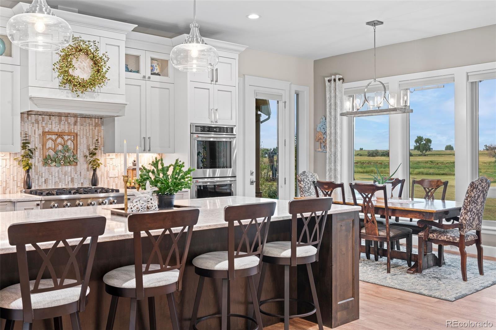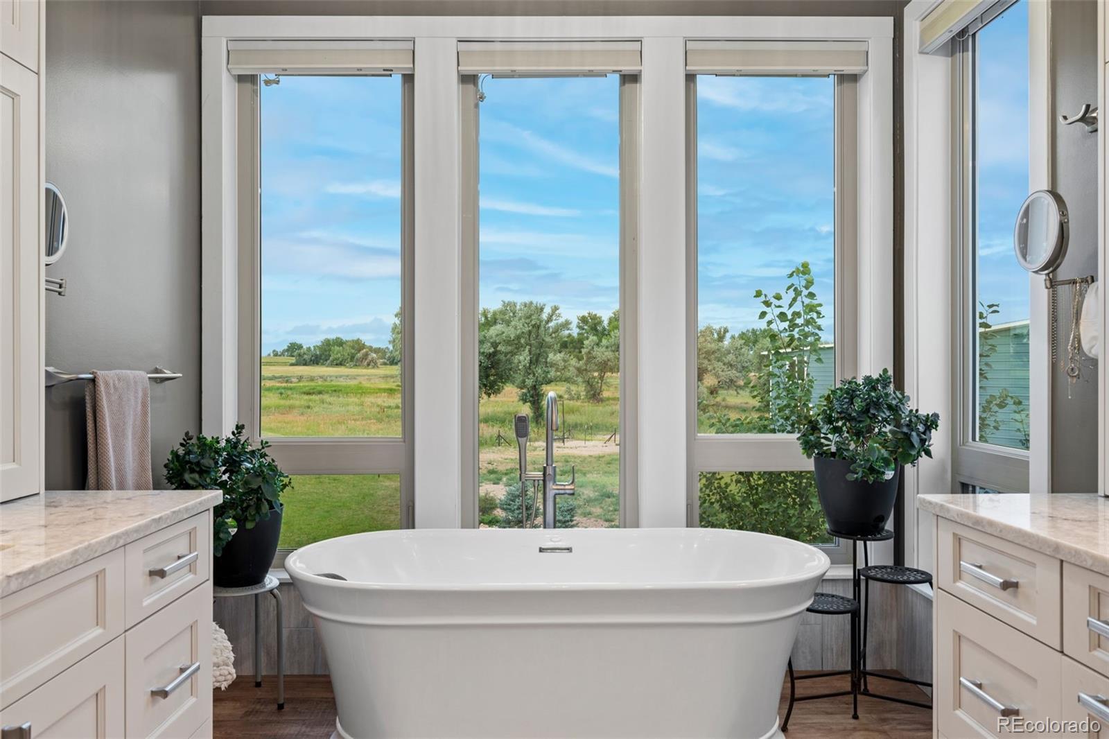 Experience luxury, space, and stunning mountain views in this breathtaking 6-bedroom, 5-bath custom ranch on 3.1 acres! Just 8.5 miles from Longmont, 18 from Boulder, 31 from DIA, and with quick I-25 access, the property is surrounded by farms and a permanent conservation easement, offering peace and privacy. The gourmet kitchen features custom cabinetry, quartz counters, abundant storage, and opens to a vaulted, wood-beamed great room with a cozy fireplace and walls of windows showcasing the views. The primary suite includes a private fireplace, deck, and spa-like bath with freestanding tub, dual sinks, and large shower. A dedicated main-level office and guest suite with en suite bath provide convenience and comfort. The spacious walk-out basement offers a wet bar, family room with fireplace, and three versatile bedrooms for guests, hobbies, or fitness. A large bedroom with en suite bath is ideal for multi-generational living. Car enthusiasts and RV owners will love the insulated 6-car tandem garage with hot and cold water spigot located in the attached garage ideal for washing vehicles, cleaning equipment, or other utility needs. RV and toy owners will appreciate the massive, insulated RV garage with 13-ft doors. This southwest-facing walkout home is built on concrete piers with steel beams and insulated concrete forms. It has a whole-house recirculation system that provides near-instant hot water to every sink, tub, and shower. You can be confident with the new Class 4 impact-resistant roof and transferable warranty. The professionally designed Xeriscape features native grasses and plants with efficient drip irrigation, highlighted by LED landscape lighting that sets the mood for enjoying the covered patio and outdoor fireplace—perfect for Colorado evenings. Each floor features its own dedicated furnace and A/C unit for efficient, customizable climate control.
