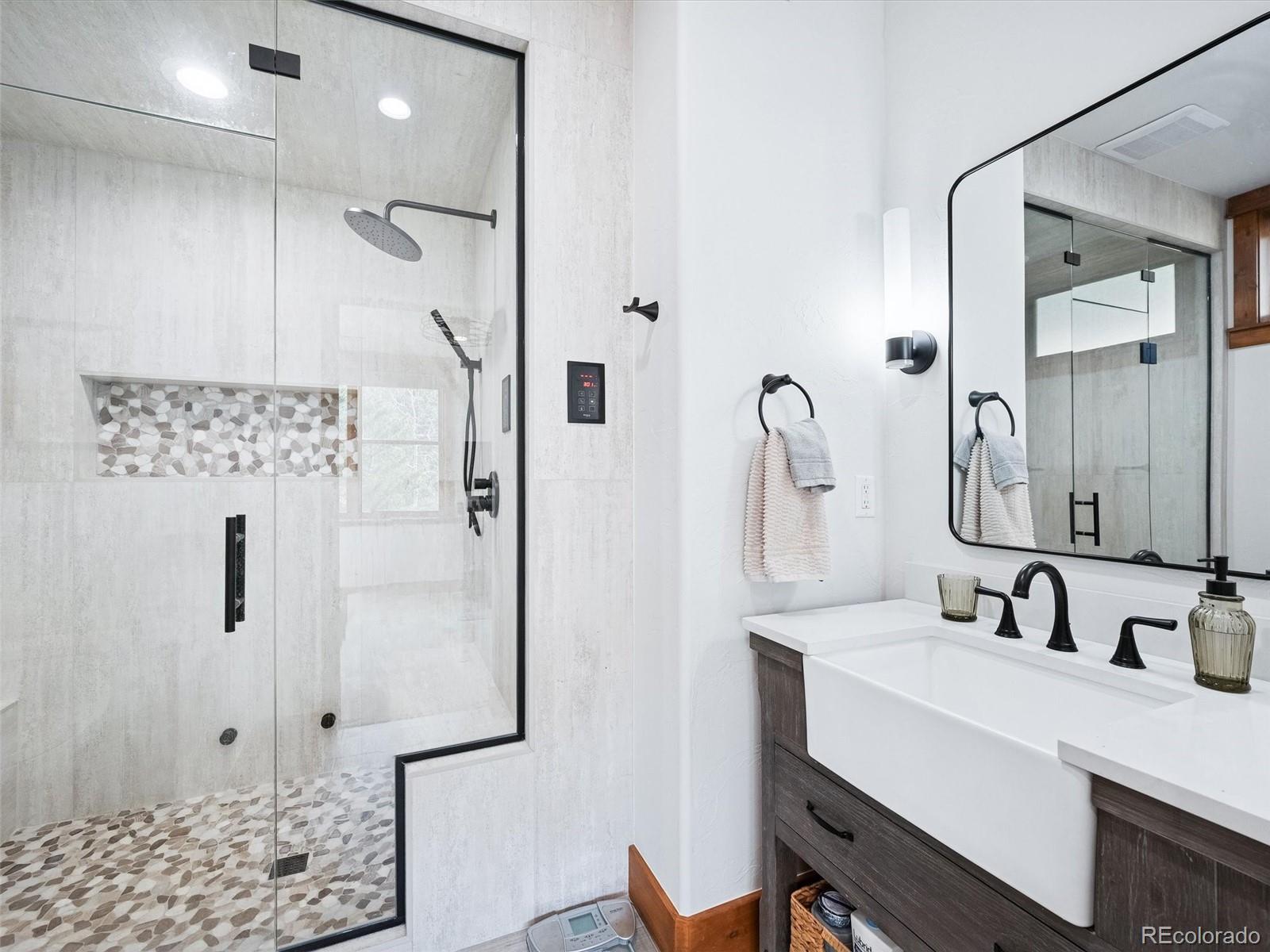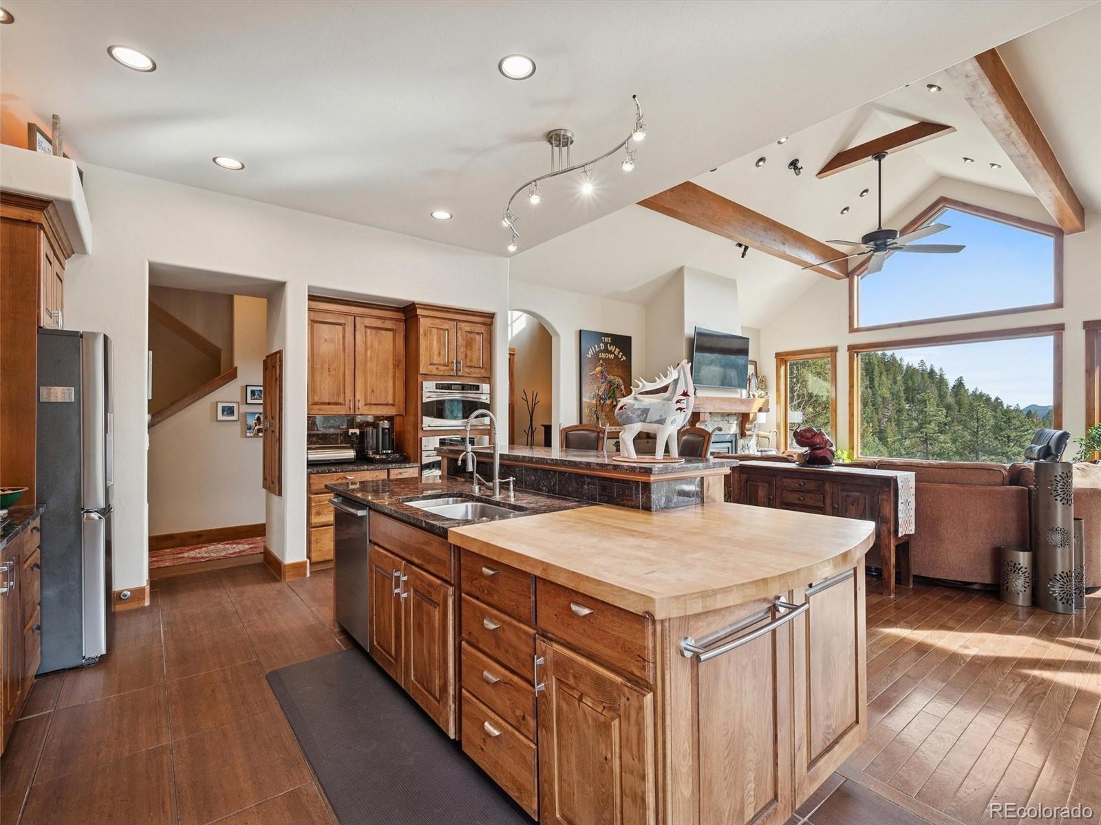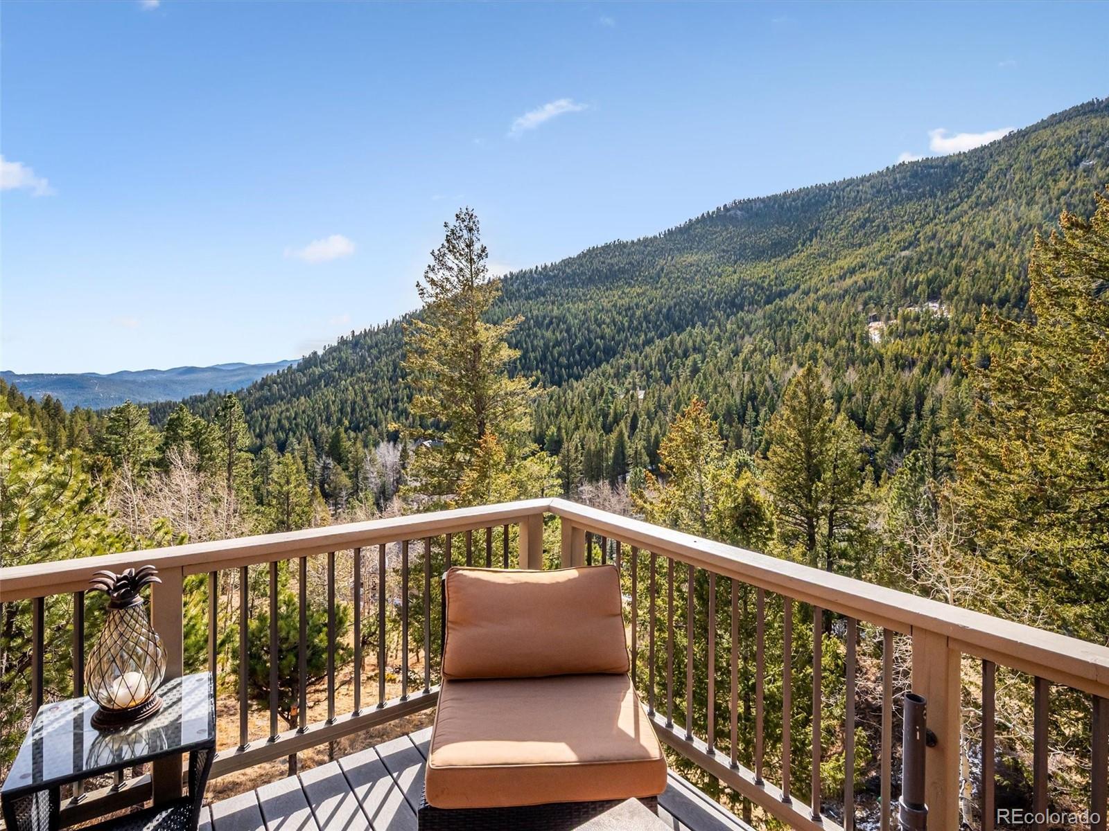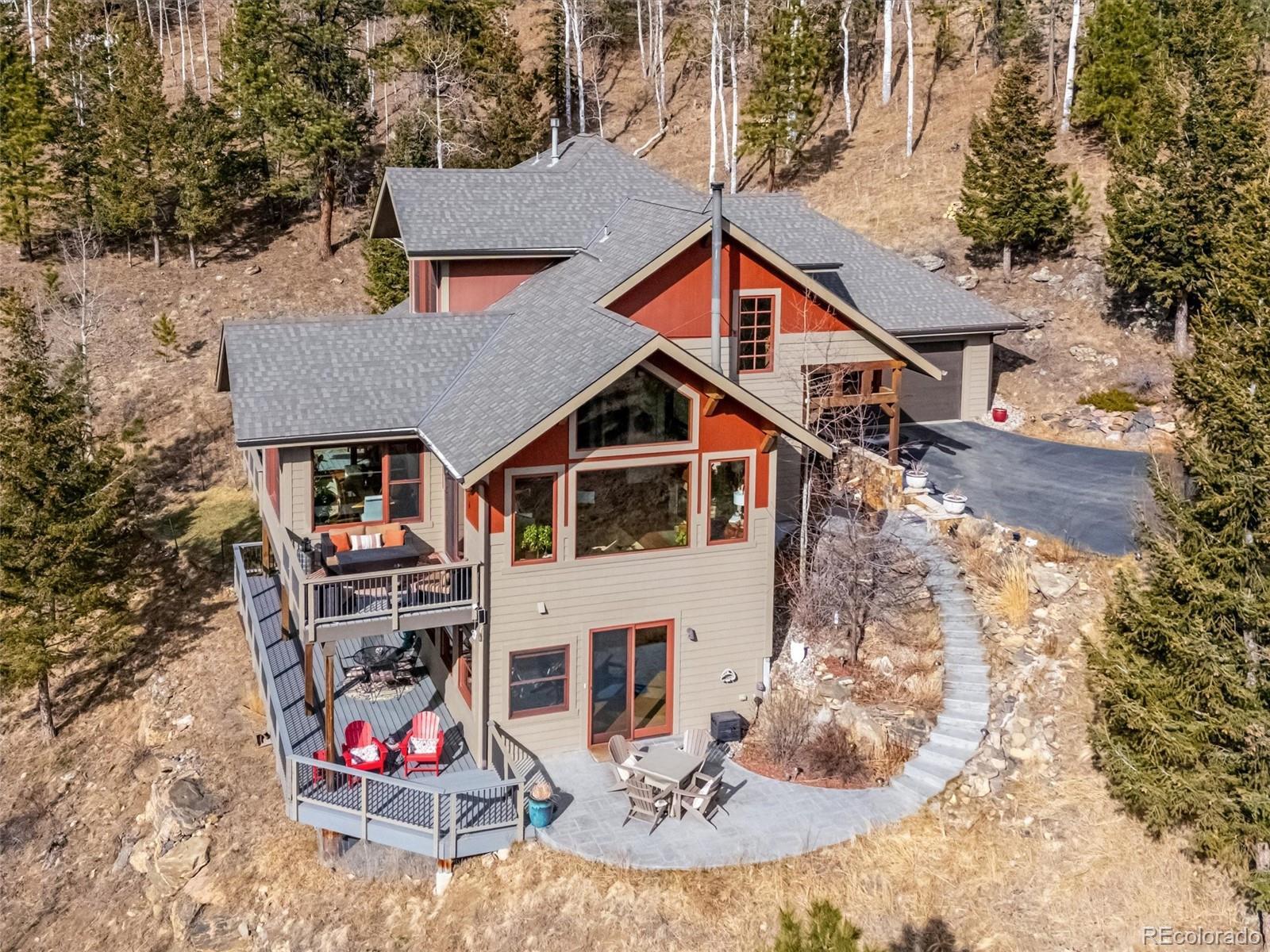 Expansive mountain views and exceptional craftsmanship define this finely appointed contemporary mountain residence. Originally built and owned by the renowned Tolleson Architects, this home showcases a level of detail and quality typically reserved for ultra-luxury properties, with exquisite custom woodwork and creative touches throughout. The open main level has vaulted ceilings while seamlessly connecting the kitchen, dining area and great room, where a striking stone fireplace anchors the space. Large, thoughtfully framed windows capture sweeping southern valley vistas and dramatic western mountain peaks, flooding the home with natural light. The chef-ready kitchen is beautifully appointed with butcher block and granite countertops, knotty birch cabinetry, island seating, and a walk-in pantry. Completing the main level is a two-story foyer, well-appointed guest bedroom, full bathroom and convenient mudroom directly off the garage entrance. Upstairs, the primary suite offers a private retreat with mountain views, a five-piece ensuite bathroom with a jetted tub and expansive stone shower, along with his-and-hers closets and an extra storage area. The walk-out lower level provides exceptional flexibility and comfort, featuring a large recreation room, two additional bedrooms, and two bathrooms, including a recently completed ensuite bath with a large steam shower. Three decks provide many choices for your outdoor entertainment and endless wildlife viewing, along with a beautiful curved concrete stamped stairway leading to a lower patio and fenced grass area for your pet. Come spring and summer enjoy the many wildflower gardens and landscaping features the sellers have graciously added to this mountain oasis. A 2½-car garage offers EV electric, ample space for vehicles and storage of all your mountain gear. This home truly embodies the lifestyle that draws people to Colorado—thoughtful design, refined finishes, and unforgettable mountain surroundings.