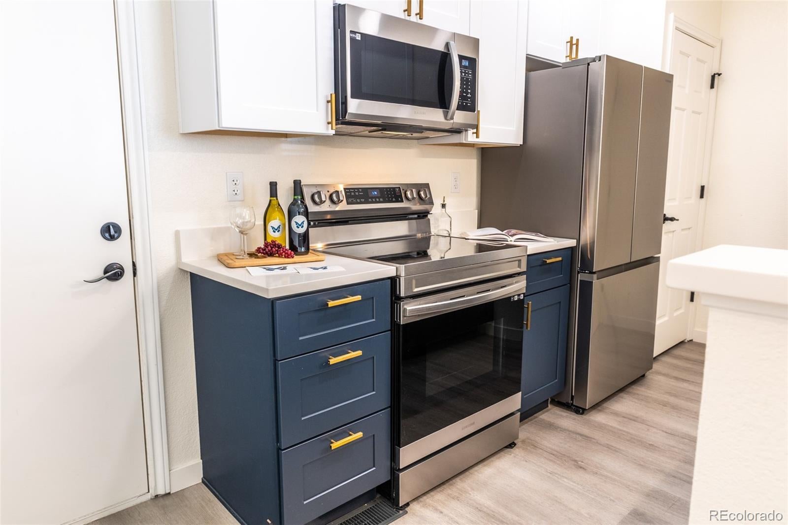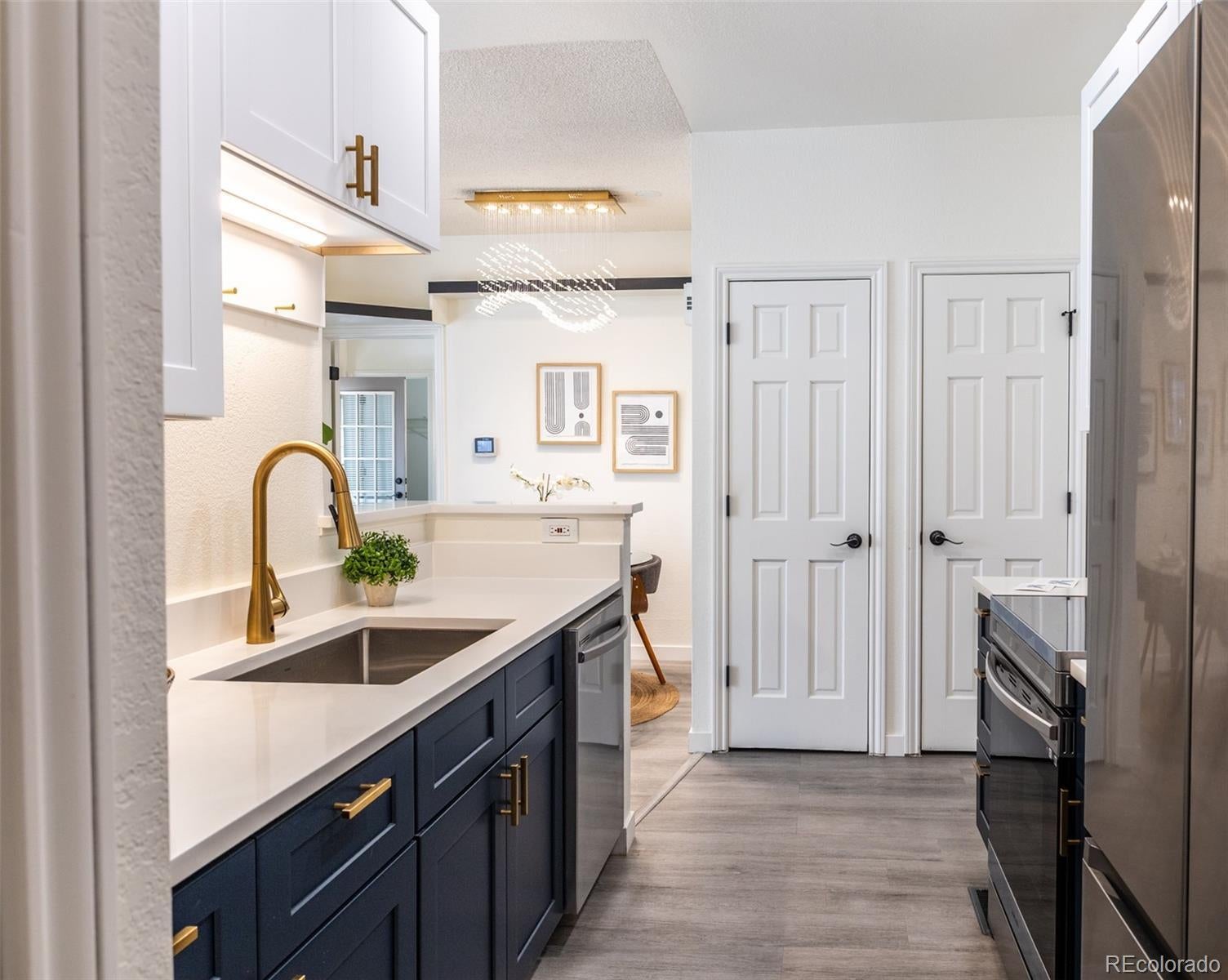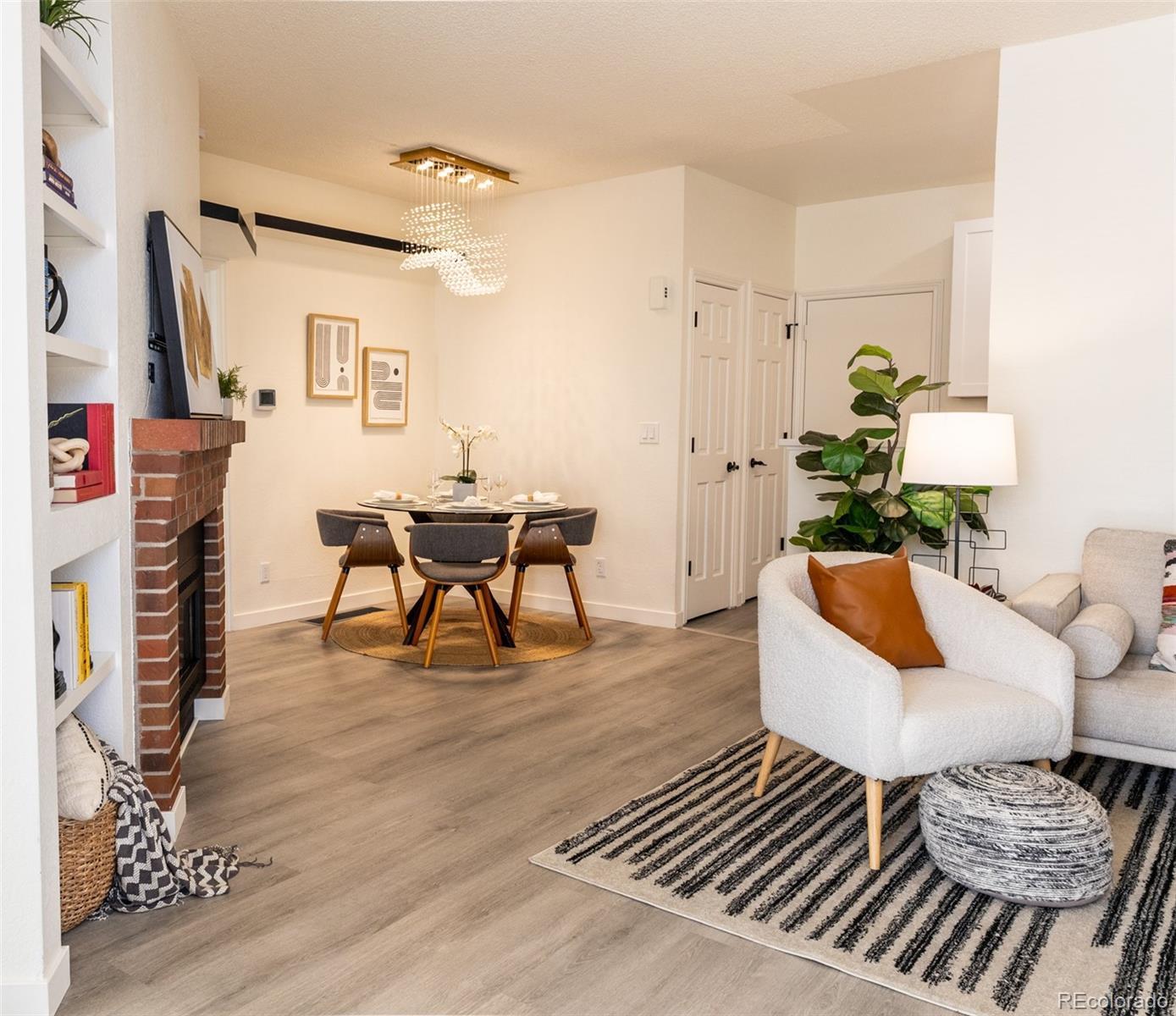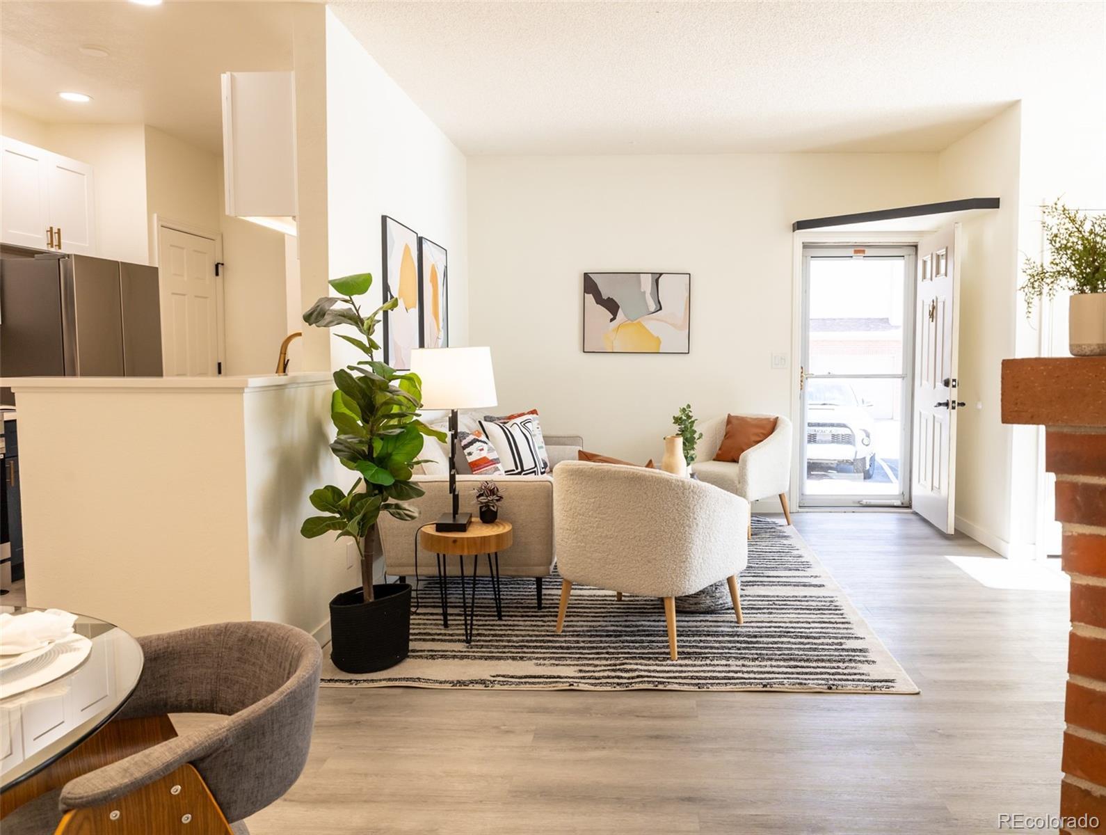 Welcome home to this beautifully updated, ground-level, end unit condo in the Steeplechase community. Thoughtful finishes, a functional layout, and a prime Littleton location make this well-cared-for home truly move-in ready, offering comfort and style with low-maintenance living. The kitchen was fully renovated in 2023 and features two-toned cabinetry with white uppers and deep blue lowers, copper-toned fixtures, ample storage, and newer appliances. New luxury vinyl plank flooring runs through the main living areas, while both bedrooms feature carpet. The spacious living room is centrally located and anchored by a gas fireplace, creating a comfortable gathering space. The primary suite offers excellent sound insulation, a walk-in shower, multiple walk-in closets, and direct access to a private patio with additional outdoor storage. In-unit laundry includes a GE washer and dryer, and both the furnace and water heater have been serviced within the past year. Additional conveniences include an attached one-car garage with storage, guest parking access, and a well-managed HOA that covers exterior maintenance, snow removal, landscaping, and common area upkeep. Community amenities include an outdoor pool, gazebo, and shared outdoor spaces. Located just steps from the South Platte River, residents enjoy easy access to an extensive trail system ideal for walking and biking, while still being close to downtown Littleton, parks, shopping, dining, and everyday amenities. A great opportunity for comfortable, connected living in a peaceful setting.
