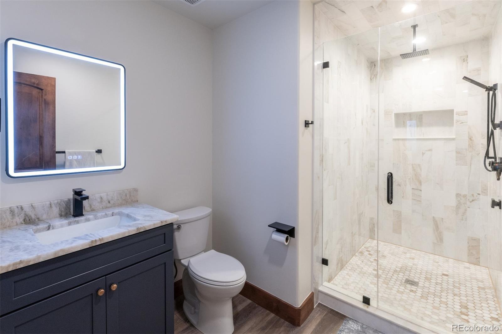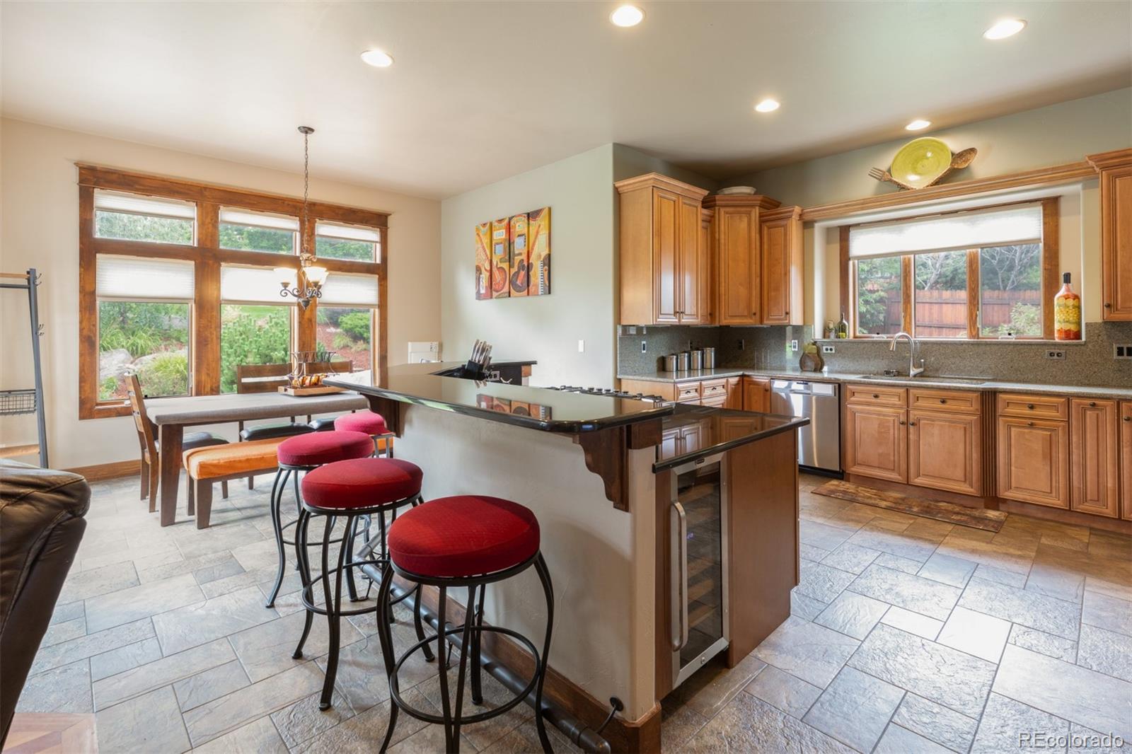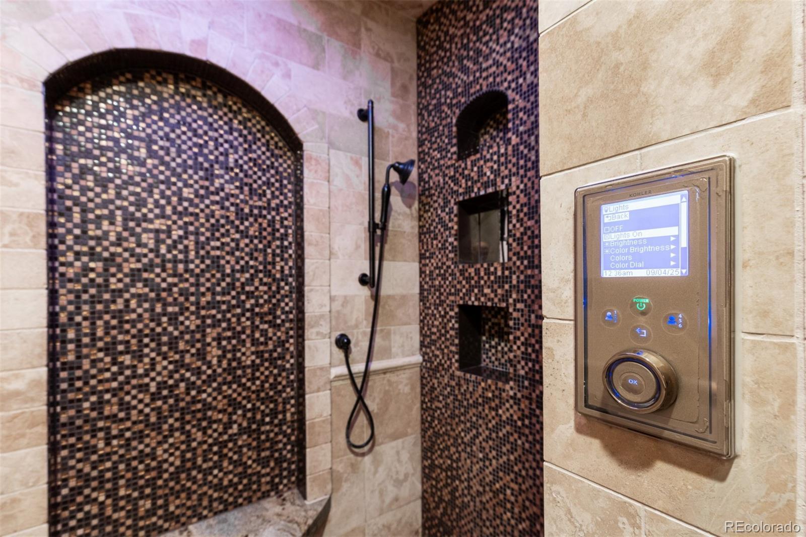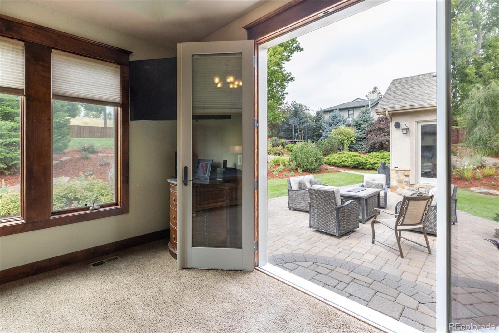 Tucked away on nearly an acre,this 5 bed 6 bath retreat lives like a private resort. Mature landscaping, fruit trees & bordered by open space,this rare find in Golden is built for effortless indoor/outdoor living. Step into a soaring two-story foyer & be greeted by glowing Cherry wood floors, setting the tone for refined & modern design in this fully integrated Lutron smart home. A wall of windows welcome you to the main floor primary suite,a true haven w/ patio access, his & her closets, a luxury bath w/ a jetted tub & an indulgent steam shower w/13 heads, surround sound, custom lighting & towel warmer. A private office tucked just off the primary offers custom built-ins & sweeping views of landscaped grounds. The gourmet kitchen opens to a sunny eating area w/ floor to ceiling sunshine & access outside. Stainless GE Profile appliances, including 2 convection ovens, wine cooler, custom Alder cabinetry w/ pull out shelving & soft close drawers & a chef's island outfitted w/additional gas burners. You'll also find a generous pantry w/an extra built in fridge/freezer for real life convenience. The mudroom delivers w/organized storage off the insulated 3 car garage, & the main level laundry blends practical design w/style & function.The upper level offers 3 spacious bedrooms:one a private en-suite & the other two sharing a well designed Jack & Jill. All 3 enjoy walk-in closets & plenty of natural light. A custom Italian pivot-door reveals the 'chef's kiss' of a newly finished daylight basement. A rough stacked marble wet-bar, exposed beams wrapped in Alder, 10' ceilings & drink ledges, show craftsmanship & true attention to detail, while a theater ready media wall w/integrated surround sound is built for game-day energy. You'll find a 2nd beautifully designed primary suite, generous storage & a guest powder room to further enhance the space.Finally, Colorado living steals the show w/a fully equipped outdoor kitchen in your backyard oasis,complete w/ retractable awning.