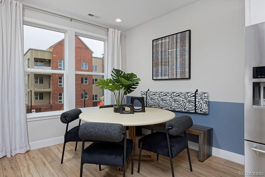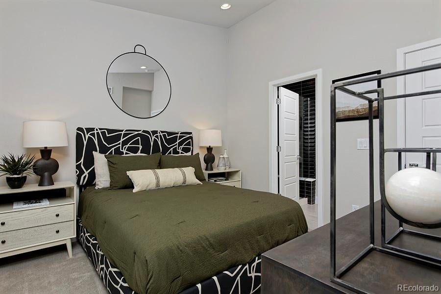 Incredible views in a prime location, just steps from to Loretto Heights Park.. Discover your new home in the vibrant Loretto Heights neighborhood, just 10 minutes from Downtown Denver. This historic area is rich in character and offers exceptional access to shopping, dining, entertainment, and transportation, keeping you close to everything that matters. Step inside this modern, thoughtfully designed home where style meets functionality. The main level features a stunning kitchen with a large island, sleek stainless-steel appliances, and a dedicated dining area ideal for entertaining. The great room, highlighted by an elegant electric fireplace, creates a warm and inviting space to relax and unwind. Upstairs, the primary suite impresses with high ceilings, abundant natural light, and a spacious walk-in closet. The luxurious ensuite bath includes a double vanity, step-in shower with bench, contemporary floor-to-ceiling tile, and an outlet ready for a future heated toilet seat. A convenient laundry room with washer and dryer is included, along with a second bedroom featuring its own private ensuite bath. The entry level offers flexible space perfect for a home office, gym, or media room, and opens to a south-facing front patio and private yard, ideal for enjoying sunny Colorado days. The attached garage provides ample storage and is pre-wired for EV charging. This Thrive home includes pre-paid solar panels, energy-efficient features, a builder warranty, and no monthly HOA fees. Don’t miss this opportunity to own an exceptional property in a sought-after neighborhood. Photos are of model home.