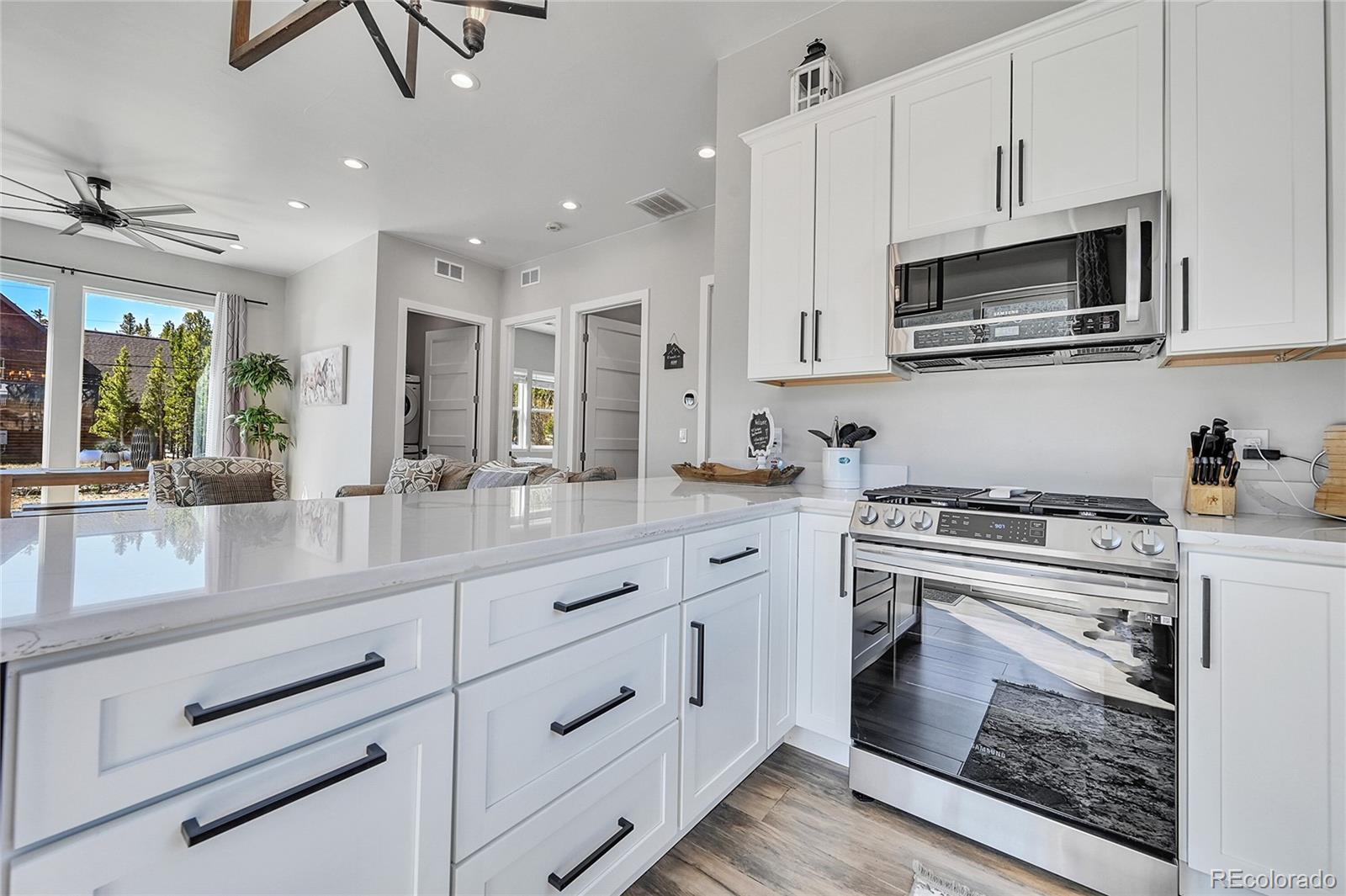 Ceiling Fan(s), Eat-in Kitchen, High Ceilings, No Stairs, Quartz Counters