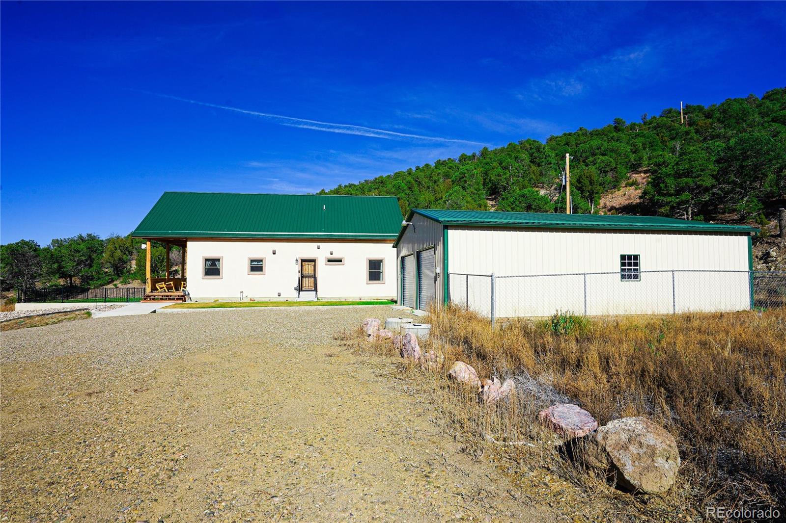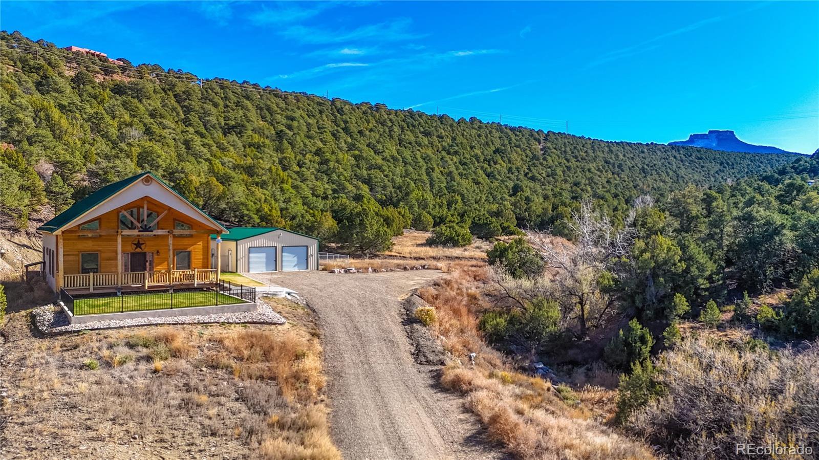 This newer custom-built home is perfectly situated just outside the historic city of Trinidad, offering both convenience to town and the privacy of 12 acres. Surrounded by trees and natural beauty, the property boasts stunning views of the Sangre de Cristo and Spanish Peaks mountain ranges as well as Fishers Peak. Inside, you'll find custom hardwood floors, a striking log banister, and spacious bedrooms, including a master suite with a huge walk-in closet. The open upstairs area provides flexible space for a family room, office, 2 additional bedrooms, or entertainment, while the kitchen is designed for both style and function with granite countertops, a pantry, and stainless steel appliances. Outdoors, the fenced yard is ideal for dogs, and the oversized two-car garage includes an office area and a convenient entryway for pets. This home combines modern comfort with rustic charm, making it a perfect retreat for those seeking seclusion without sacrificing proximity to town.