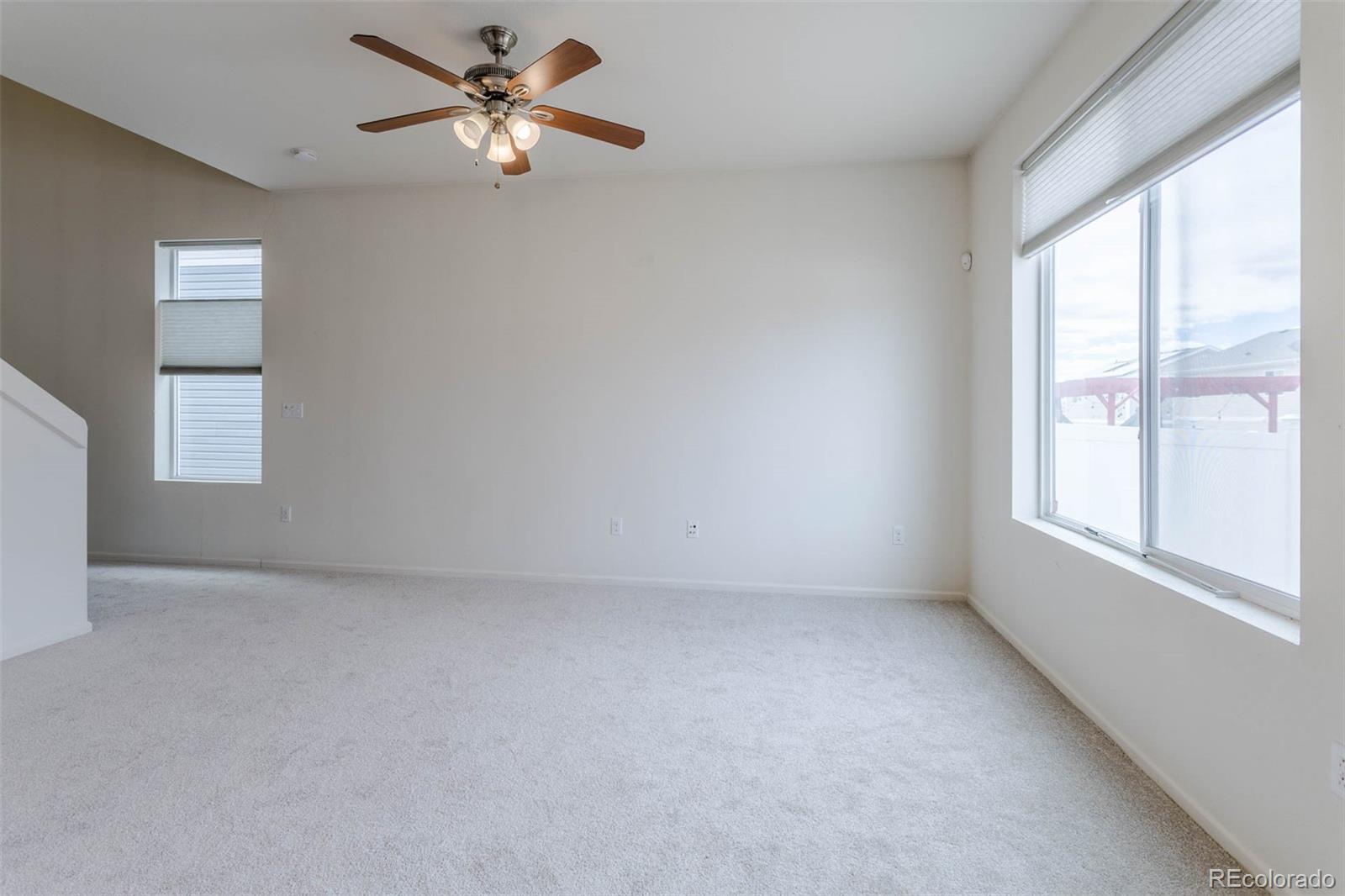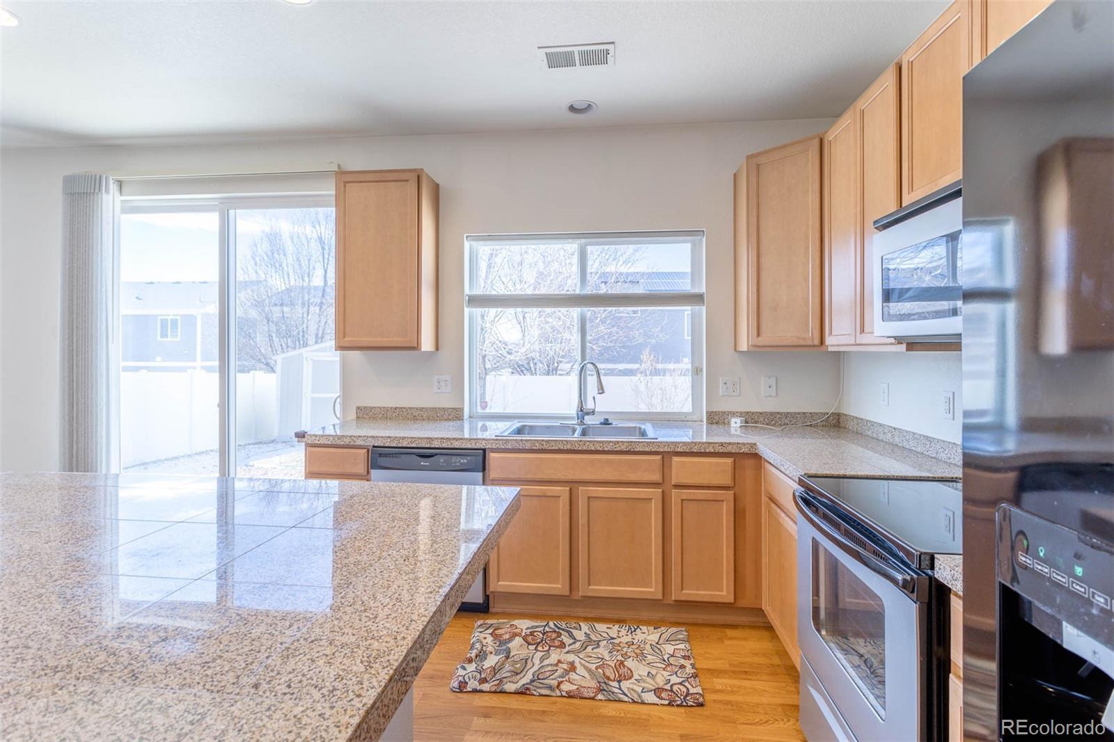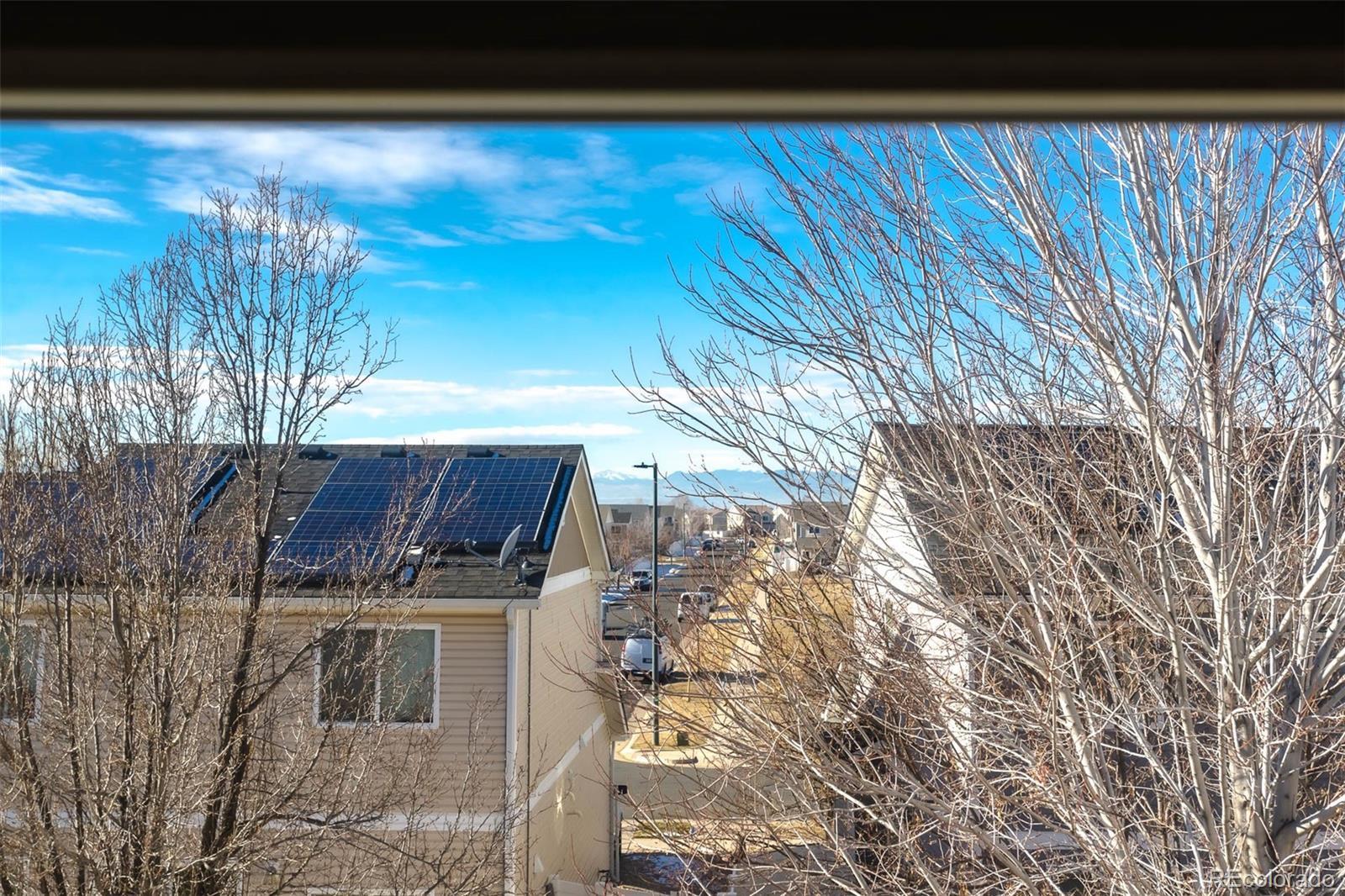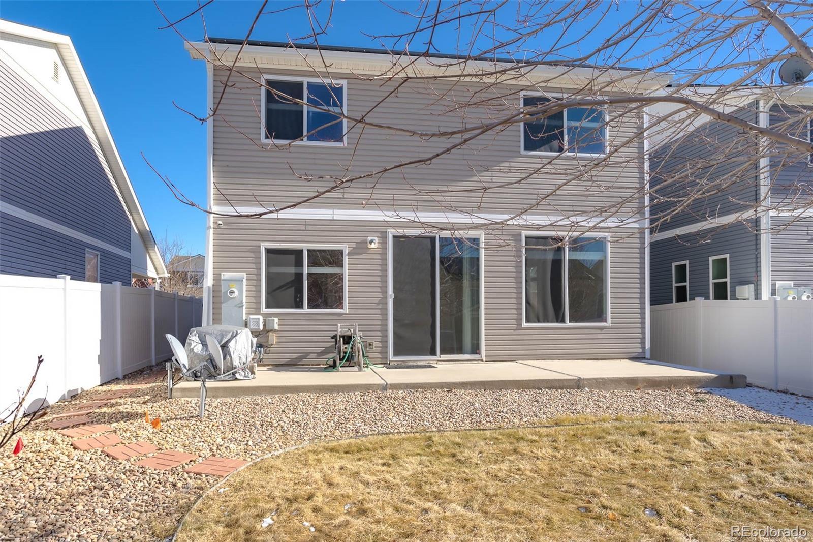 Filled with natural light from the west facing windows, you will love the spacious and open floorplan of this lovely home just minutes from Denver International Airport. As you enter from the covered porch, you will find a powder room, living room with soaring vaulted ceilings and a well-appointed kitchen with an island that accommodates bar stools. Granite counters, lovely light cabinets and stylish appliances complete the bright kitchen. Laundry is conveniently located as you enter from the 2-car garage. Upstairs you will find the primary bedroom with attached 3/4 bath and walk in closet. The walk-in shower with a large bench was just installed. There are 2 additional bedrooms attached by a Jack & Jill full bath. All new in 2025: carpet just installed throughout the home, up/ down blinds throughout, hot water heater, roof and a section of the backyard fence. There is a nice, level backyard with a large Tuff shed for extra storage. Close to parks, trails and highways, the Green Valley Ranch neighborhood is a great place to call home!