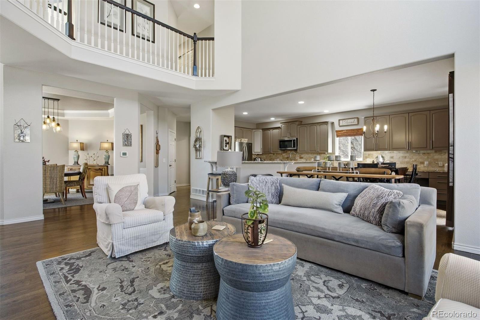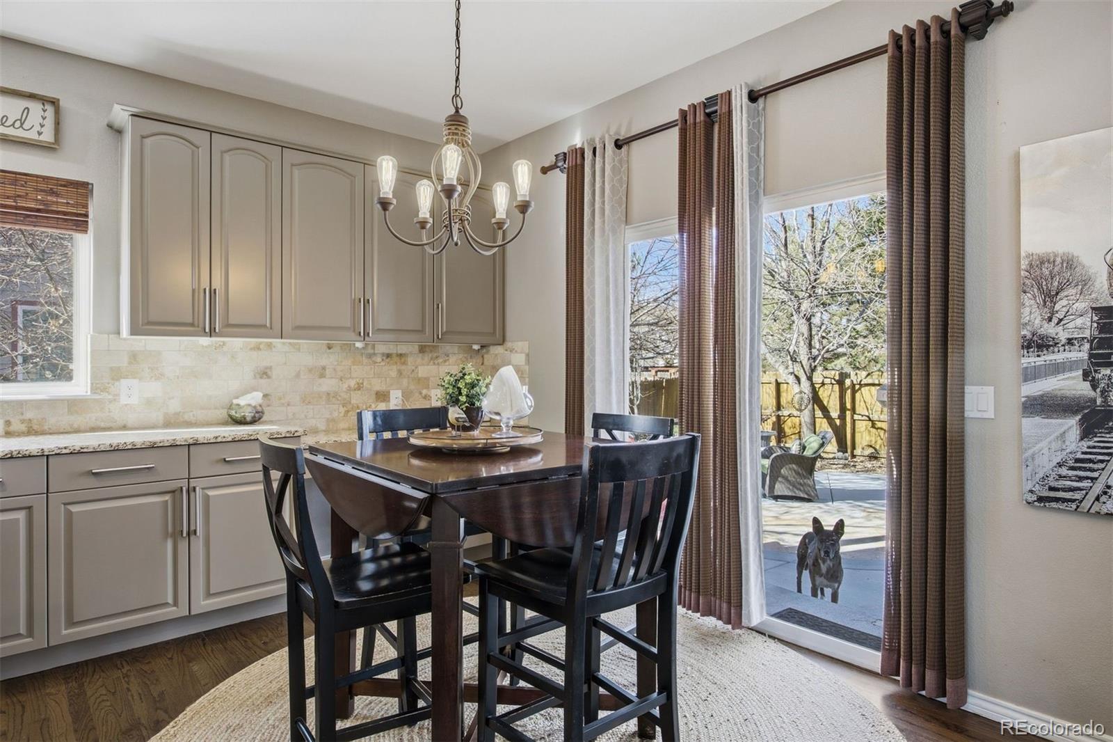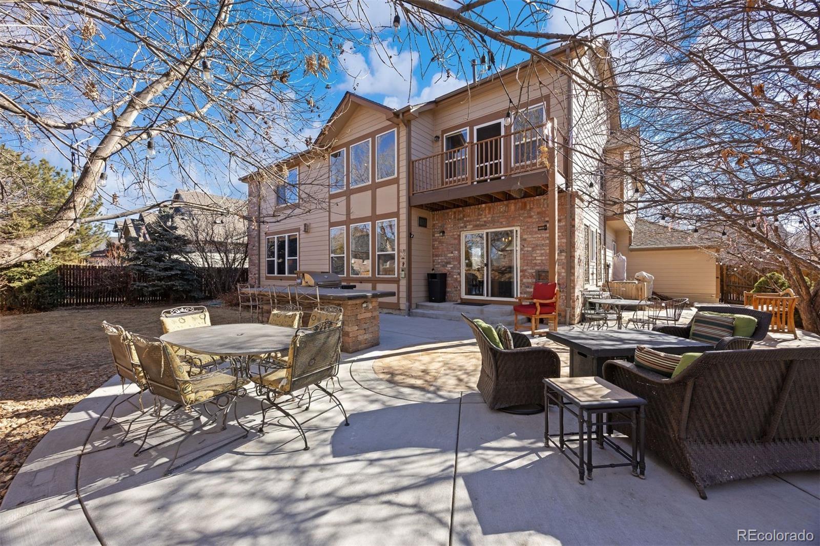 This exceptional two-story home offers 4 bedrooms and 3½ bathrooms and will take your breath away with its style and pristine condition. Thoughtfully designed with open living and dining spaces, the home is filled with natural light from expansive windows throughout. The dramatic two-story family room features a warm stone fireplace accented by built-in glass cabinets and a classic wood mantel — the perfect gathering place for relaxing evenings or entertaining guests. The kitchen is beautifully appointed with granite countertops, stainless steel appliances, double ovens, gas cooktop, dishwasher, and microwave — ideal for everyday living and hosting with ease. A main-floor utility room with cabinetry and sink adds convenience. Upstairs, the spacious primary suite includes a private balcony overlooking the stunning backyard retreat. Three additional bedrooms and two full bathrooms complete the upper level. Additional highlights include solid wood flooring, recently replaced HVAC system, partially finished basement with generous storage, and a spacious 3-car garage. Step outside and prepare to be impressed. The backyard is an entertainer’s dream featuring flagstone and concrete patios and walkways, outdoor kitchen, firepit, and beautifully landscaped, tree-covered surroundings that feel like your own private paradise. Ideally located with convenient access to major interstates, shopping, dining, and highly regarded Cherry Creek Schools. Enjoy nearby Cherry Creek State Park with extensive walking and bike paths, hiking trails, and a renowned off-leash dog park just steps away. Don’t miss this exceptional opportunity!