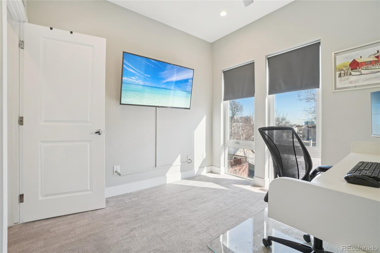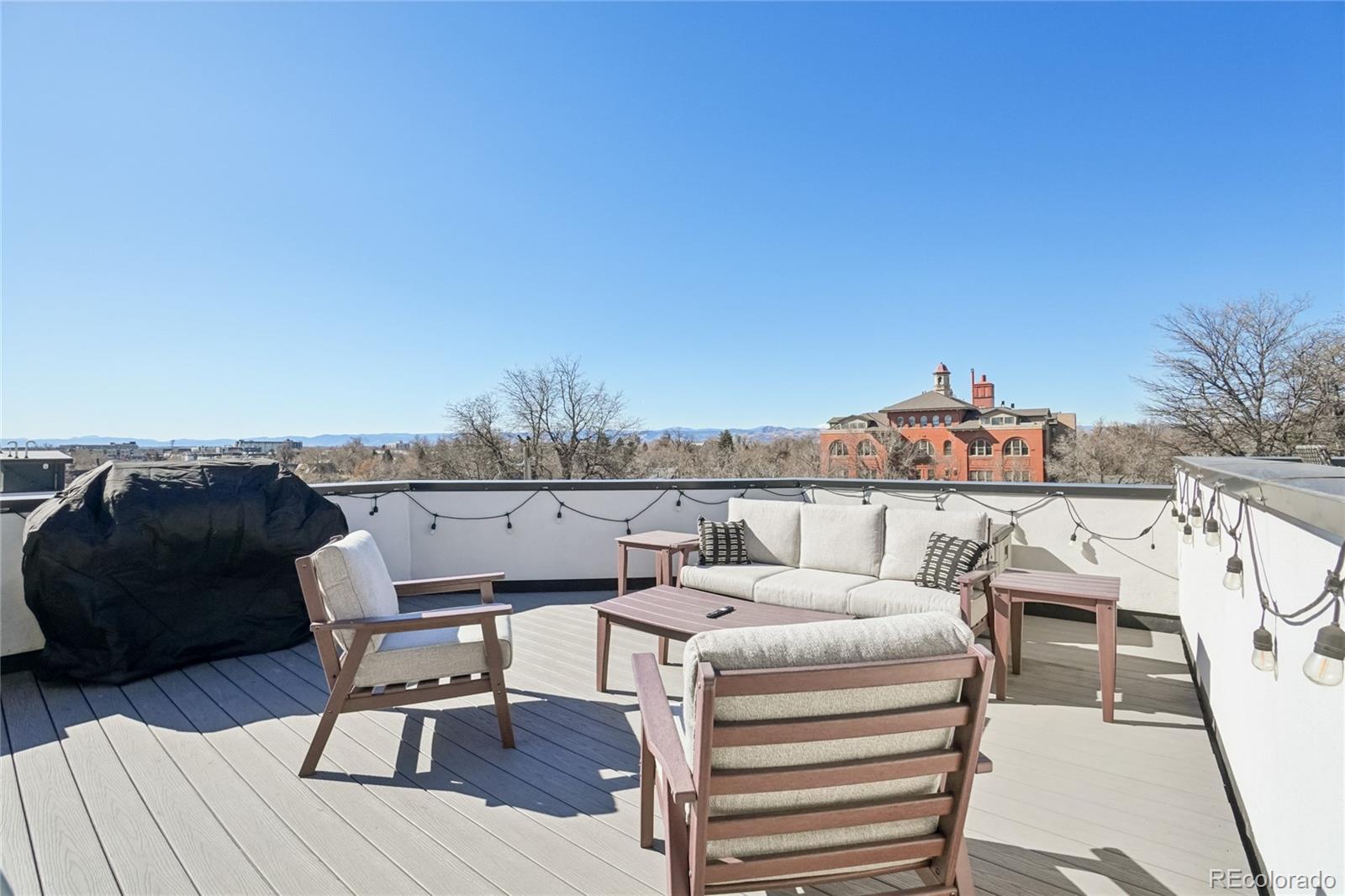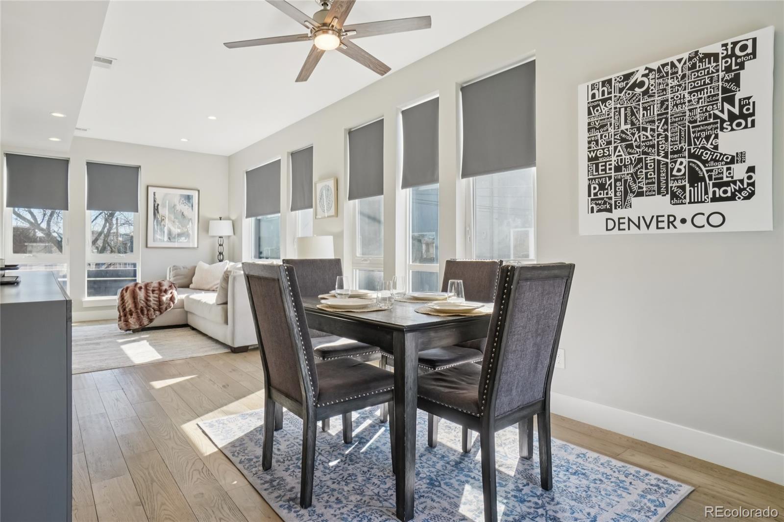 This beautiful end-unit townhome in Denver’s fantastic Jefferson Park neighborhood offers a sophisticated urban retreat with a contemporary, open floor plan. The entry level provides direct access to the attached two-car garage and leads up to the second-floor main living area, which is bathed in abundant natural light through large windows. This level features modern finishes and a seamless flow between the living room, dining room, and a gourmet kitchen equipped with quartz countertops and stainless steel appliances, plus a convenient powder room. The third floor houses the private primary suite, complete with a walk-in closet and a private en-suite bathroom. A second bedroom, full hallway bathroom, and a laundry closet are also located on this level. High-end touches like custom closets and window shades are found throughout the home. One of the most spectacular features is the private rooftop deck, which offers stunning year-round views of both the city skyline and the mountains. With a low-maintenance exterior, this home is designed for effortless urban living. The location provides exceptional walkability to local coffee shops, restaurants, and parks, while offering quick access to downtown, LoHi, Empower Field, and I-25!