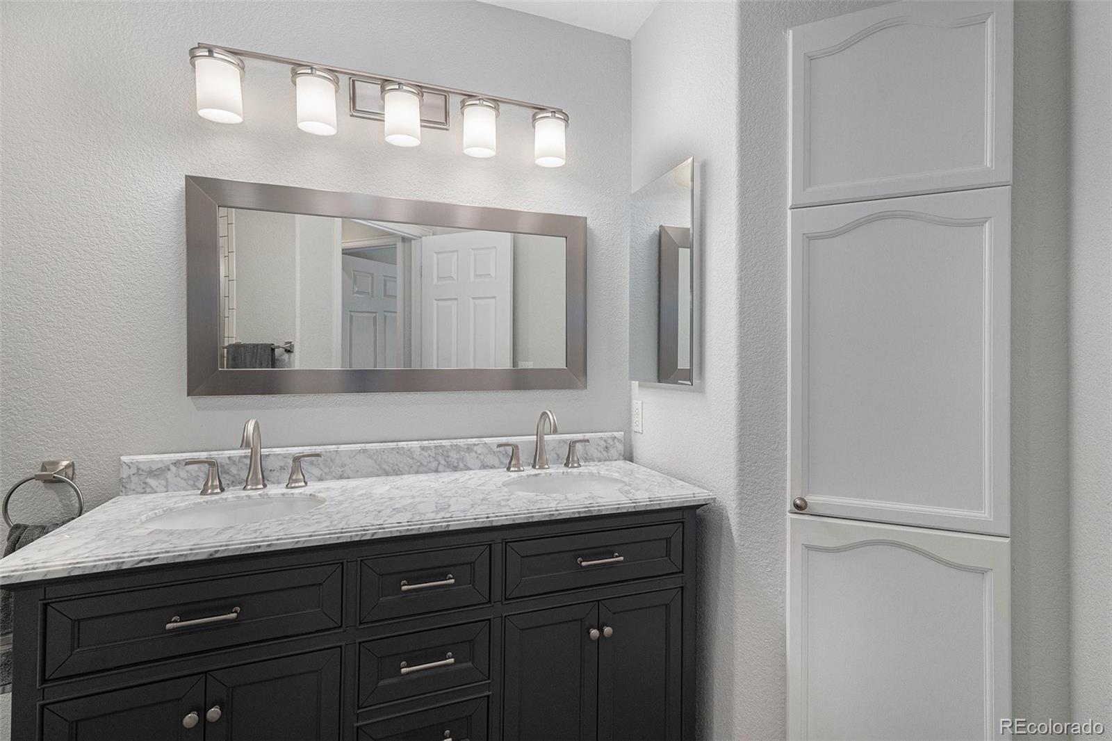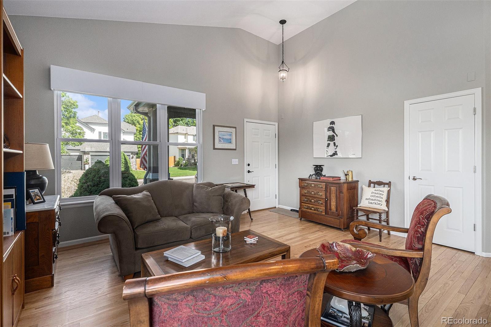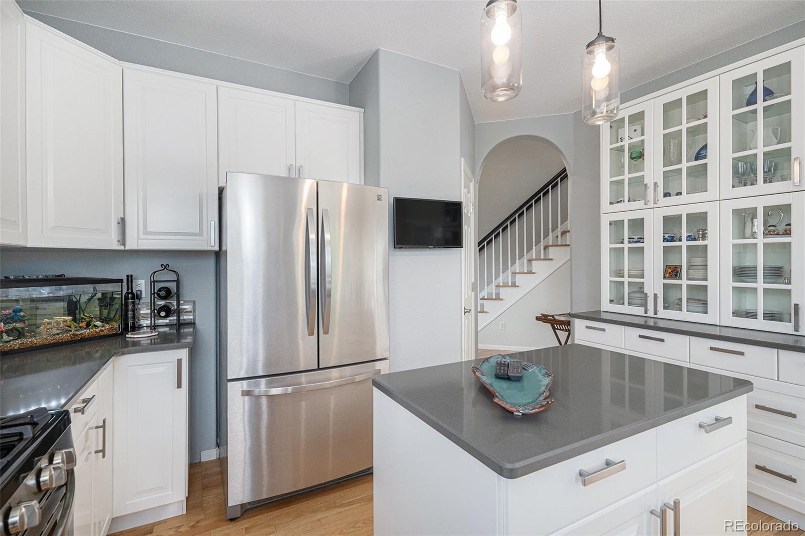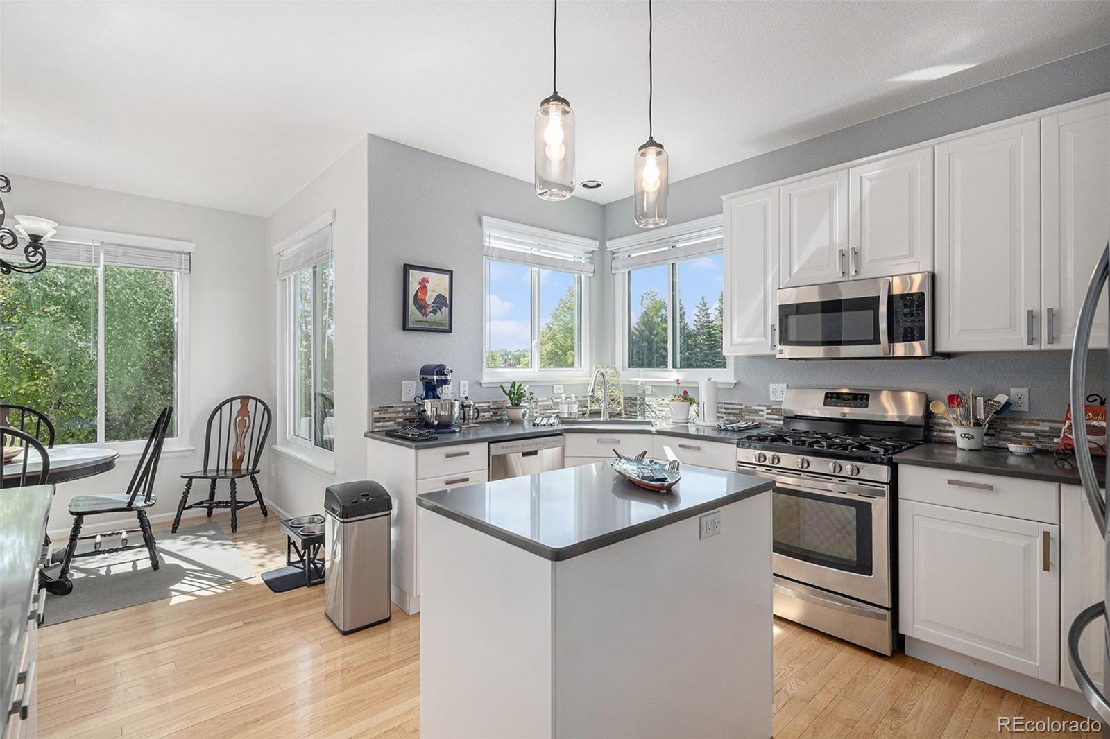 In the highly desirable Mira Vista neighborhood, this 3,200 sq ft, 3bd, 4ba home has been completely remodeled and updated offering both luxury and comfort. On a beautiful corner lot with freshly painted exterior and interior, along with mature landscaping, and a short walk to the community’s 6-acre greenbelt, this home is a rare and peaceful retreat. Vaulted-ceilings, an open-concept sitting area, a formal dining area, and hardwood floors throughout are just a few of its incredible features. The updated kitchen is a chef’s dream, boasting upgraded cabinetry, quartz counters, corner sink with window, gas range, SS appliances, beautiful glass fronted cabinets and a chef’s island. Perfect for summer entertaining, this eat-in kitchen opens to an elegant patio, fire pit, built-in gas grill, and fully fenced and landscaped backyard. On colder evenings, cozy up in your new living room that features a gas fireplace with floor-to-ceiling natural stone surround, and is ideal for relaxing. Just past the living room, the main-floor primary suite includes a bay window, walk-in closet, and spa-inspired bathroom with beautiful cabinetry, quartz counters, heated floors, and walk-in shower. Finishing the main floor, the laundry room opens to the 3-car garage equipped with ample storage cabinets, workbench, and a newer security system (transferable). The second floor has two additional bedrooms, a full bath, and a loft flex space perfect for an office, teen hang-out, or playroom. The fully finished basement offers even more living space with new carpet, wet bar, mini fridge, bath with custom walk-in shower, egress windows, and abundant storage. The quiet neighborhood, thoughtful upgrades and seamless blend of elegance and function make this turnkey home a rare opportunity. Conveniently located within one of the best school districts in Colorado, you'll also find local shopping, dining, parks, and only a 5 minute walk to Lifetime Fitness–this is Colorado living at its finest.
