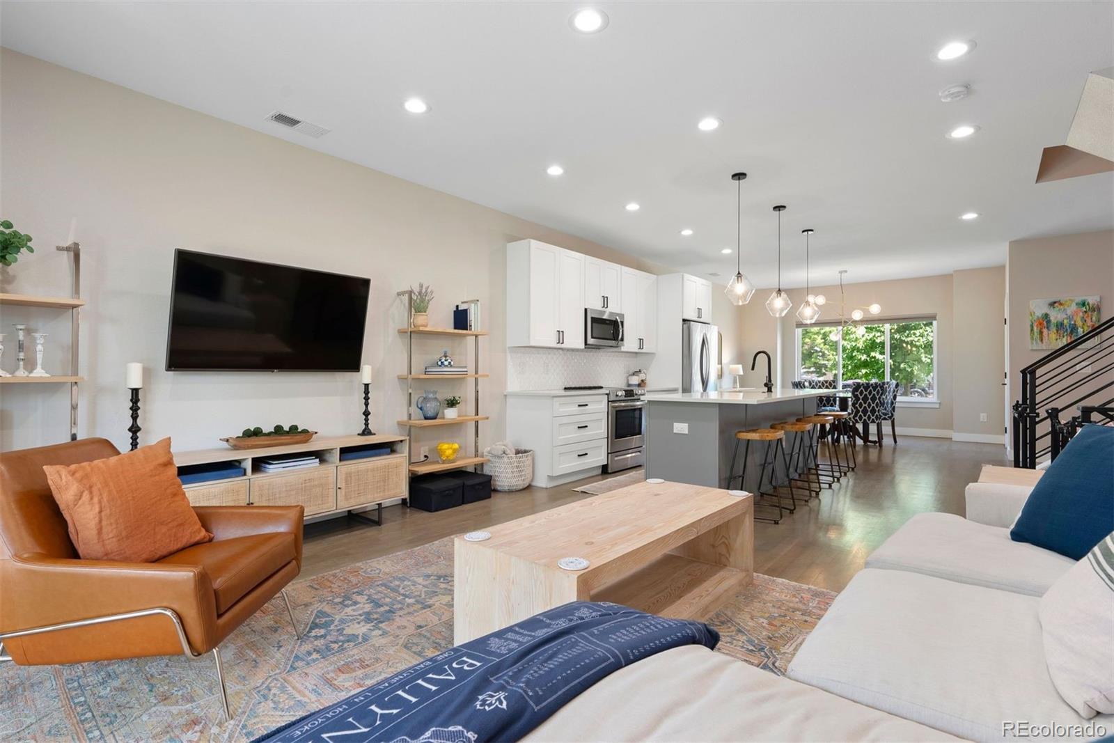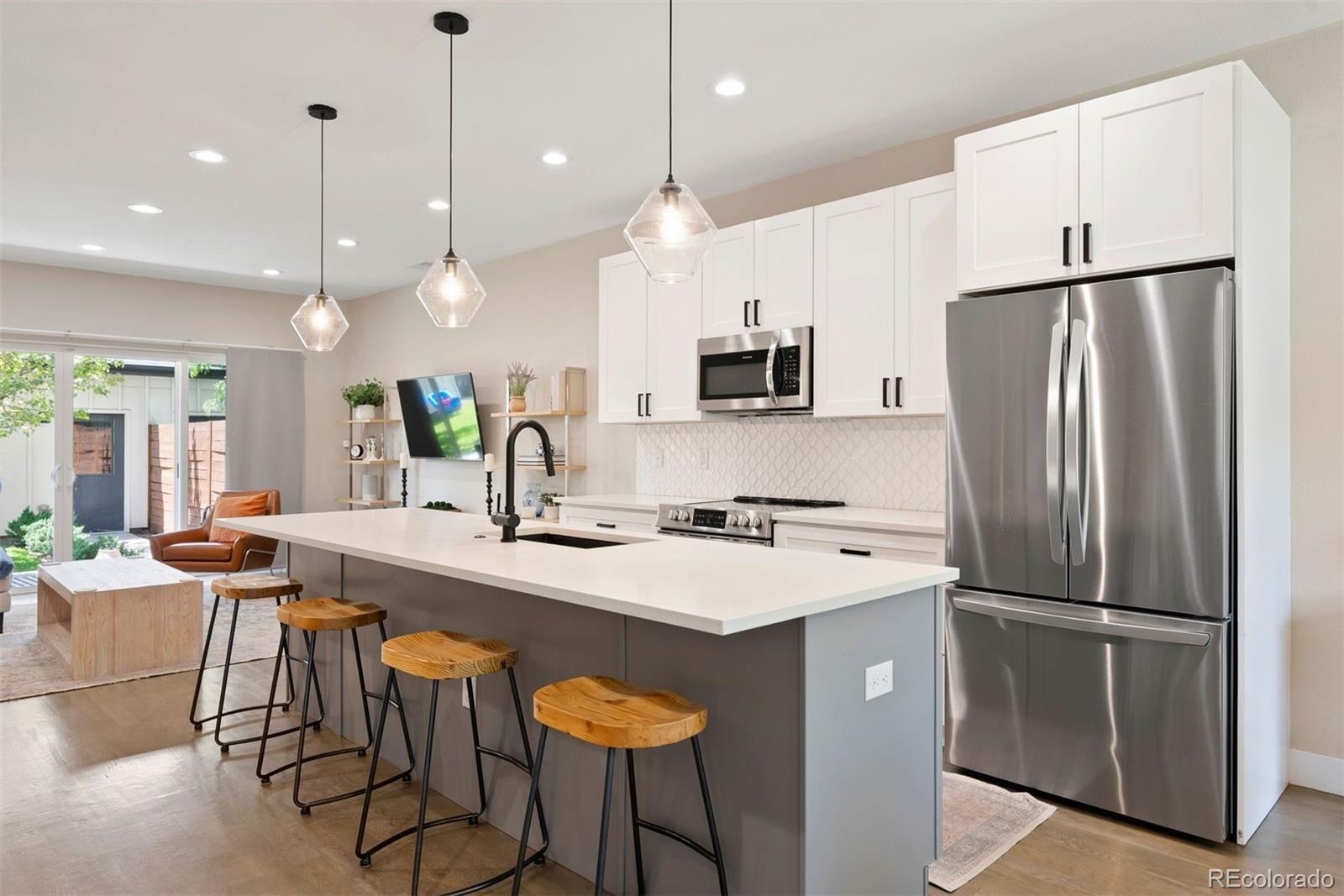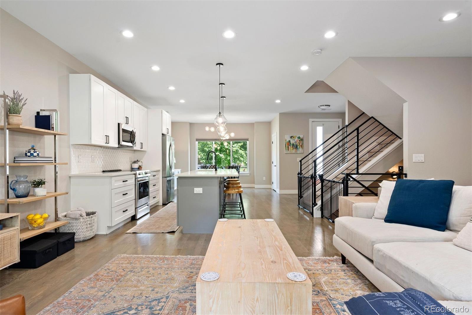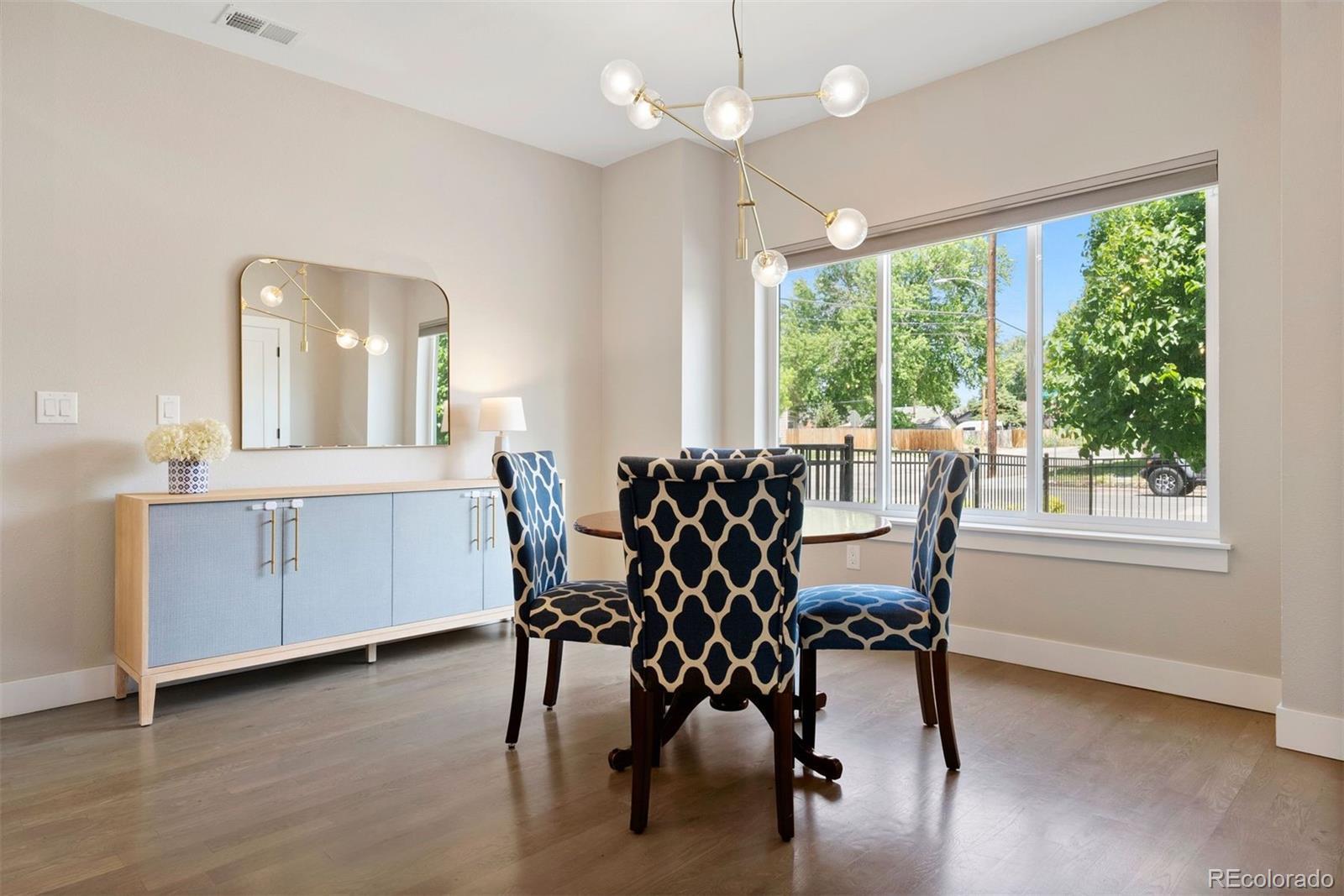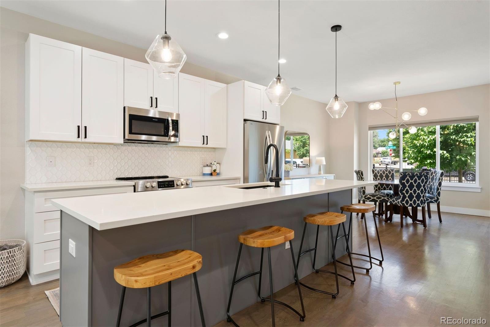 Modern farmhouse charm meets fresh city living in this beautifully designed newer construction home—one of just four thoughtfully crafted residences in the heart of Englewood’s vibrant South Broadway scene. With 3 bedrooms (4th non-conforming in basement) and 4 baths, this light-filled home lives large thanks to a wide, open-concept main floor and stylish finishes throughout. The kitchen is a total standout with a 10-foot eat-in island, soft-close maple cabinetry, sleek backsplash, and modern pendant lighting—perfect for gathering with friends or cozy nights in. Gray-washed solid oak floors add warmth and sophistication, while custom horizontal railings lend a contemporary touch. Upstairs, the spacious primary suite features vaulted ceilings, a walk-in closet, and a private en-suite bath—your own retreat at the end of the day. A large basement offers flex space for any other rooms you would need - currently bedroom, gym, playroom, family room & office! Enjoy your fenced yard, front & back, covered patio & 2-car garage. No HOA, and just minutes from the Light Rail, parks, shops, and restaurants along South Broadway. Modern living, effortless style, and unbeatable location—it’s all here.