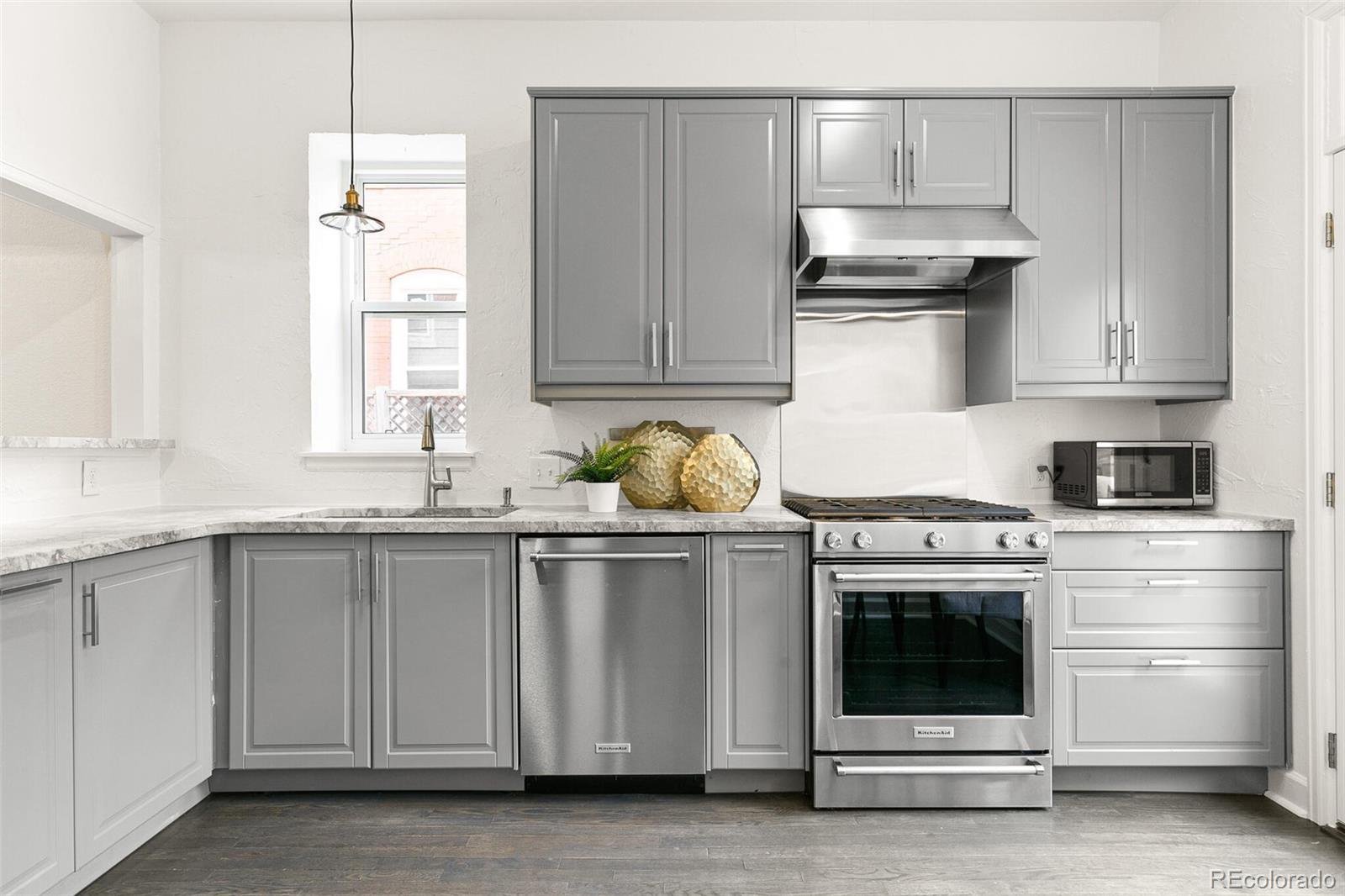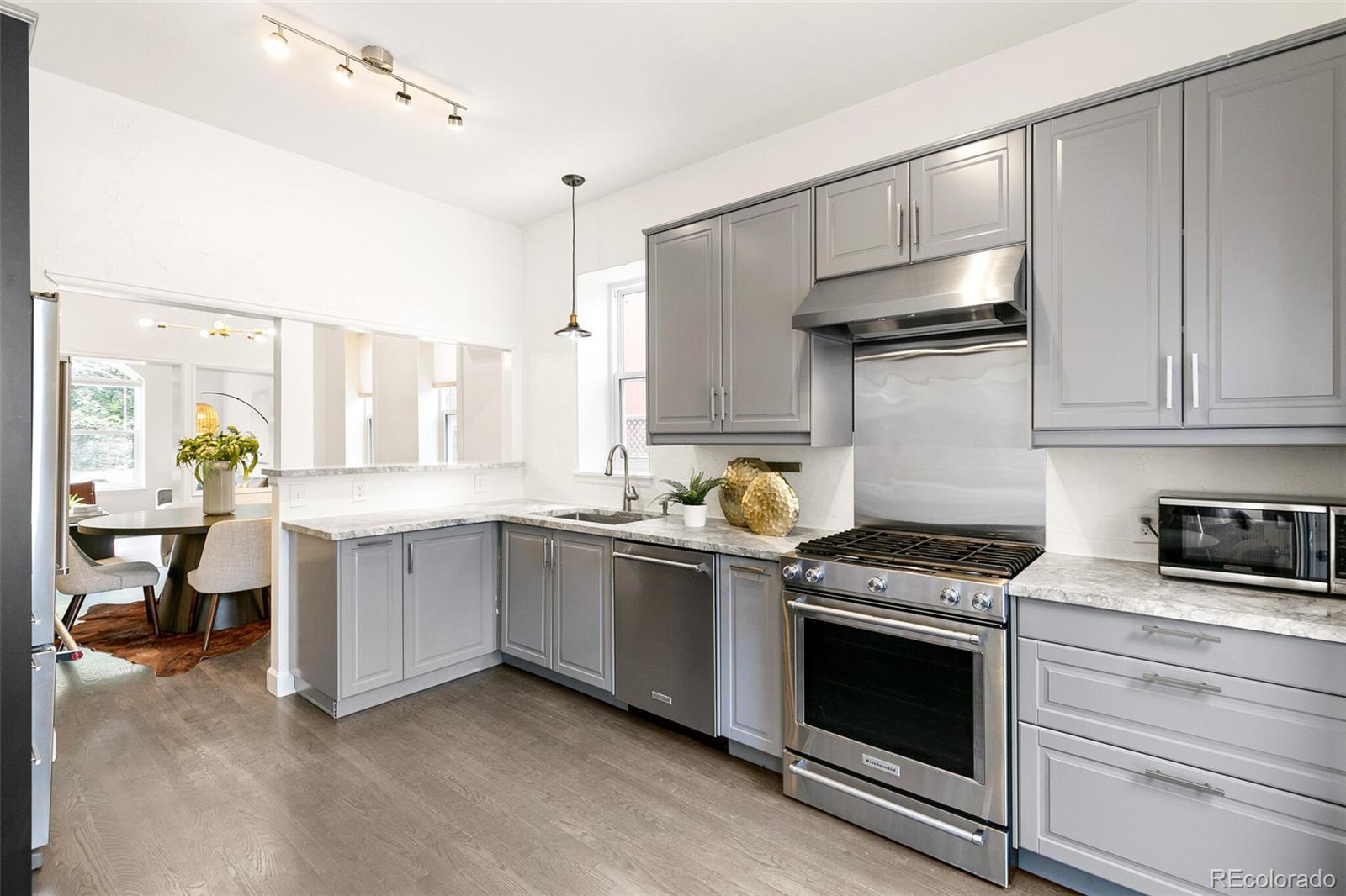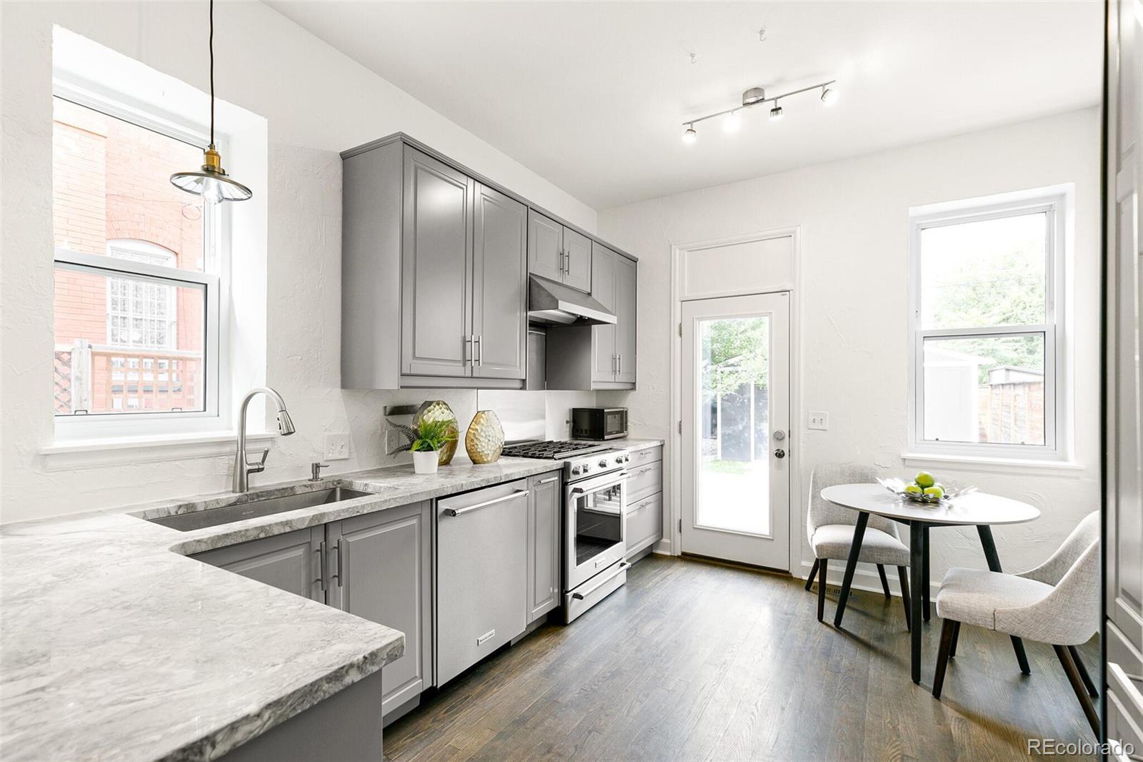 Step into timeless elegance with this beautiful Victorian home, brimming with classic charm and modern updates. Featuring three spacious bedrooms and 3 baths, the interior showcases soaring high ceilings, gleaming original hardwood floors, and striking exposed brick accents that add warmth and character. The updated kitchen and lighting blend seamlessly with the home’s vintage details, offering the perfect mix of old-world appeal and contemporary comfort. Three large upper bedrooms, custom closet system and a freshly painted full interior. Outside, enjoy a private yard with a raised deck, mature landscaping, and a new large two-car detached garage. Nestled on a quiet, tree-lined street just steps from a local elementary school, the home is conveniently close to shopping, dining, community amenities, light rail, and public transit—making it as practical as it is enchanting.