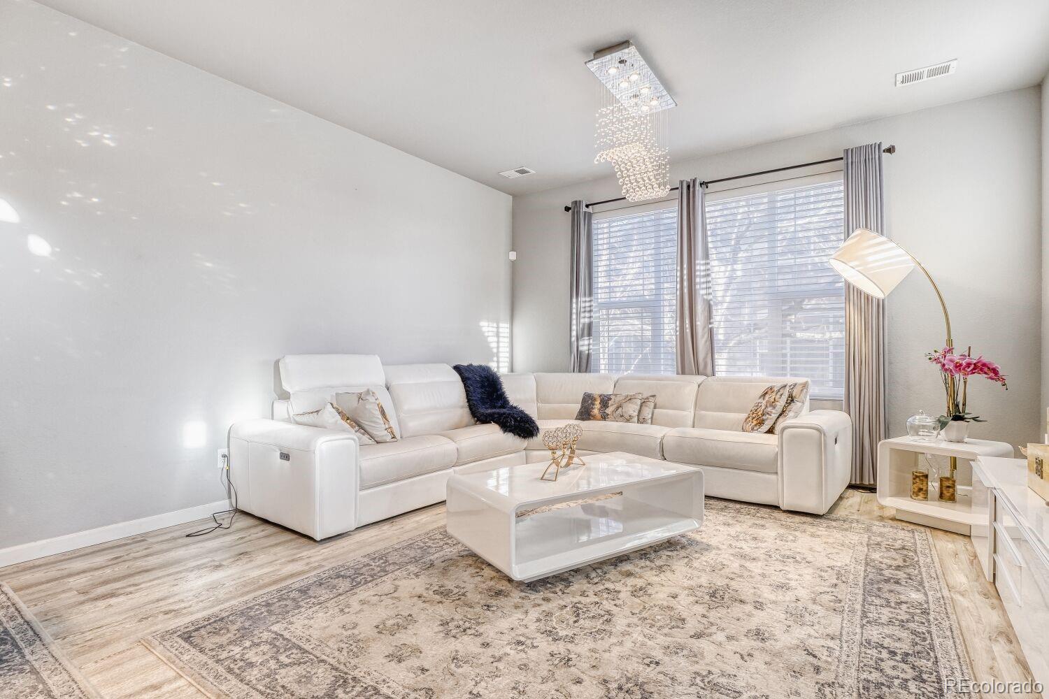 This beautifully appointed modern farmhouse–style townhome offers refined, low-maintenance living with 3 bedrooms, 3 bathrooms, and numerous tasteful upgrades throughout. A private patio provides an ideal outdoor retreat with space for grilling and comfortable seating. Upon entry, the home welcomes you with an open-concept layout, soaring ceilings, and abundant windows that fill the interior with natural light. The spacious living room features a large picture window with custom window coverings and an ideal wall for media placement. The dining area is enhanced by elegant Restoration Hardware–inspired lighting and additional seating at the kitchen counter, creating a perfect setting for both everyday living and entertaining. The well-designed kitchen showcases black appliances, an upgraded Bosch dishwasher, a granite composite sink with a new faucet, and attractive cabinetry suited for any culinary enthusiast. Conveniently located off the kitchen are access to the attached two-car garage and a stylish main-level powder room with a modern vanity, vessel sink, and upgraded fixtures. Upstairs, the primary suite serves as a private retreat with vaulted ceilings, a ceiling fan, a walk-in closet, and a spa-inspired in-suite bath featuring dual undermount sinks, framed mirrors with upgraded lighting, decorative floating shelving, a soaking tub, and a tiled shower with a rain showerhead. The secondary bedrooms are generously sized and offer ample storage, sharing a full bathroom appointed with quartz countertops and a tiled tub/shower surround. An upstairs laundry room, accented with custom barn doors, adds everyday convenience. Residents enjoy access to community amenities including Murphy Creek Golf Course, a clubhouse with pool, tennis courts, playgrounds, and snow removal services. The property is ideally situated near shopping, dining, and entertainment at Southlands Mall, with convenient access to Denver International Airport, Buckley Space Force Base.