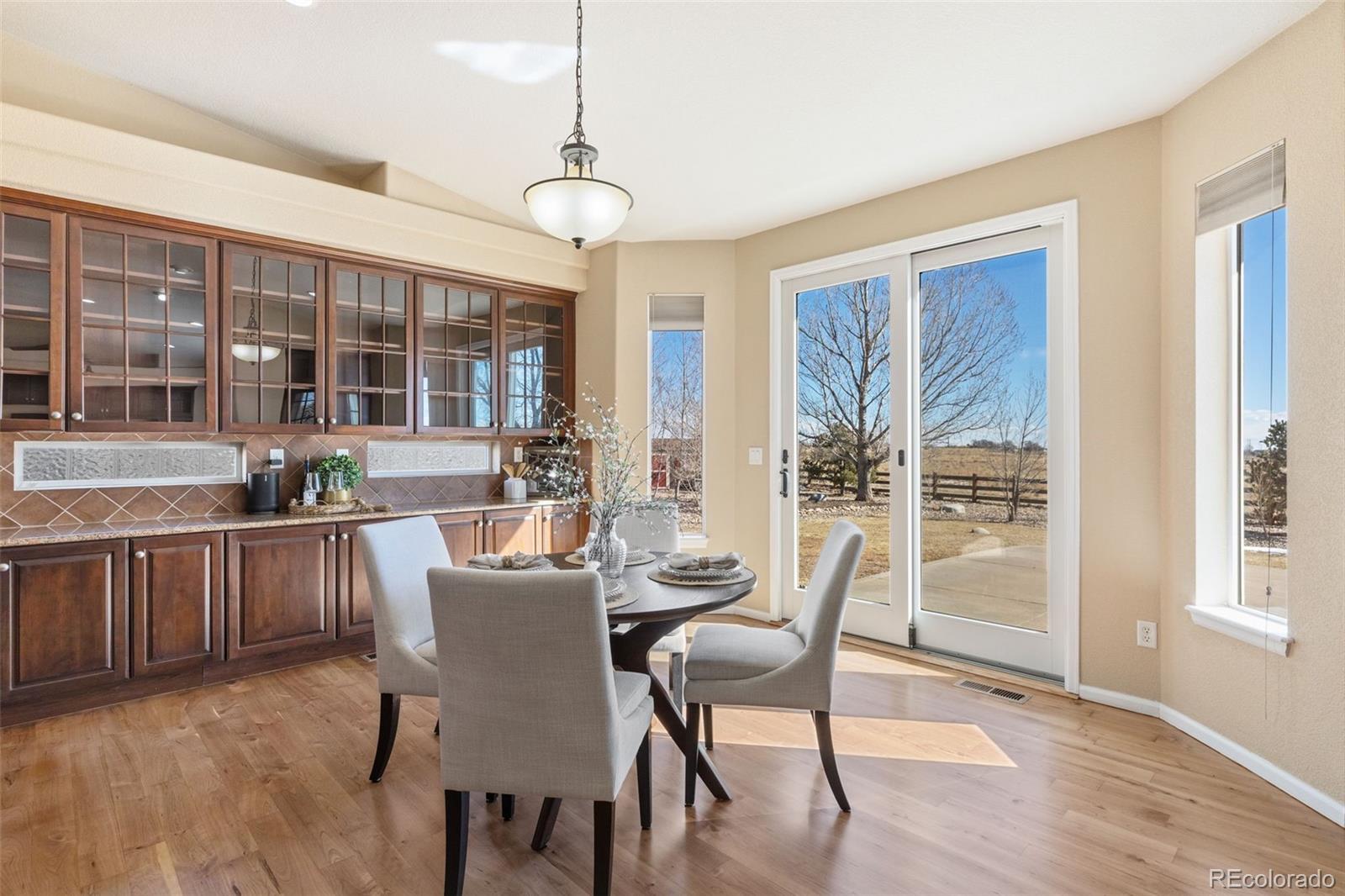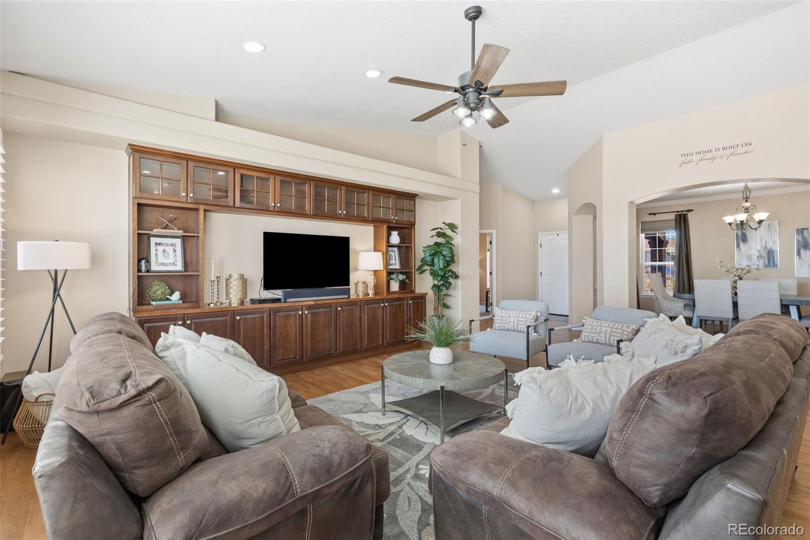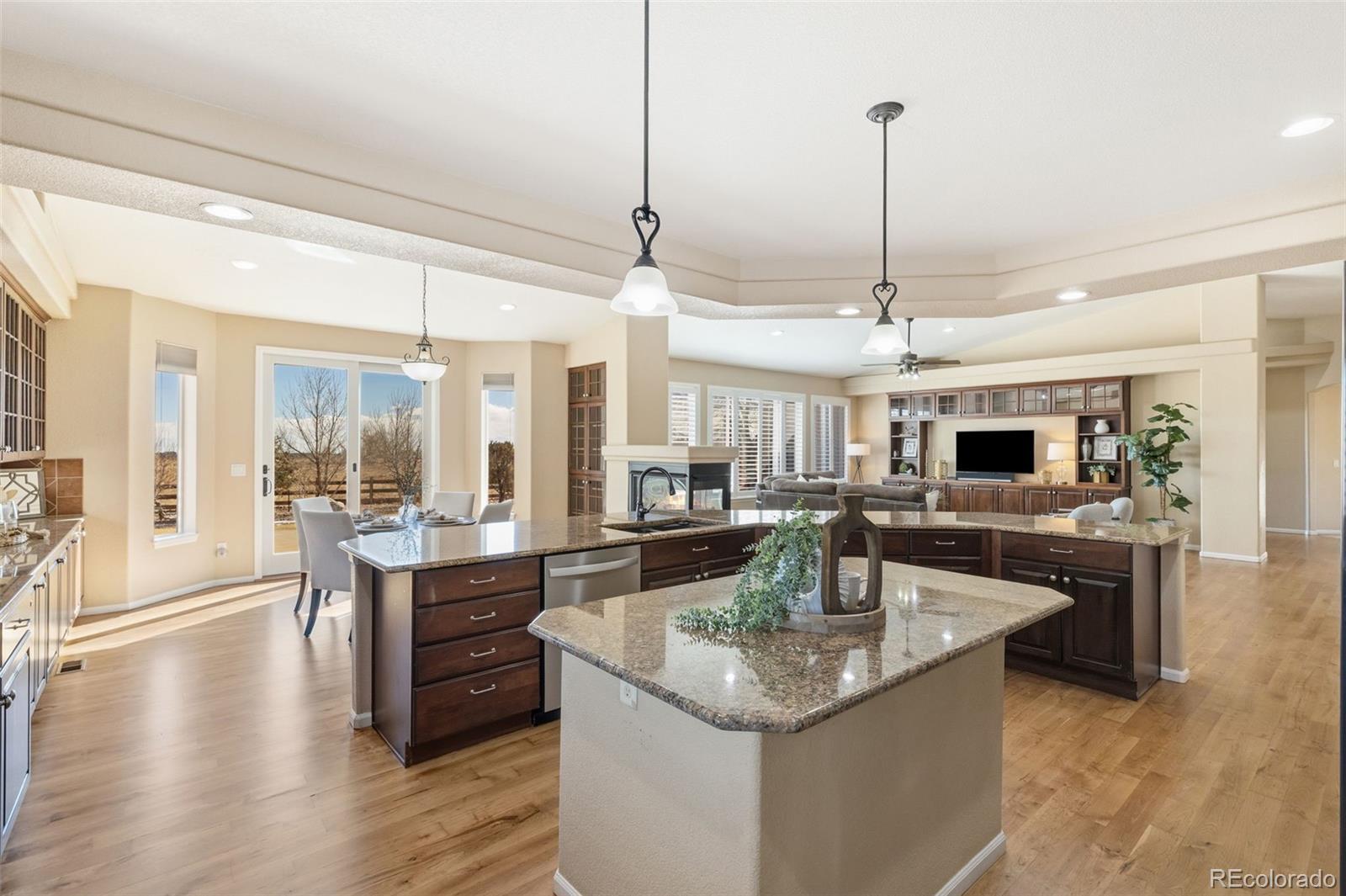 Stunning ranch-style home tucked at the end of a quiet cul-de-sac on a beautifully landscaped .68-acre lot. This thoughtfully designed residence offers 4 bedrooms, 4 bathrooms, and a 3-car garage, blending elegant finishes with exceptional indoor-outdoor living. Newly finished cherry hardwood floors welcome you into the light-filled great room, featuring soaring ceilings, wall of windows, a built-in entertainment center, and a dramatic dual-sided fireplace. The chef's kitchen boasts a large center island, abundant 42” cherry cabinetry, granite countertops, new double ovens, new dishwasher, gas cooktop, walk-in pantry, and dining nook. The open concept design offers an inviting space for gathering and entertaining, providing a sense of togetherness that makes everyone feel at home. French doors open to a private home office, perfectly positioned for a quiet workspace. The primary suite offers patio access, a luxurious five-piece bath, and a generous walk-in closet. Step out and enjoy the sunrise on the patio. Two additional bedrooms and a full bath complete the main level. The finished basement expands your living space with a family room, bedroom, and full bath. Double doors open to an impressive entertainment/game room - a perfect retreat to recharge, watch movies and sporting events and entertain family and friends. This space features a custom bar with granite countertops, dual bar refrigerators, ice maker, kegerator with six taps, and LED shelving—a true showstopper. Step outside to the expansive patio overlooking the fully fenced backyard, complete with mature trees & gardens, gazebo, fire pit and breathtaking Pikes Peak views—a versatile setting for relaxation or hosting special occasions such as weddings, graduation parties and BBQ's. With easy access to schools, shopping and dining, this home is a rare combination of privacy, views, and exceptional amenities.