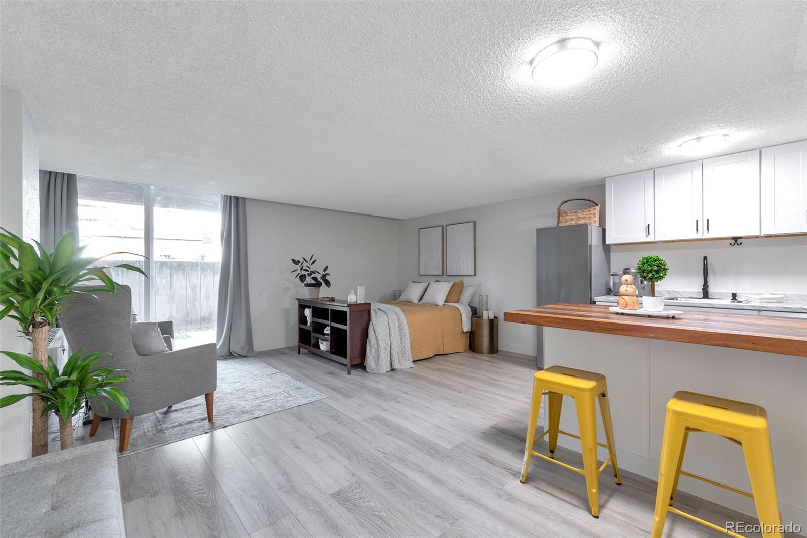 STUNNING TURN-KEY STUDIO IN PRIME LOCATION! Discover an effortlessly chic, move-in ready studio just one block south of the University of Denver campus—and directly across from the green expanse of S.R. DeBoer Park. With a fully remodeled interior, it’s a rare opportunity to own a home that blends modern finishes, intelligent design and unbeatable convenience. Interior Highlights: • First-floor unit (off the lobby, no elevator required) for seamless daily access. • Full kitchen renovation featuring stainless-steel appliances—a modern stove with air-fryer, stainless fridge and microwave—plus abundant upper-and-lower cabinetry for serious cooking and entertaining. • Striking real-wood breakfast bar/peninsula that seats three, offering a rustic counter with warm character amid the contemporary space. • New countertops and custom cabinets throughout; wood-look laminate flooring and fresh neutral-grey paint set a crisp, airy tone ready for your décor. • Private back patio through brand-new sliding doors—ideal for relaxing outdoors or entertaining. • Three sizeable closets give generous storage (rare in a studio). • Updated, well-appointed bathroom to complete the refreshed feel. • Reserved parking space plus an additional storage unit included. • On-site coin laundry and the building’s HOA is among the lowest in the complex—and it includes all utilities, taking the guesswork out of budgeting. Lifestyle & Location Perks: Invitation to View: If you’ve been searching for a studio that’s not just ready but elevated in style and location—schedule a walk-through today and see for yourself why this one stands apart.