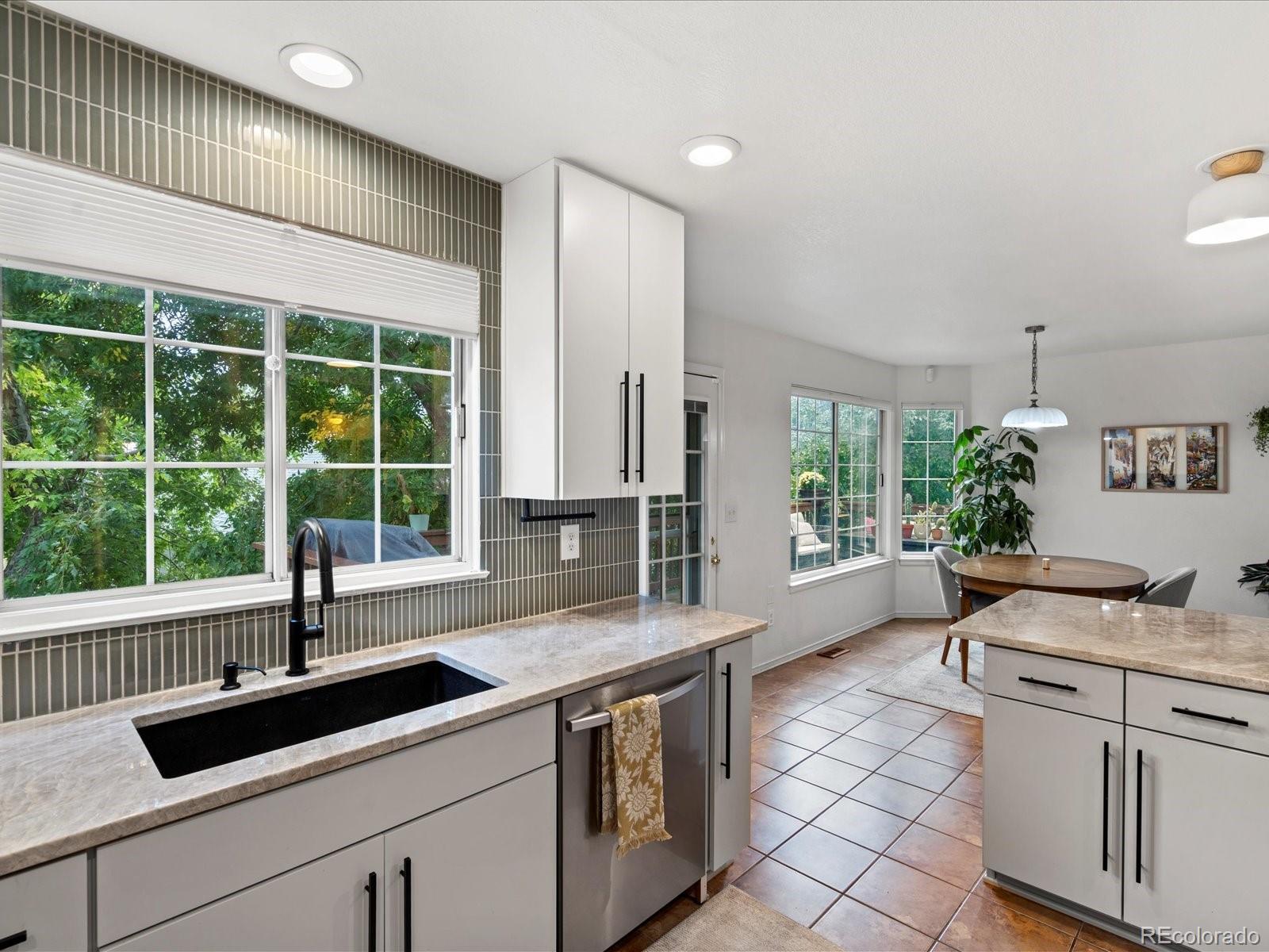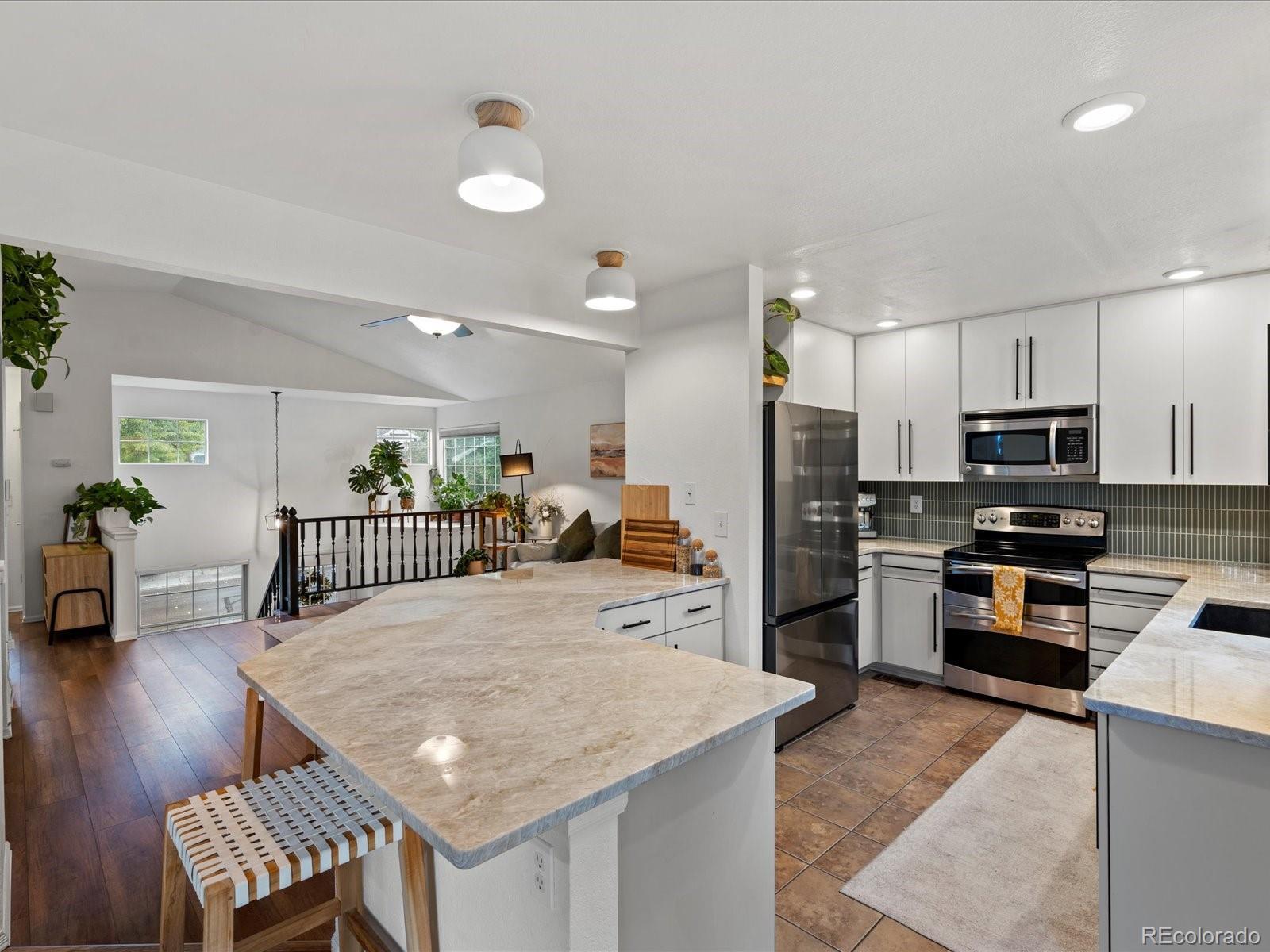 Experience the ultimate in indoor-outdoor living in this exceptional home, where a backyard oasis with mature trees & multiple entertaining spaces perfectly complement the home’s beautifully remodeled interiors. Located in the highly coveted Green Mountain neighborhood, this remodeled gem offers modern comfort and CO lifestyle at its finest - minutes from Red Rocks, Bear Creek Park + Lake, & loads of trails. Step inside to a striking entrance that opens to a spacious upper-level living room with luxury vinyl plank flooring and an abundance of natural light. The heart of the home is the show-stopping kitchen, where warmth meets chic, timeless design. Soft-close cabinetry pairs beautifully with a sleek mid-century inspired green tile backsplash, Taj Mahal granite countertops, SS appliances, and modern lighting. With peninsula seating and open to the delightful dining room w/ windows galore, the space feels airy and elegant. The primary ensuite is a true sanctuary with a walk-in closet and a beautifully renovated full bath featuring a modern vanity, wallpaper, and updated fixtures. With private access to the upper deck, you’ll discover an entertainer’s dream w/ a lounge area, fire pit, & outdoor TV. A secondary sun-filled bedroom and charming bathroom round out the upper level. Downstairs, enjoy a grand family room anchored by a cozy fireplace, along with a third bedroom & bathroom—perfect for guests/flexible living. Step outside to your backyard retreat, showcasing an upper deck for BBQ’ing, and an inviting lower patio w/ a swing, hot tub, grassy areas, and garden beds. Recent upgrades include: New roof (Dec 2023), 50-gal. water heater, new composite deck (2021), smart features, leased-to-own solar panels, & new blinds/window coverings. With mountain views, attached 2 car garage, and easy access to C-470, I-70 to world-class ski resorts, and Hwy 6 to downtown Denver, this home is the perfect balance of modern convenience and outdoor adventure.