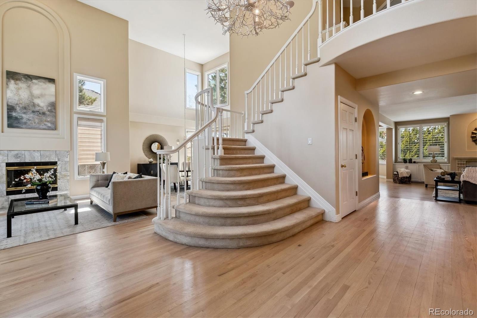 MAJESTIC MOUNTAIN VIEWS | GATED COMMUNITY | COVETED CUL-DE-SAC LOCATION. Welcome to this refined Highlands Ranch home, perfectly situated in a gated community on a quiet cul-de-sac with commanding mountain views. Designed for luxury and comfort, this 5-bedroom, 5-bathroom home spans 5,871 total SqFt and offers a thoughtful layout for entertaining, productivity, and everyday ease. Step into a grand foyer anchored by a sweeping curved staircase and soaring ceilings that open to elegant formal living and dining rooms. The chef’s kitchen features slab quartz countertops, abundant cabinetry, and seamless flow to a warm, inviting great room with custom built-ins and a fireplace. A sunlit breakfast nook leads to your private, beautifully landscaped backyard—an ideal setting for relaxation, entertaining, or simply taking in Colorado’s natural beauty. A dedicated home office, powder room, oversized laundry/mudroom, and a spacious 3-car attached garage complete the main level. Upstairs, the luxurious primary suite is a serene retreat with a spa-like bath showcasing heated tile floors, a rain shower, and an expansive walk-in closet. Four additional bedrooms and three baths provide flexibility for family, guests, or multigenerational living. The finished basement adds remarkable versatility with a generous great room, wet bar, game area, gym or flex space, guest bedroom, and a bath featuring a steam shower. Located minutes from C-470, I-25, Park Meadows, trails, parks, off-leash dog areas, and top-rated schools including Valor Christian and Cherry Hills K-8. Enjoy exclusive Highlands Ranch amenities—four rec centers, pools, and miles of trails. This is Colorado living at its finest.