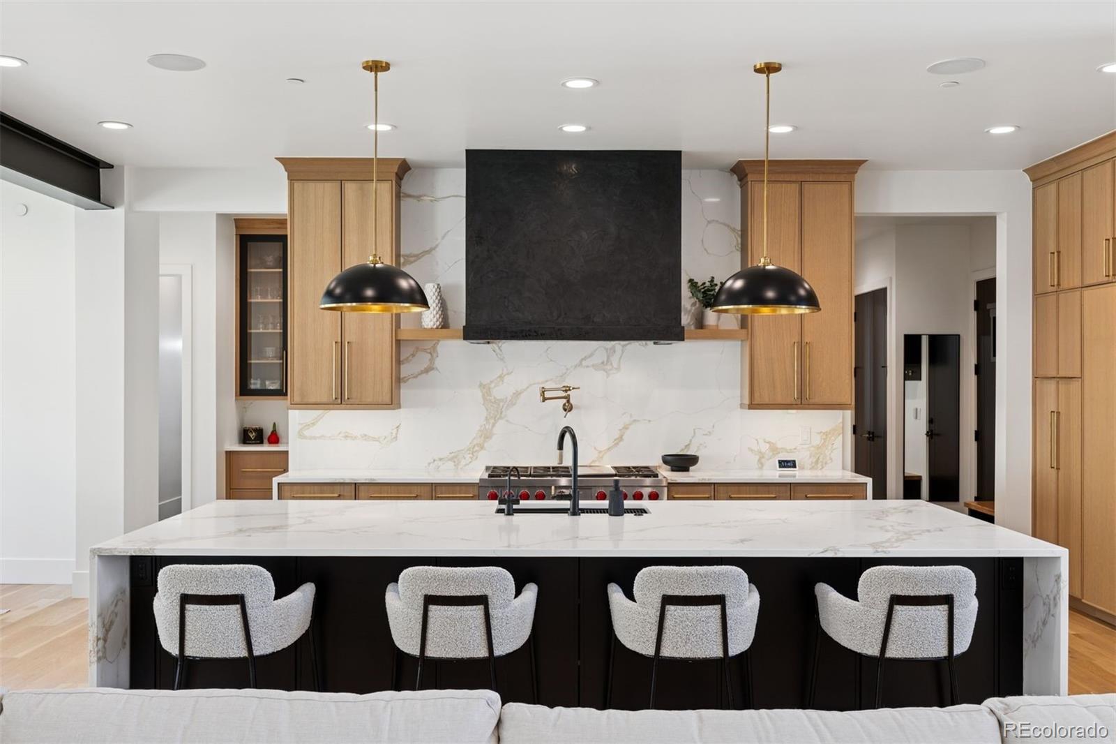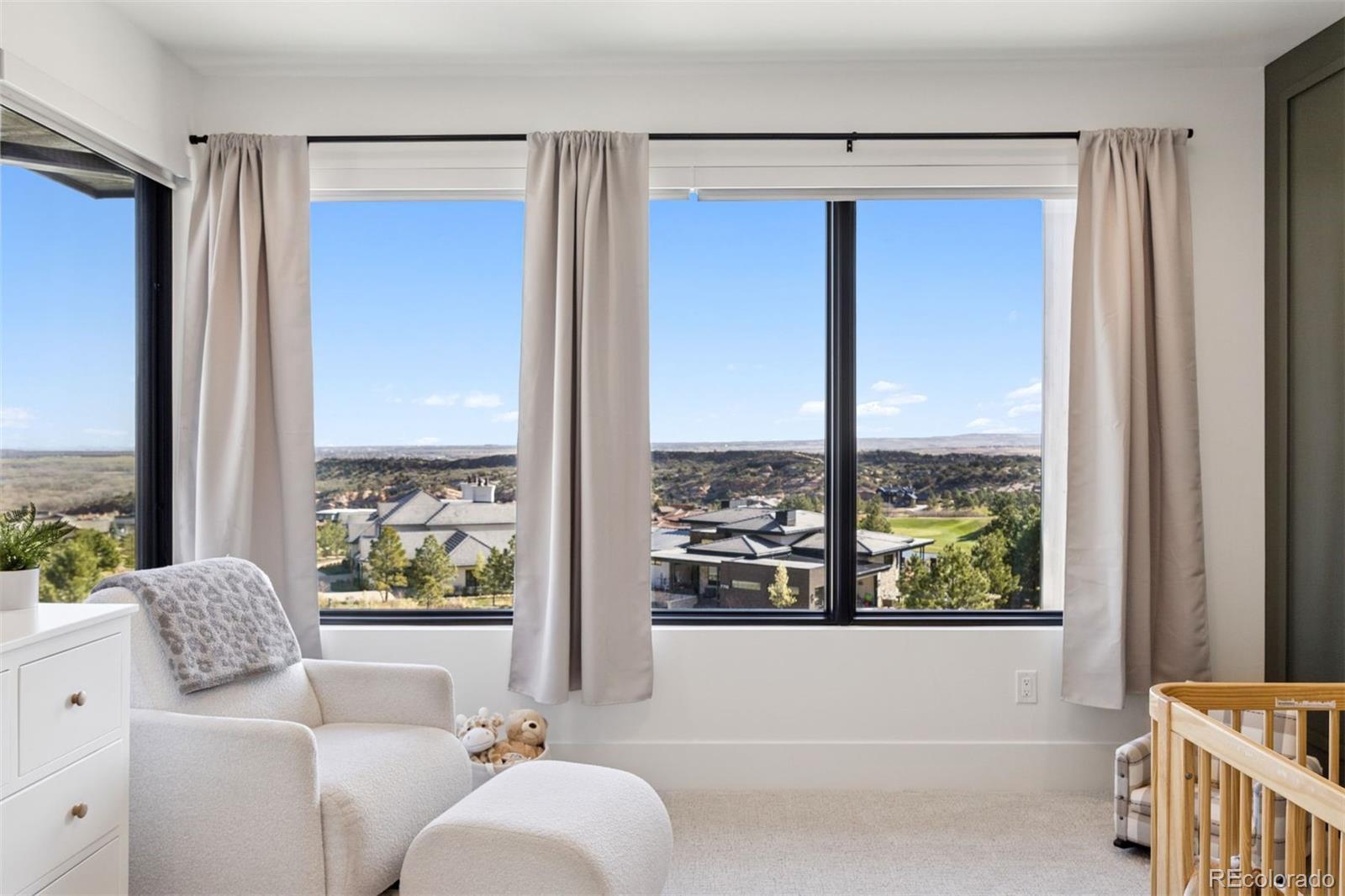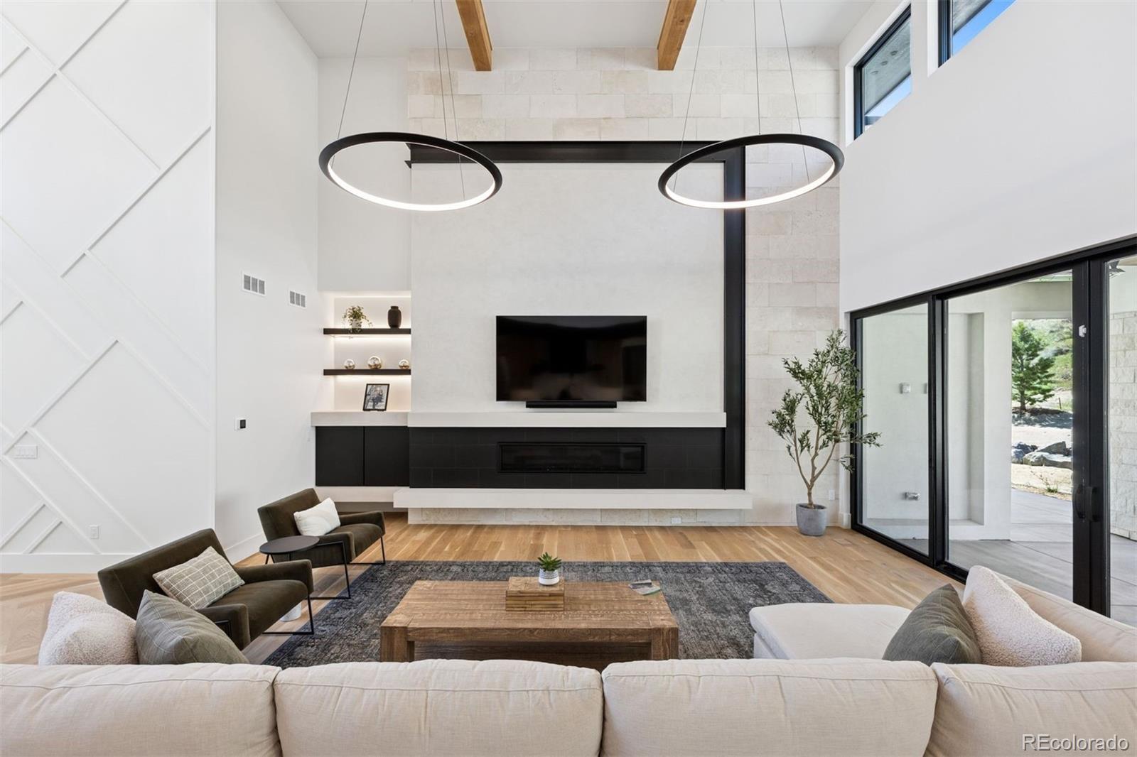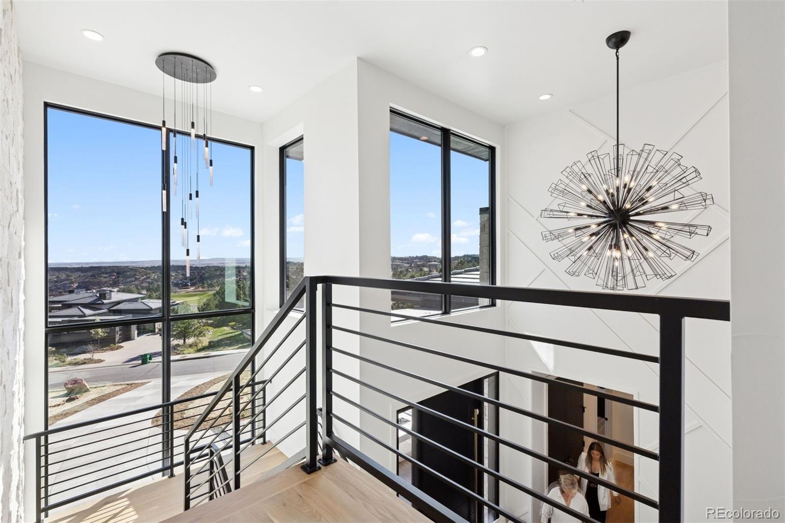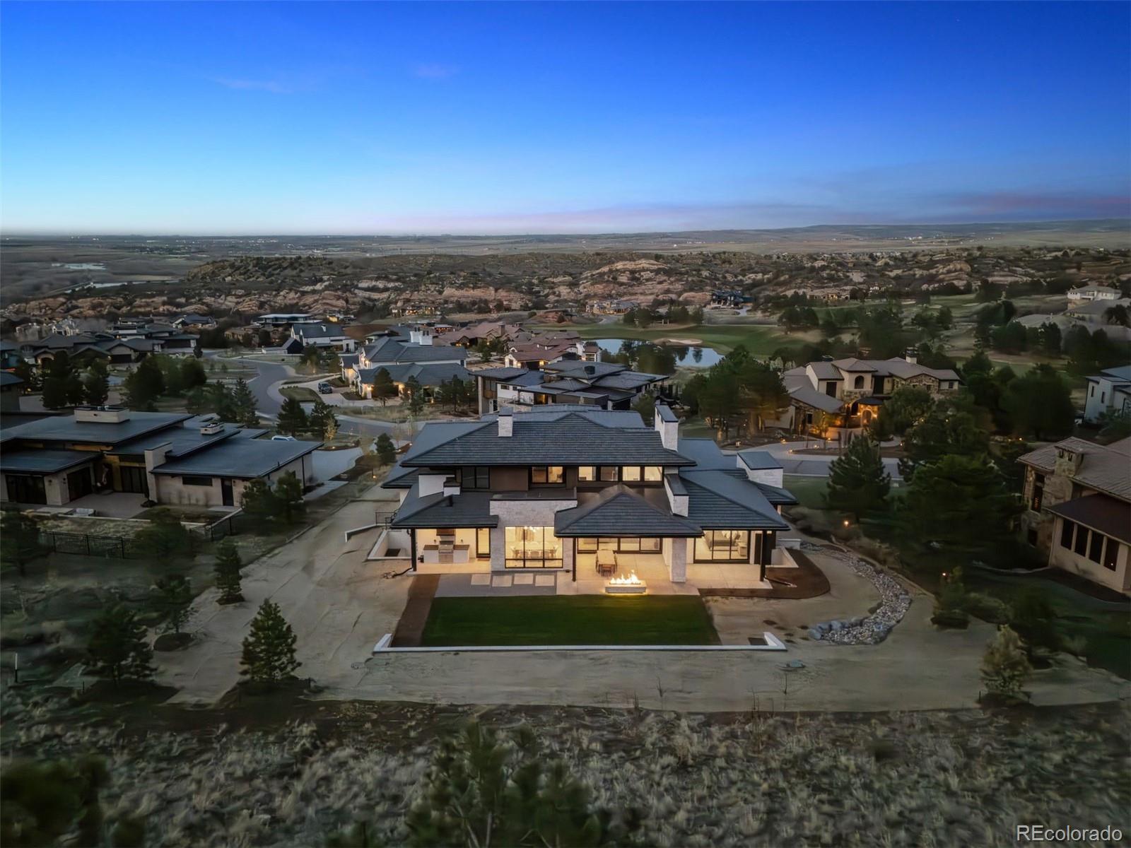 Newly completed in 2024, this custom-built estate presents a rare opportunity to own a truly exceptional residence within the prestigious Ravenna. Set on a .77-acre homesite backing to Pike National Forest and the 3rd hole of the Ravenna golf course, the setting is both private and breathtaking. The walk-out design captures sweeping views of Chatfield Reservoir and the Denver skyline—an ever-changing backdrop that elevates everyday living. From arrival, the home makes a striking impression with a floating gas firepit and a dramatic two-story foyer anchored by a commanding three-story stone wall. Inside, refined architecture meets modern luxury: soaring 25-foot ceilings, floor-to-ceiling windows, statement lighting, dramatic accent walls, and wide-plank white oak flooring throughout. The chef’s kitchen is a showpiece—designed for both beauty and performance—with a substantial center island, Sub-Zero refrigerator and freezer, six-burner Wolf range with double ovens, Cove dishwasher, and pasta pot filler. A fully equipped back kitchen with Asko dishwasher and extensive shelving adds seamless functionality for entertaining at scale. The main-level primary suite is a private sanctuary, featuring a spa-inspired bath with heated floors, a multi-head shower, and a deep soaking tub. Upstairs, two additional en-suite bedrooms and a loft overlooking the great room offer inviting and flexible living spaces. Designed for entertaining and wellness alike, the lower level boasts impressive ceiling heights, a fitness room, expansive recreation area, infrared sauna, and cold plunge—bringing a resort-caliber experience home. Indoor/outdoor living is effortless, with a west-facing entertainment area featuring a covered patio, firepit, dining space, and a sodded backyard ideal for play or relaxation. This is luxury living at its most intentional—where architecture, setting, and lifestyle converge in one of Colorado’s most coveted communities.