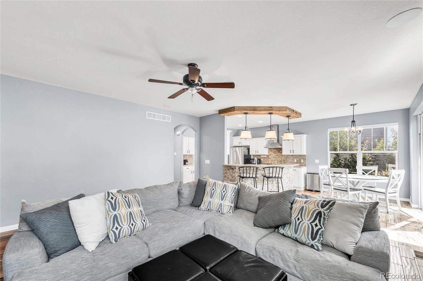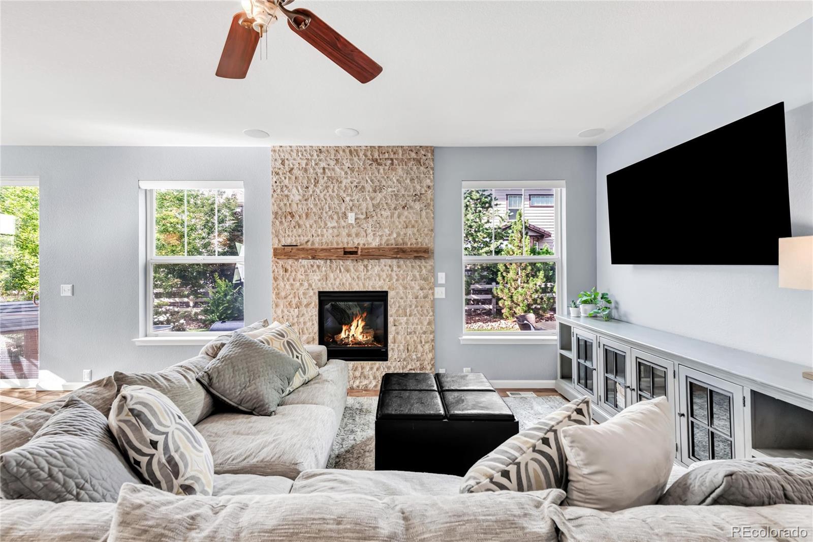 Welcome to your dream home in the desirable Anthem Highlands neighborhood! This beautifully updated 4-bed, 2.5-bath home offers over 3,400 total square feet, including ~2,376 sqft of finished living space above grade, with an unfinished daylight basement ready for your personal touch. Step inside to find designer finishes throughout: stunning hand-scraped Acacia hardwood floors, high-end stainless steel kitchen appliances, white cabinetry, and a large breakfast bar. The living space is airy and open, anchored by a stacked stone fireplace and bathed in natural light. A separate office or study adds versatility. Retreat upstairs to the spacious primary suite with custom walk-in closet and richly appointed five-piece bath. The home also features practical upgrades such as whole house water filtration, radon mitigation, security/shatterproof windows, and professional landscaping. Outside, the generous lot accommodates outdoor entertaining with a patio, and mature trees offering seasonal color. The three-car garage and expanded driveway add convenience. Anthem Highlands is known for its resort-style amenities: community clubhouse, fitness center, pool, playgrounds, trails, and parks. Top schools (Thunder Vista P-8; Legacy High School) make this a standout choice. Don’t miss this rare opportunity to own a home with so many high-end features, an exceptional lot, and strong value in the current Broomfield market.