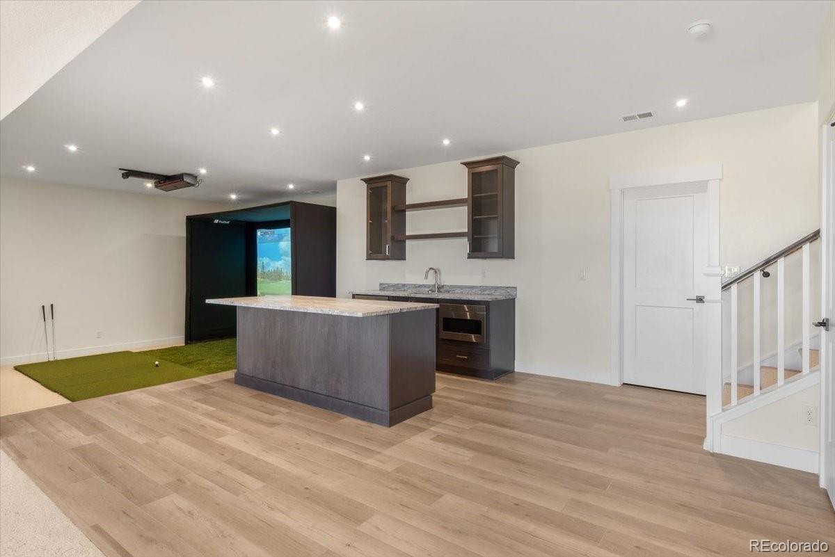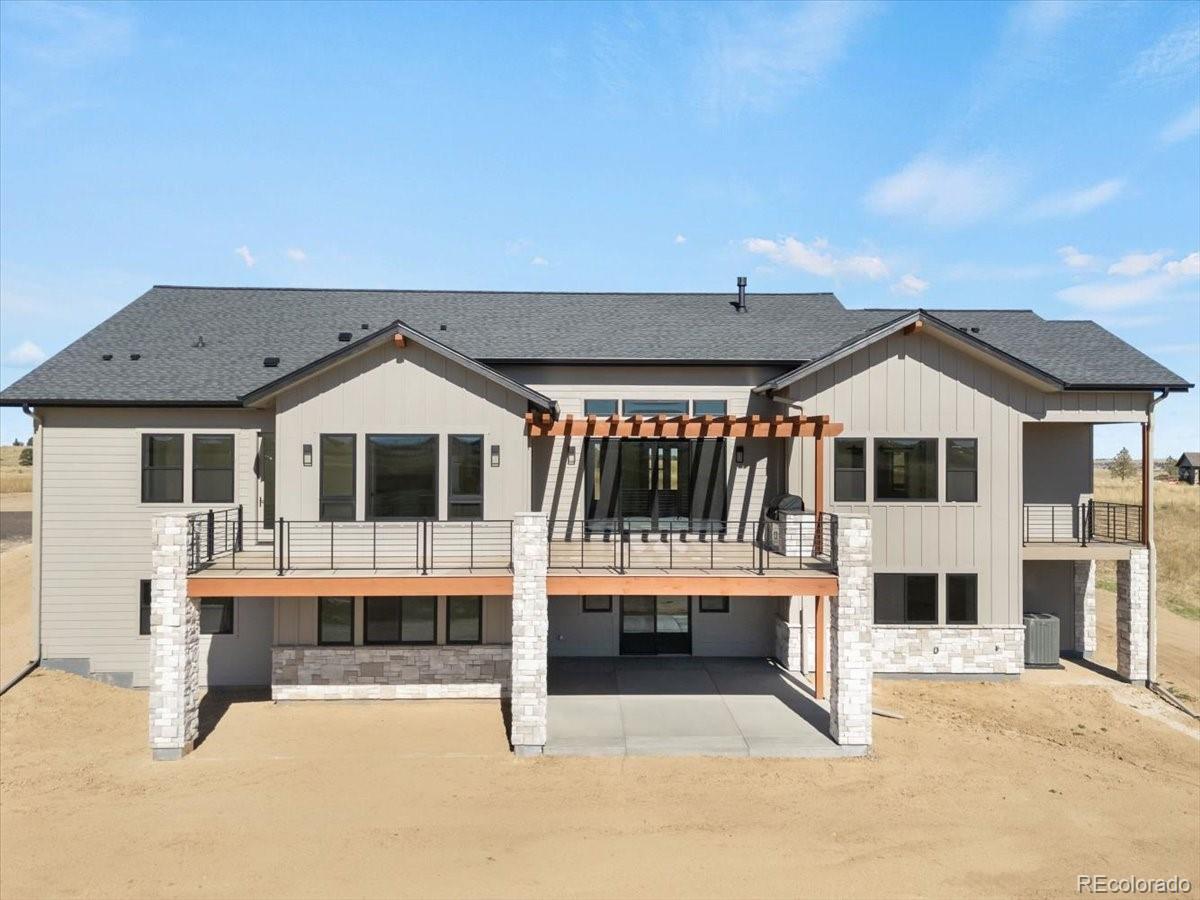 Welcome to an extraordinary new custom home unlike any other—set on 10 pristine acres just minutes from downtown Parker, Colorado. This thoughtfully designed ranch-style residence blends timeless craftsmanship with modern luxury, capturing sweeping views of Pikes Peak from nearly every room. Inside, the open-concept layout features 4 bedrooms and 5 bathrooms, including 3 main-level bedrooms with private en-suites, plus a sophisticated study with custom built-ins. The chef’s kitchen is a true showpiece, offering high-end appliances, generous counter space, and a built-in BBQ that makes entertaining effortless. A gas fireplace anchors the great room, creating a warm and inviting atmosphere enhanced by luxury vinyl plank flooring throughout the main living spaces. The primary suite is a private retreat, complete with its own patio, spa-like bathroom with heated floors, and an oversized walk-in closet with custom built-ins. Downstairs, the walk-out lower level is designed for entertainment and relaxation, featuring a wet bar, lounge area, and a state-of-the-art True Golf simulator with drop-down floors—perfect for year-round enjoyment. Outdoor living is equally impressive, with a pergola-covered patio that showcases the property’s expansive setting and unbeatable mountain views. Additional highlights include an elegant entrance foyer, an oversized 3-car garage with a 220V outlet for electric vehicles or hobby use, and custom details throughout. With its incredible setting, thoughtful floor plan, and unparalleled finishes, this home sits on the best lot in the neighborhood—offering the ultimate combination of privacy, style, and Colorado living at its finest.