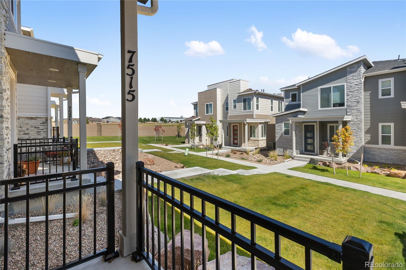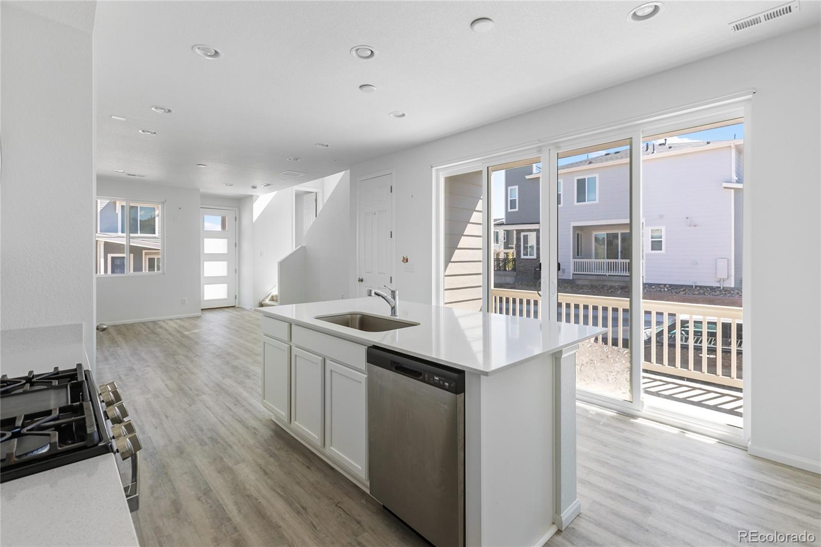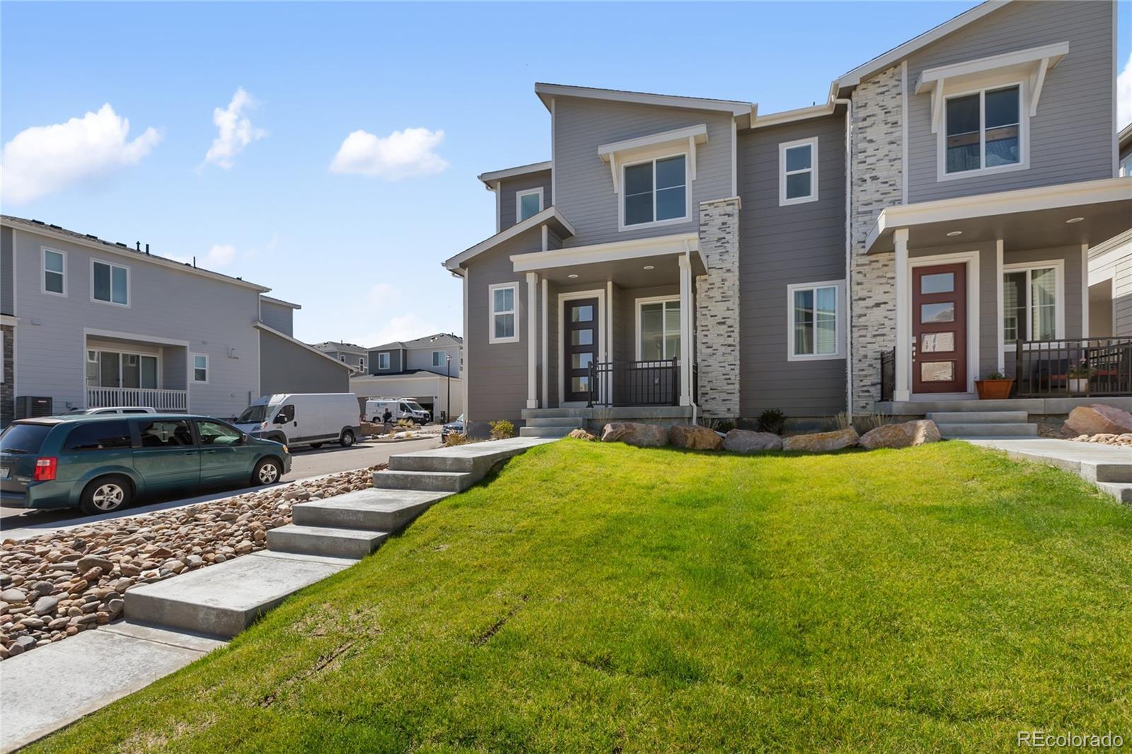 Welcome to your new home in Palmer Village! From the inviting front porch to the private covered patio, this townhome is designed for both comfort and style. Step inside to find a modern kitchen complete with a generous pantry, gas range, large center island with breakfast bar, and abundant storage space. The main level showcases 9-foot ceilings, durable luxury vinyl plank flooring, and a bright, open layout that seamlessly connects the kitchen, dining, and living areas—perfect for gatherings or everyday living. A convenient powder bath rounds out the main floor. Upstairs, the spacious primary suite is filled with natural light and offers a walk-in closet and ensuite bathroom with dual vanity. Two additional bedrooms, a full bath, and a well-placed laundry room complete the upper level. Living here means low-maintenance ease—landscaping is handled for you—so you can spend more time enjoying nearby parks, shops, restaurants, and D49 schools. Don’t miss your chance to see this beautiful townhome—schedule your showing today!