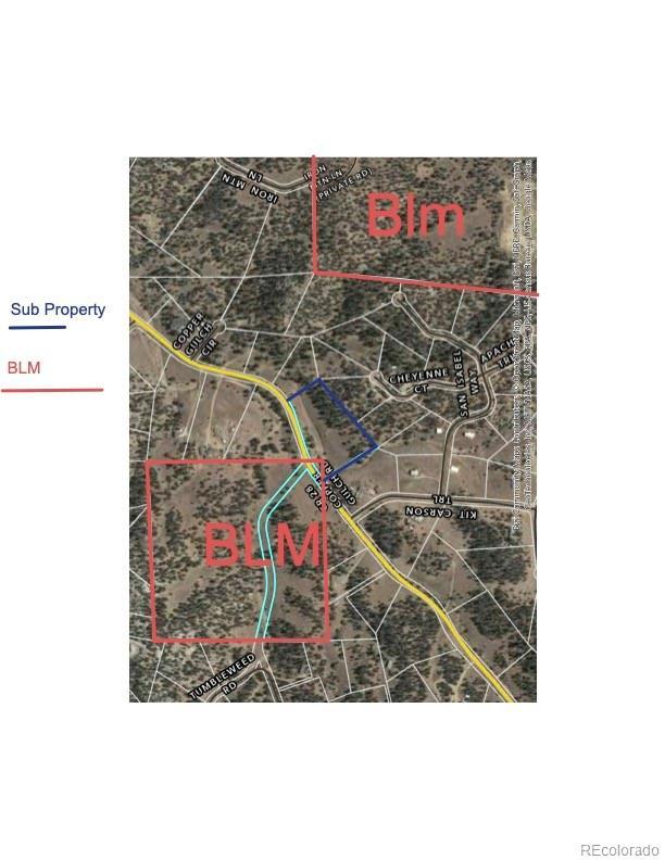 Ever crave land that doesn't come with rules-or noise? This 6.46-acre sanctuary in early Glen Vista (no HOA dues here) is your blank canvas, kissed by sunlight, shaded by pines, and gently sloping toward storybook views of the Sangre de Cristos. Just off paved Copper Gulch Road, it's easy to get to-but feels worlds away. A seasonal water draw meanders through the meadow, while the northwest corner touches BLM, giving you direct access to untamed wildland. Pick your perch: nestled in the trees or elevated near the ridge where the skies stretch wide. Power is nearby if you want it. But maybe what you really want is peace, possibility, and a sky full of stars. Whether you're dreaming of a cabin, a camper, or a quiet place to reconnect, this land holds space for all of it. Let it be your return to center-your place to breathe, build, and become.
