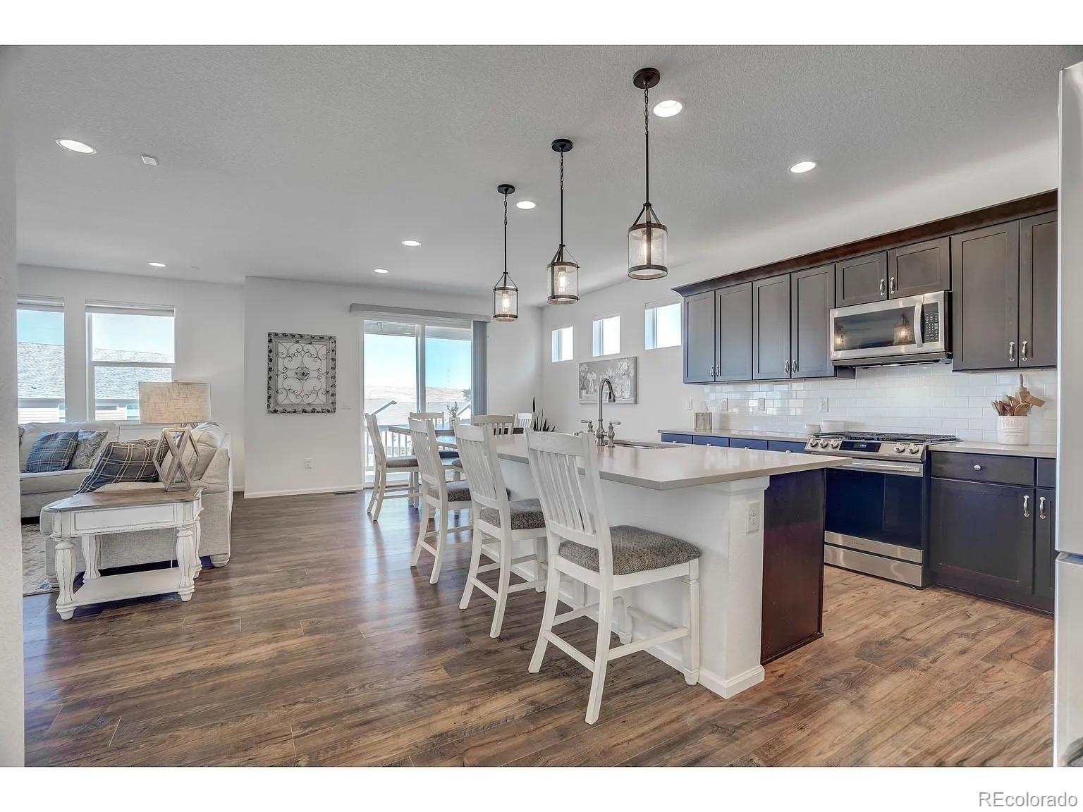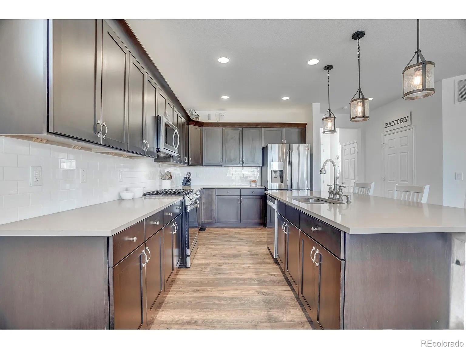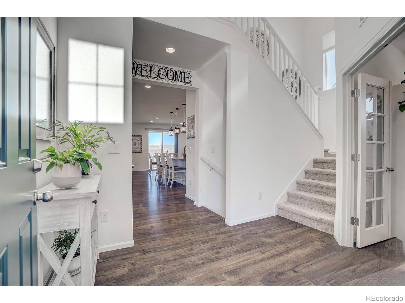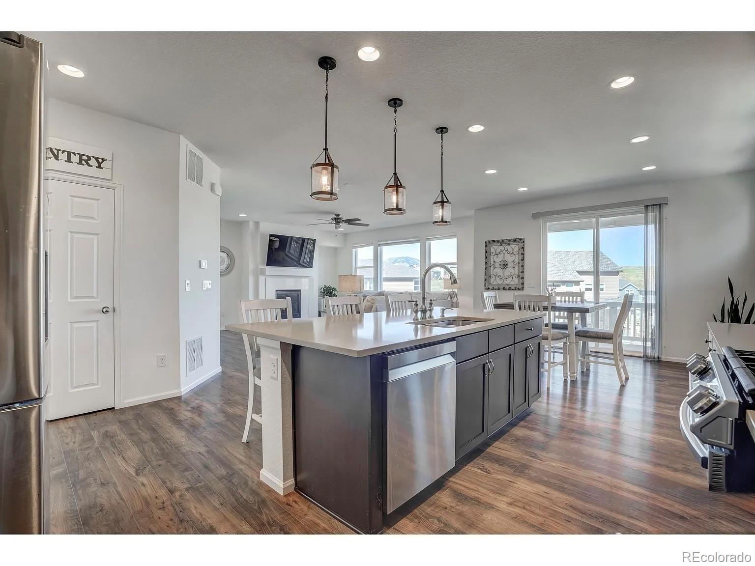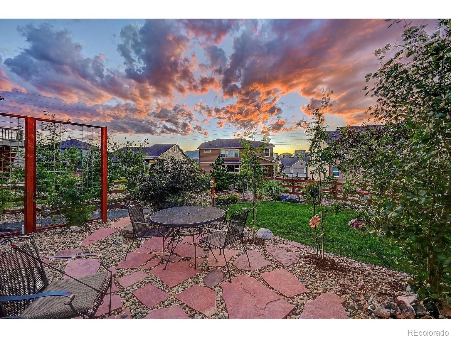 Step into the heart of the thriving Candelas community and discover a home that truly stands out. This impressive 2-story residence greets you with a meticulously landscaped yard and a spacious 3-car split garage, blending curb appeal with everyday functionality. Inside, an open-concept layout creates a seamless flow for modern living. The kitchen, designed with the home chef in mind, boasts a large center island, gas range, stainless steel appliances, generous counter space, and abundant cabinetry. The adjoining dining area and great room set the stage for memorable gatherings. The primary suite offers a private retreat with stunning mountain views and breathtaking sunsets. Its spa-like 5-piece bath features dual vanities, a soaking tub, walk-in shower, and a roomy walk-in closet. Upstairs, you’ll find three additional bedrooms, a full bathroom, and a conveniently located laundry room. A full unfinished basement expands the possibilities—whether you envision a gym, media room, or extra bedrooms—with plenty of space left for storage. Outdoors, enjoy the Colorado lifestyle with a deck off the dining area, a walk-out patio, and a backyard perfect for barbecues, play, or peaceful evenings. Additional features include hardwood flooring throughout the main level, a cozy fireplace, abundant natural light, French-door office, wired sound system, and 8-foot entry door. Professionally landscaped front and backyards, along with a covered patio and deck equipped with sunshades, add to the appeal. The oversized garage with custom shelving maximizes organization and storage. Living in Candelas means more than just a beautiful home—you’ll enjoy top-tier community amenities that elevate your lifestyle. This property delivers comfort, style, and functionality at every turn. Don’t miss your chance to call it your own!