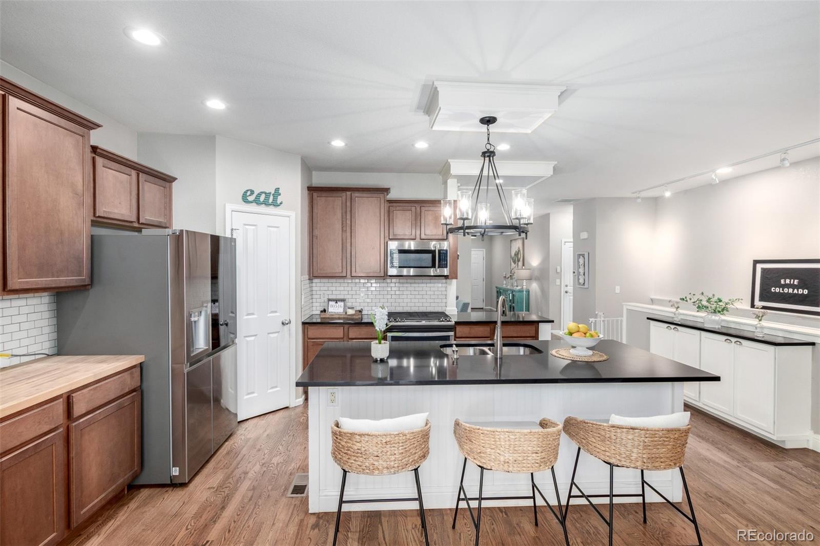 Take advantage of this incredible opportunity! This stunning 3-bedroom residence welcomes you with a 2-car garage, a manicured front lawn, and a front porch that sets an inviting atmosphere. Inside, you're welcomed by an office space, perfect for increasing productivity in the comfort of your home. The formal dining room is ideal for hosting memorable dinner gatherings. Create lasting memories in the living room, complete with high ceilings, contemporary track lighting, blinds, wood-look flooring, and a cozy fireplace. The gourmet kitchen comes with granite counters, ample wood cabinetry with crown moulding, a tile backsplash, stainless steel appliances, a pantry, and an island with a breakfast bar for casual meals. The main bedroom includes an ensuite with double sinks and a walk-in closet for an organized wardrobe. You'll be delighted by the finished basement, featuring a family room with a wet bar, an extra bedroom, a shower, and storage space. Outside, the lovely backyard boasts a two-level deck for weekend get-togethers and plenty of mature trees for privacy and natural shade. Close to schools, Erie Rec Center & Parks, and Old Town. Don't miss your chance to own this gem!