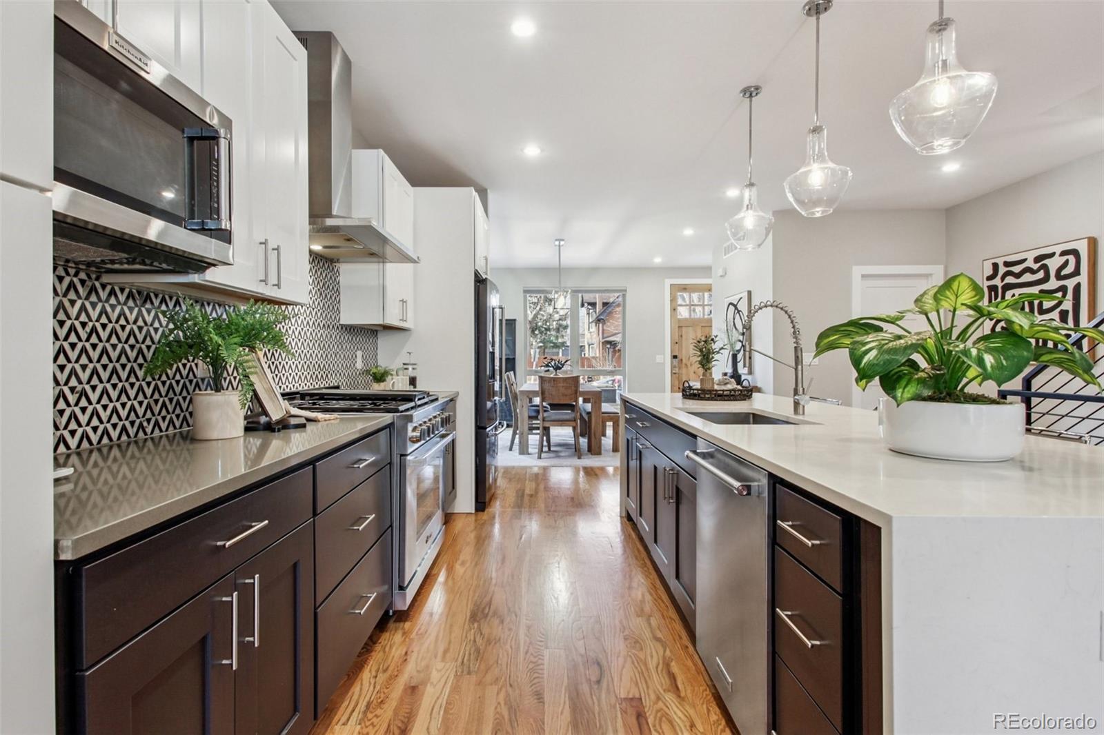 Located in the heart of Denver’s prestigious Berkeley Park neighborhood, just one block off Tennyson Street and some of the best restaurants, coffee shops and boutique stores in Denver, 4132 Stuart Street is a mountain-contemporary duplex that blends modern luxury with an active urban lifestyle. Built in 2016, this 3,350-square-foot residence is characterized by a striking exterior of cedar, rock, and stucco that gives way to a bright and warm interior immediately upon entry. The home’s layout is thoughtfully designed across three levels, plus a finished basement, offering 4 spacious bedrooms and 5 bathrooms and 3 outdoor spaces. The main level serves as the home's social hub, featuring an open floor plan with high ceilings, beautiful wood floors, floating stairs to the bedroom level, and an updated kitchen (May 2023 updated backsplash and refreshed cabinets). Double sliding doors off the large great room, which features a floor to ceiling stone fireplace, lead directly to a private, professionally landscaped backyard that underwent a $45,000 renovation in 2021. This one-of-a-kind "outdoor living room" features an Eldorado Infinite Fire Bowl, making it a perfect setting for year-round entertaining under the Colorado sky. For more private retreats, the upper floors offer specialized spaces, including a primary suite with its own west-facing balcony and walk-in closet. The versatile third level functions as a bonus room or home office, complete with a wet bar, wine fridge, a second gas fireplace, and an additional outdoor patio rooftop deck. Additional modern conveniences include a tankless water heater, a smart thermostat, and an integrated sound system, as well as an oversized, detached two-car garage for secure parking and storage.