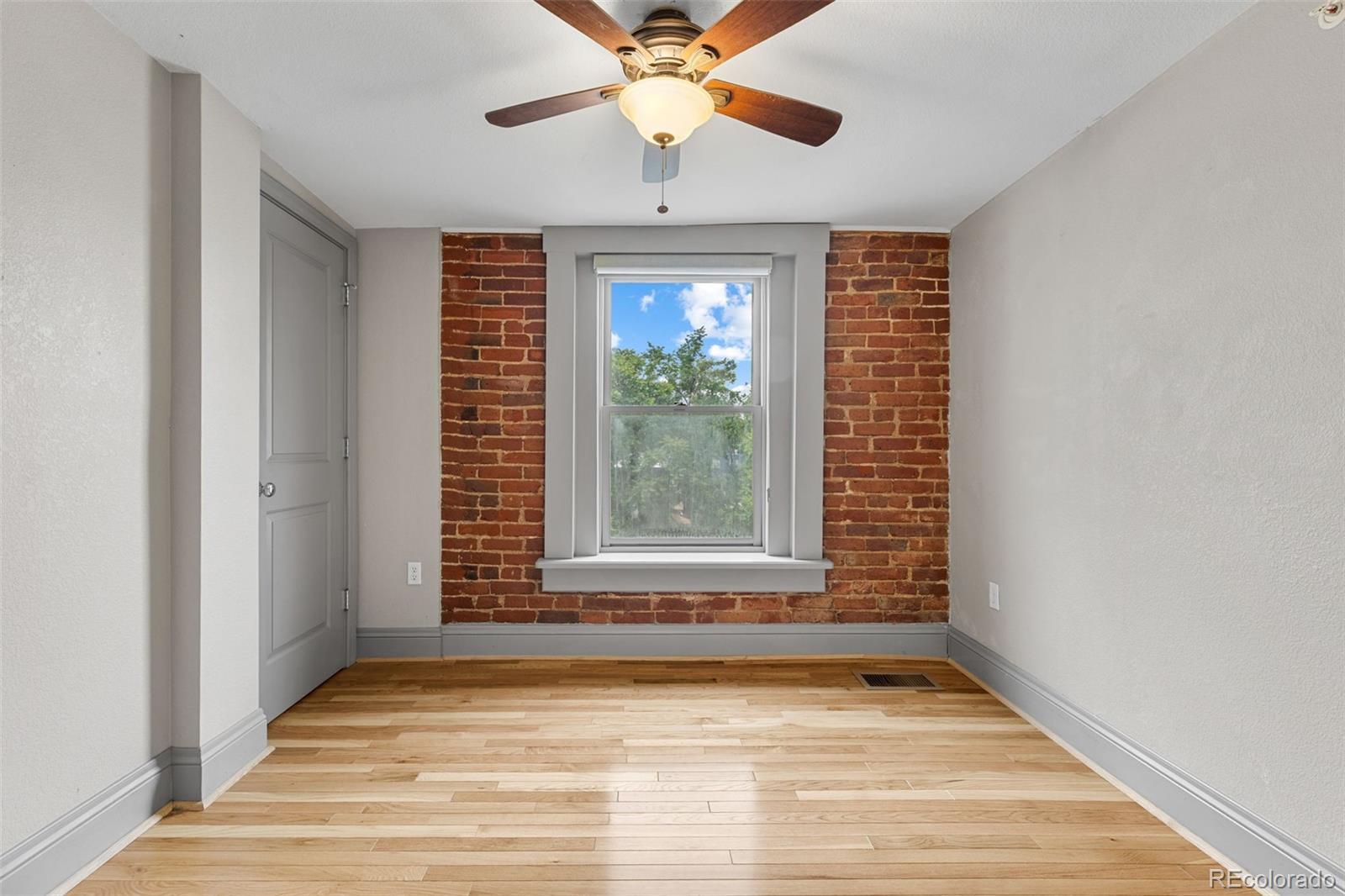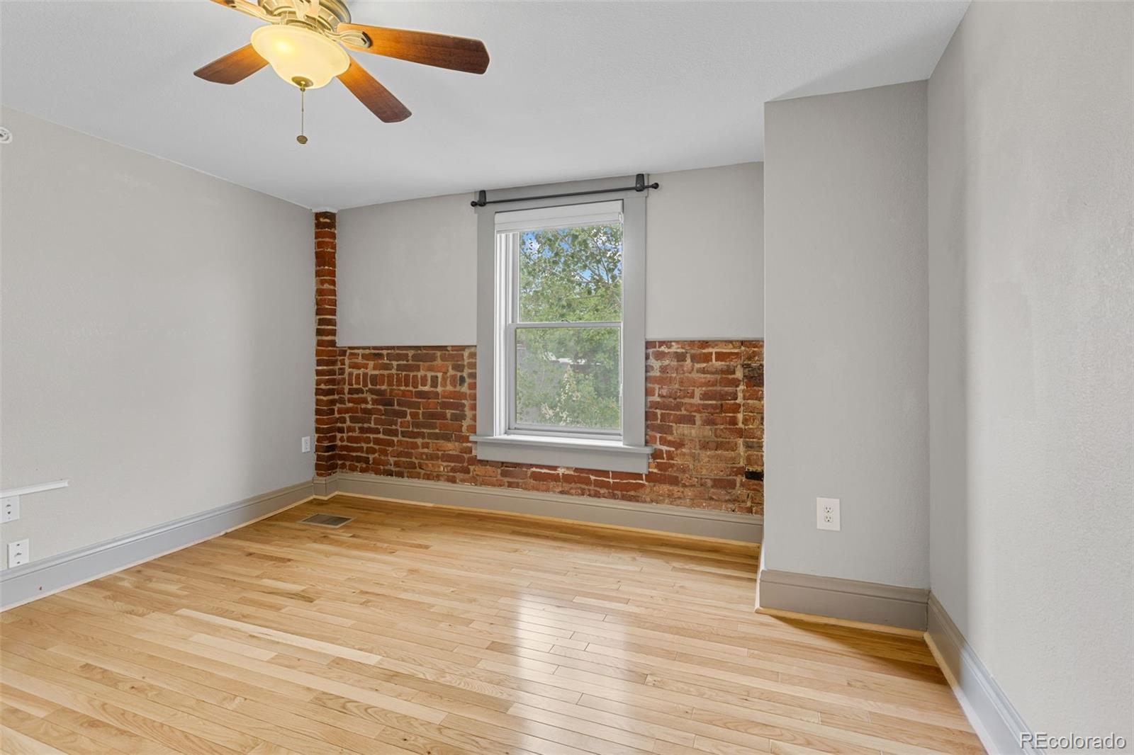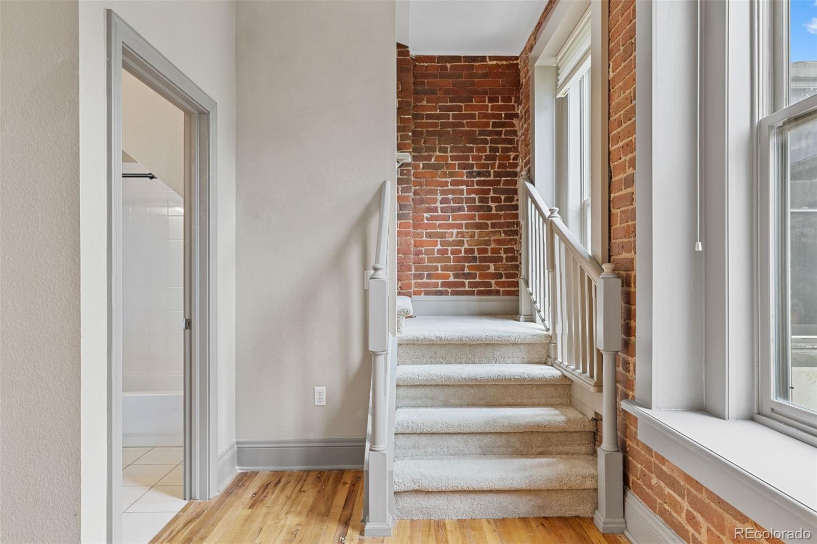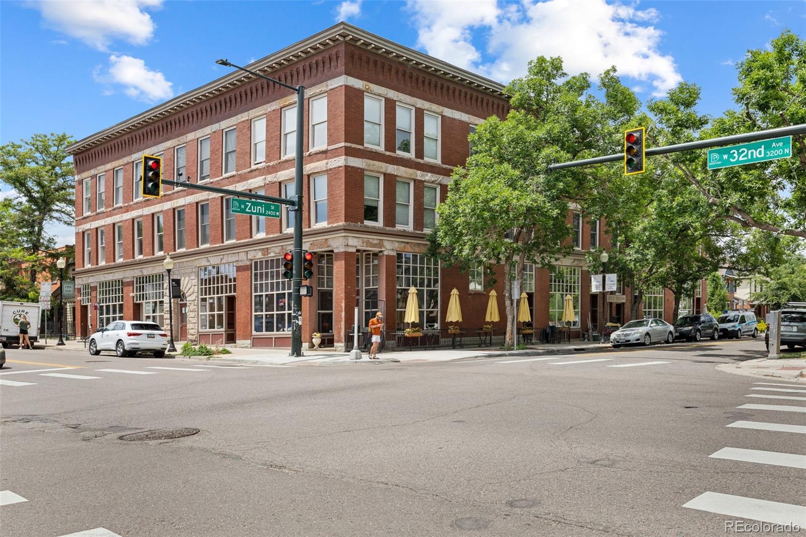 Right in the heart of it all! For those who want to be able to walk or bike to their favorite coffee shop, to catch the train, to the market, this one is for you! Inside the historic Weir Building, situated right on the corner of 32nd and Zuni, you'll enter at the sidewalk level and head up the stairs to this unit. One inside, you'll notice the grand ceilings and massive windows that let in tons of natural light. This unit overlooks the garden area, so windows open at night allow you to enjoy the Denver crisp evenings without the street noise. The kitchen with bar-top seating and concrete counters is situated to be able to enjoy guests while prepping snacks, and a full bath on the main level means you don't have to share all of your beauty secrets with your guests. Upstairs you'll find newer hardwood floors throughout both bedrooms and the hallway. A laundry closet with a newer, stacking laundry system is included and fits the space perfectly. The secondary bedroom has a sizeable closet that can be set-up with shelving or multiple hanging levels. The main bedroom is at the end of the hall, separated from the second bedroom by the completely updated bathroom with glass shower. *While there is no dedicated parking, there is often street parking available, and both surface lot and garage spot monthly rentals were available within a 6-minute walk (per Google Maps) as of Oct. 6th, between $90/mo and $174/mo.*