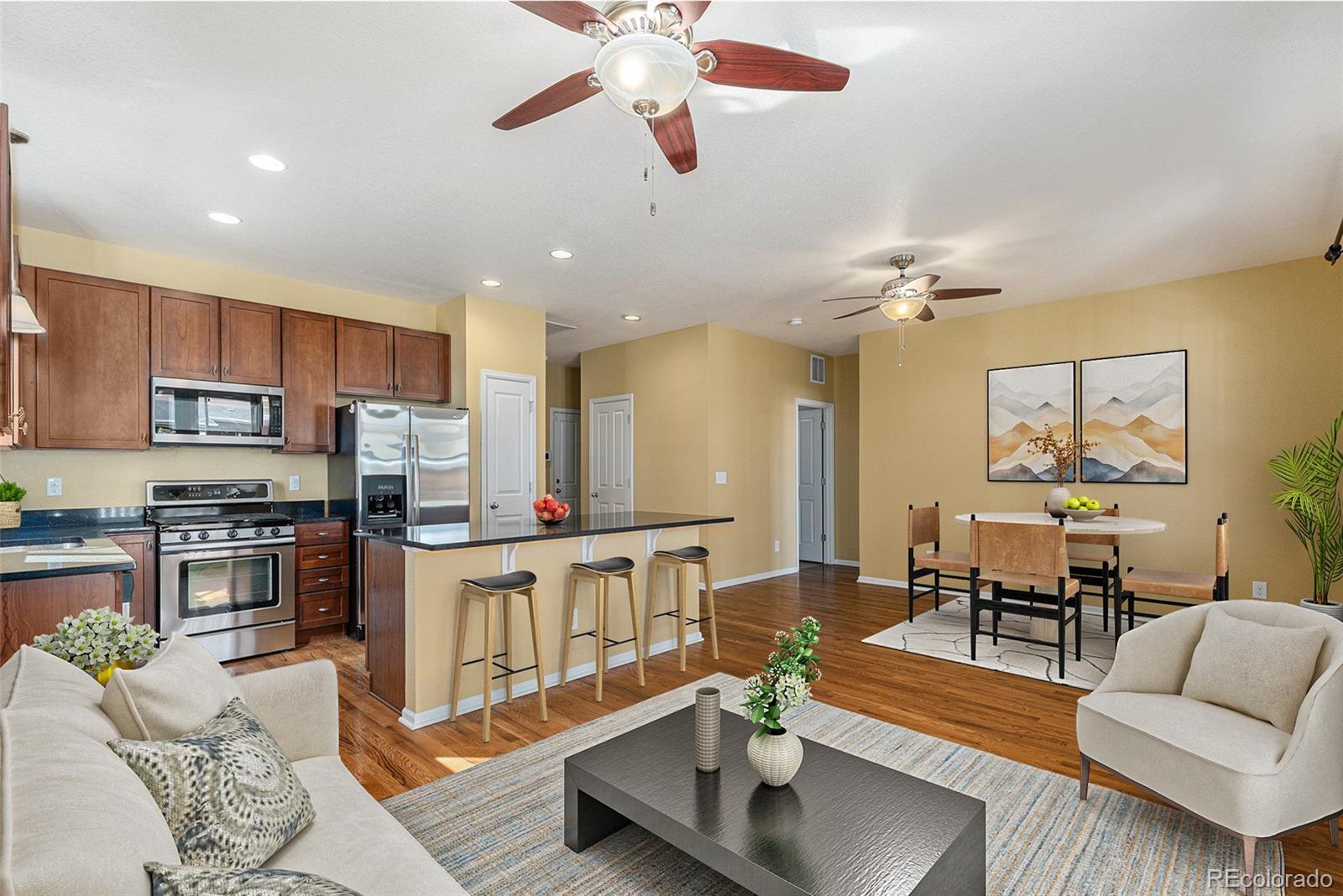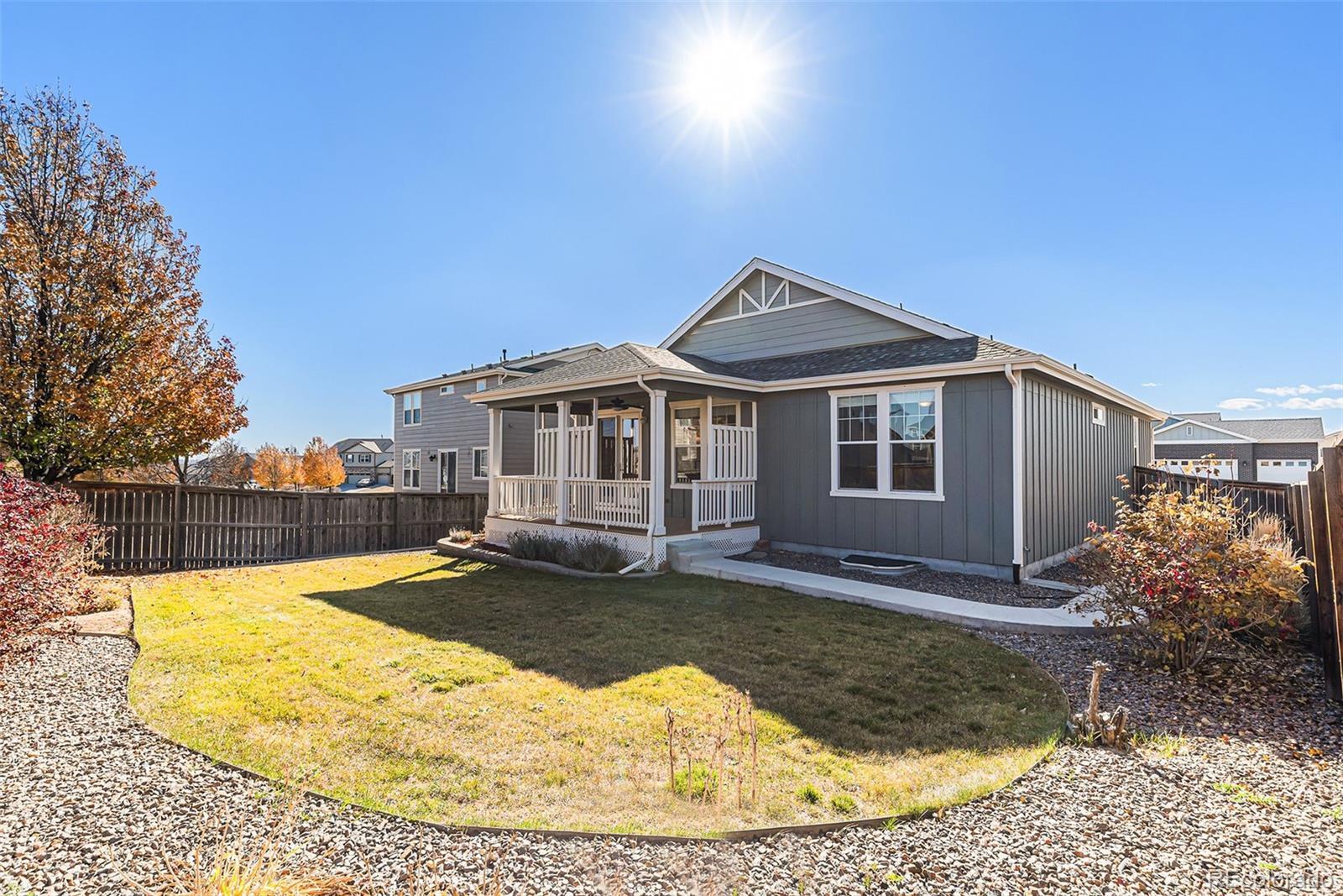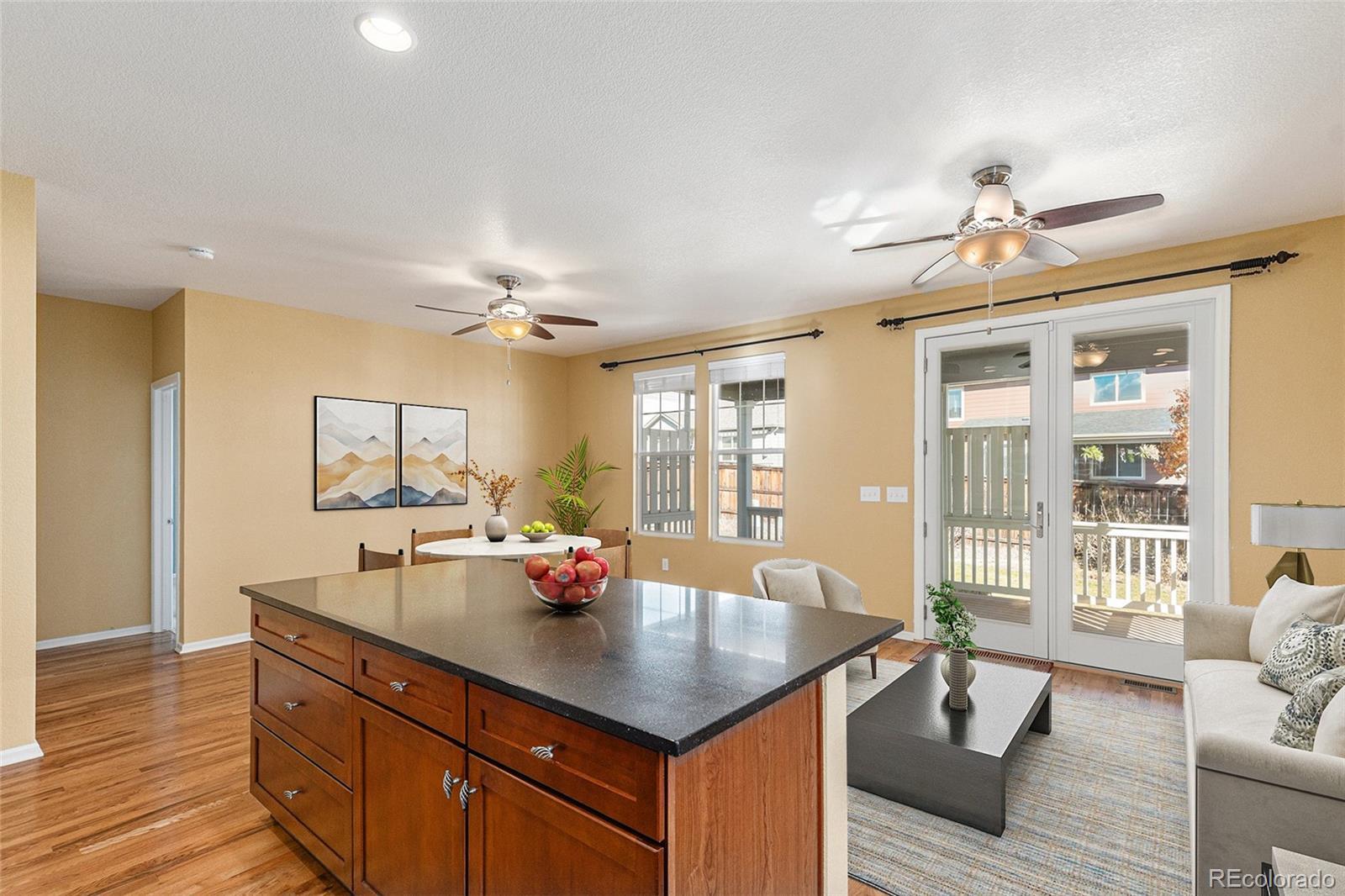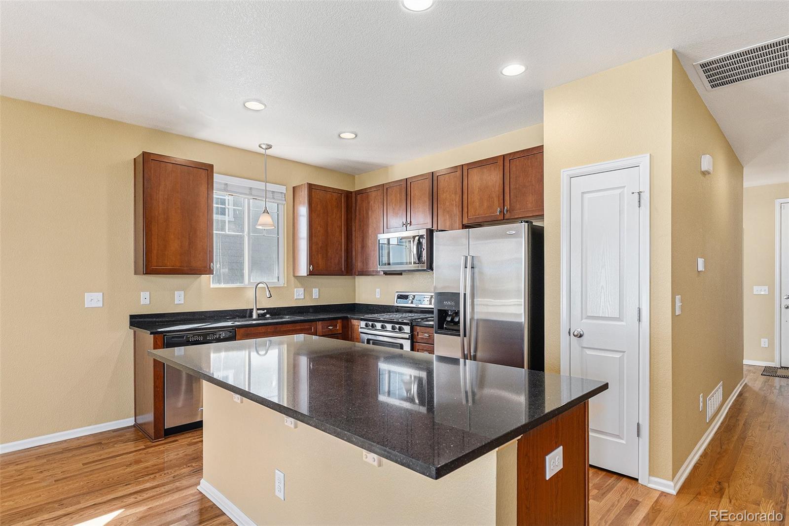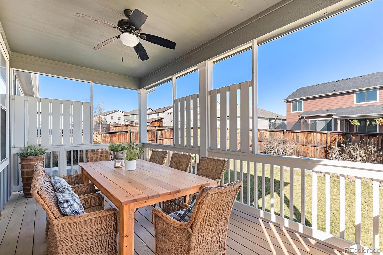 This move-in ready home offers comfort, style, and convenience in every direction. The spacious kitchen stands at the center, featuring granite counters, stainless steel appliances, and a welcoming eat-in area—perfect for daily meals or casual gatherings. Hardwood floors flow throughout the main level, complemented by airy 9' ceilings that enhance the sense of openness. Outside, enjoy a covered deck overlooking a beautifully landscaped yard—ideal for relaxing or entertaining in any season. A full unfinished basement provides endless opportunities, home office, gym, or extra living space, giving you room to grow. Located in a quiet, well-kept neighborhood, this home also offers quick access to DIA and is just minutes from shopping, making everyday living incredibly convenient. A wonderful blend of comfort and practicality awaits.