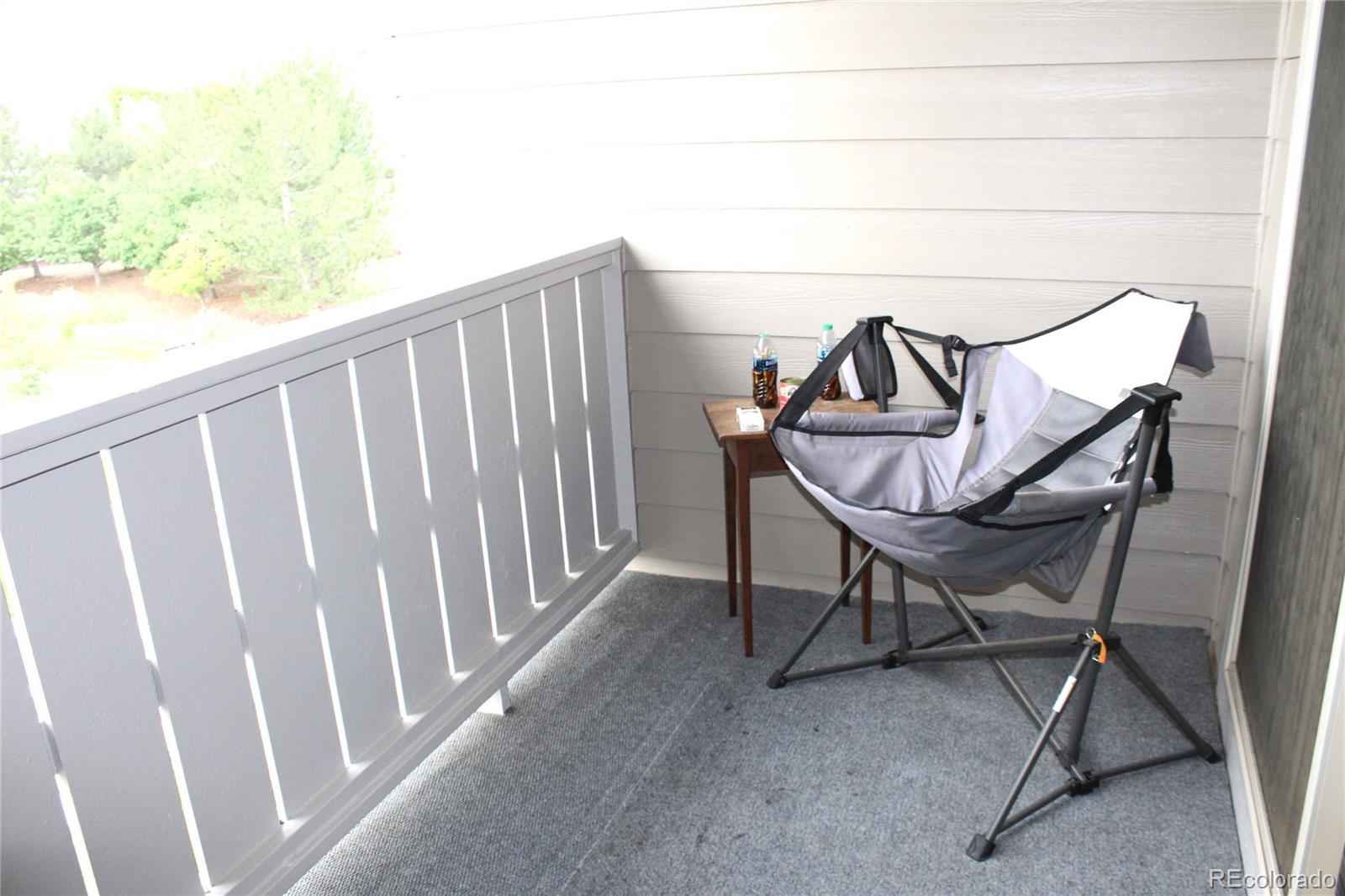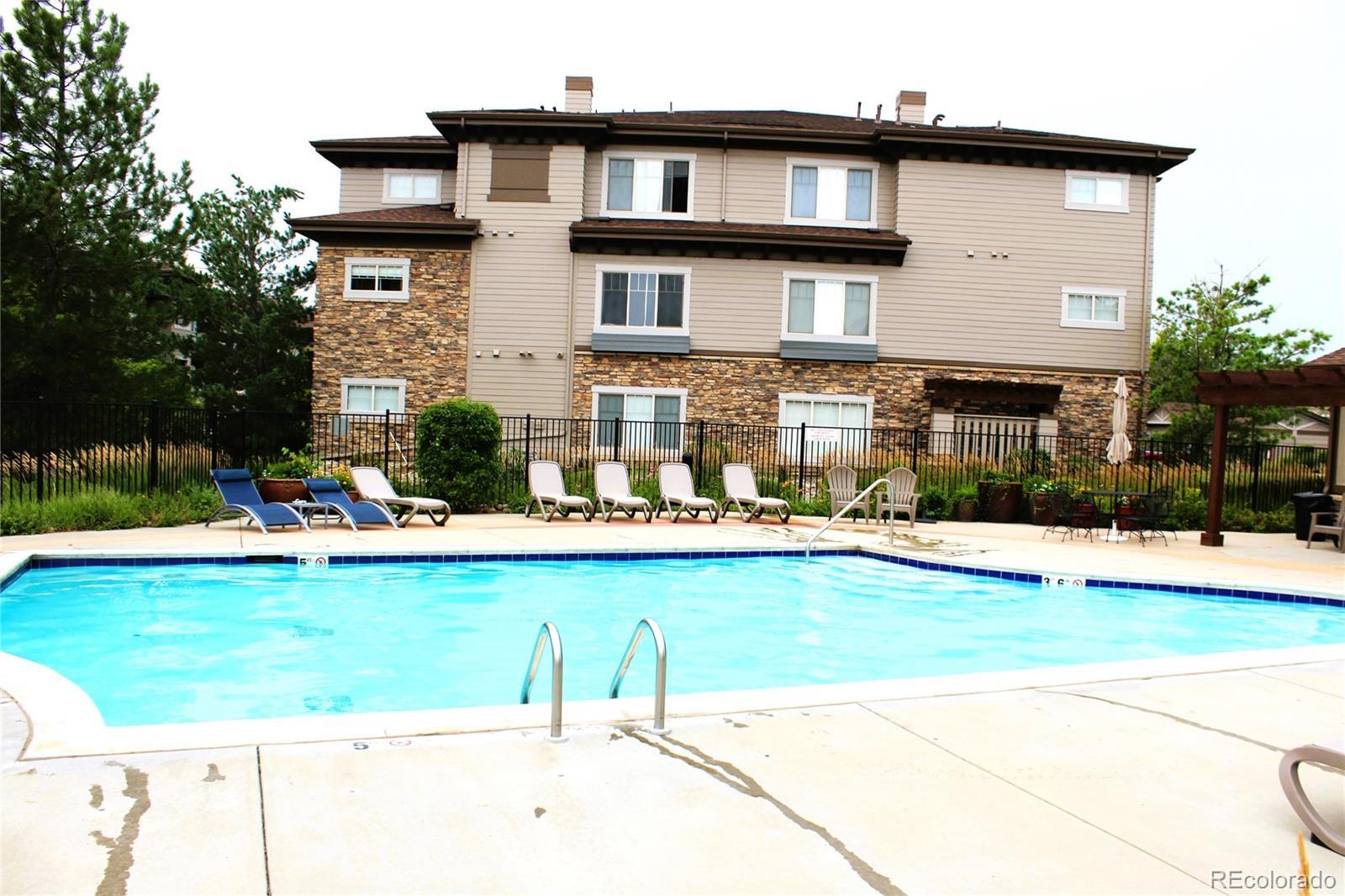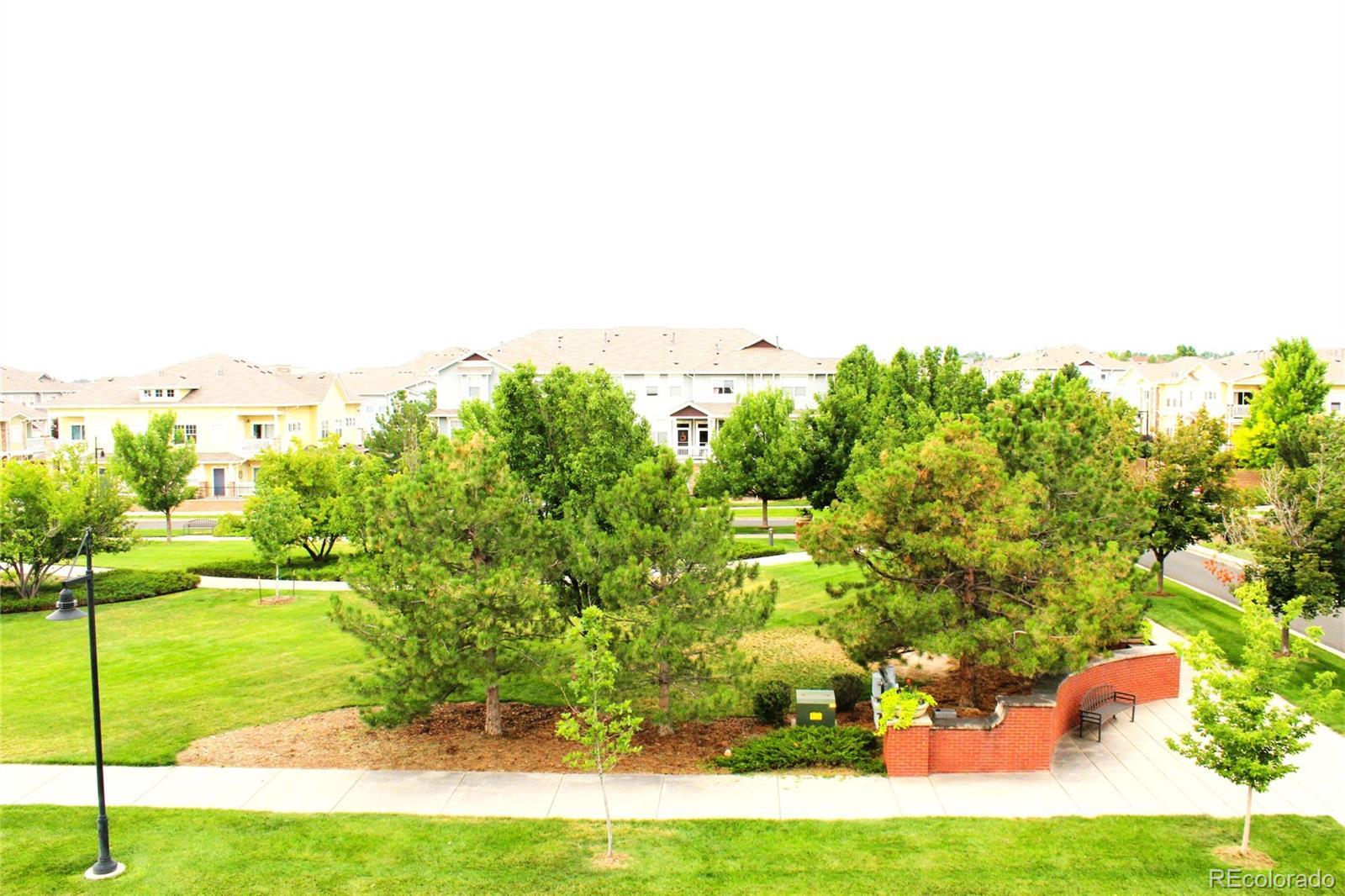 Spacious 2 bedroom, 2 bathroom penthouse level condo unit in a great community! Excellent location with ample winter sun and light offering a superior south facing view of the Stonegate Guell Park area. Open floor plan featuring an outstanding kitchen with 42" hardwood cabinets, sliding shelf organizers, center island offering an extended counter top for breakfast nook, ample counter space for those gourmet cooks, tile backsplash, all black Maytag appliances including refrigerator, dishwasher, microwave and stove. Extra space with pantry closet shelving. The large dining area will be great for family get togethers, adjacent to the kitchen and also has a built-in desk for convenience. Large double coat closet for additional storage. The living room features a ceiling fan, an electric fireplace and south facing balcony for ample sunlight and views. Engineered hardwood flooring through the main level with carpeting in both bedrooms. The primary bedroom is a true master suite with an expansive room, large bathroom with double sink vanity, large tile shower with seat and huge walk-in closet. Includes washer and dryer, air conditioning, ceiling fans and fire suppression and alarms with building. One car detached garage with reserve space allowed to park in the immediate driveway. Beautiful private pool and BBQ for Guell Condo residents only. Convenient location close to Jordan and E-470, shopping, Cherry Creek Trails and the town of Parker.