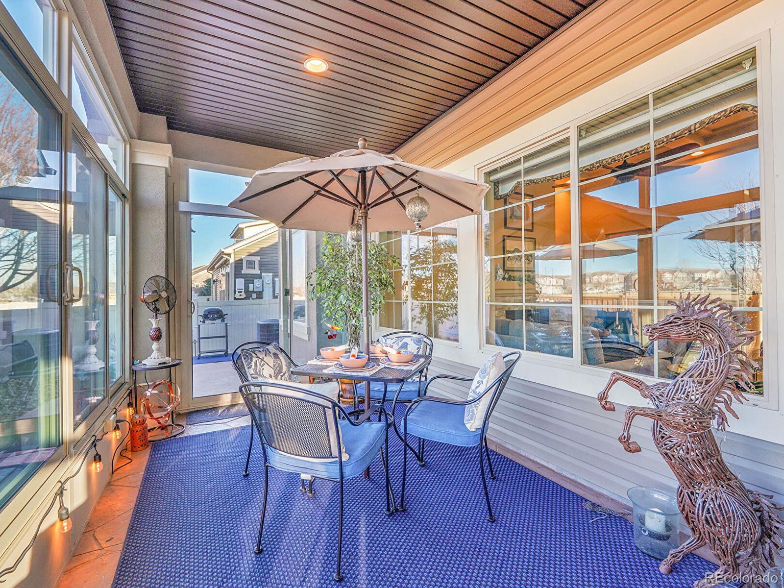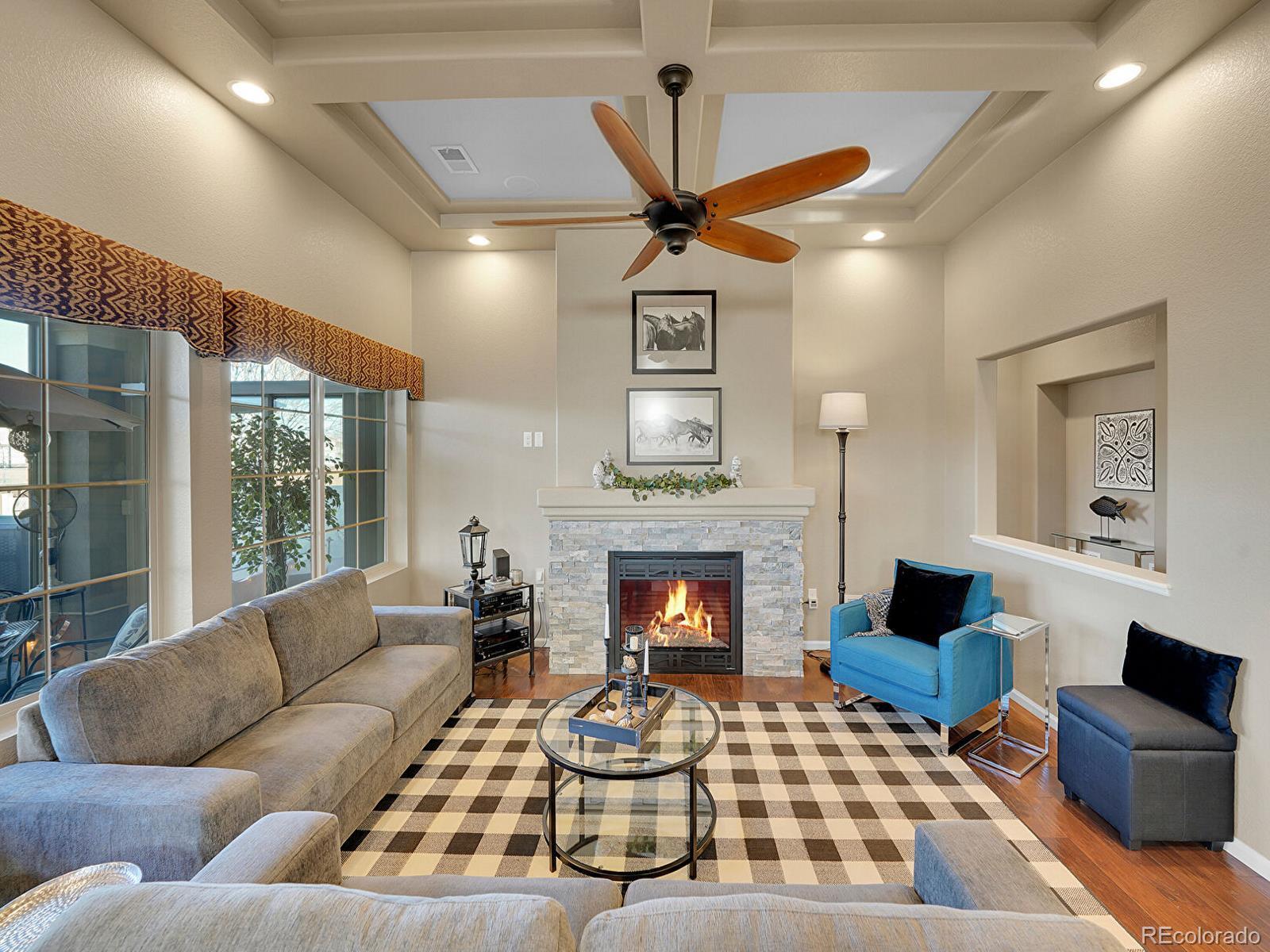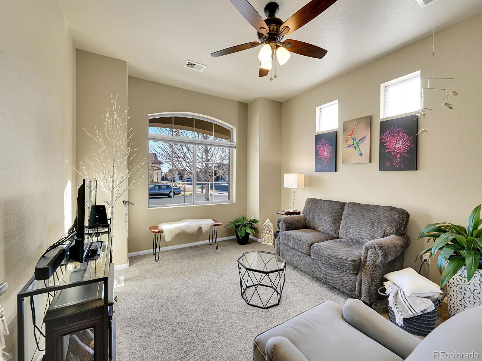 Welcome to 19509 E 55th Ave, a beautifully updated ranch in the desirable Fairway Villas, an active 55+ community in Green Valley Ranch! Positioned on a sunny corner lot with a maintenance-free exterior and xeriscaped landscaping, this home offers low-maintenance living with outstanding upgrades throughout. Inside, over 2,800 finished square feet unfold across a bright, open main level with stunning engineered hardwood floors and thoughtful architectural details. The inviting open living room is anchored by a stacked stone gas fireplace and elegant coffered ceiling, and flows seamlessly into the dining area which connects an oversized kitchen island with a sprawling sunroom to create an entertainer’s paradise. The hallmark of this home’s open floorplan, the gourmet kitchen features granite countertops, upgraded cabinetry, pantry storage, stainless steel appliances, double ovens, and a 5-burner gas cooktop for the most seasoned chef. The primary suite is a relaxing retreat with tray ceilings, a spacious walk-in closet, and a spa-inspired bath with dual sinks and a large walk-in glass shower with bench seating. A second main-level bedroom and full bath with soaking tub are perfect for guests, while a spacious foyer and outstanding office create character. Convenient main-level laundry room with storage and utility sink, perfect for single-level living. Upstairs, the expansive loft with half-bath provides flexible space for an additional bedroom suite PLUS an additional living space! Enjoy year-round comfort in the glass-enclosed sunroom filled with natural light and peek-a-boo mountain views, or step outside to the tiered patio with a tranquil water feature and fully fenced yard. Attached two-car garage! Residents of Fairway Villas enjoy access to a private clubhouse with a pool, fitness center, library, coffee bar, and more, just minutes from walking trails and Green Valley Ranch Golf Club. Enjoy low-maintenance Colorado living at its finest.